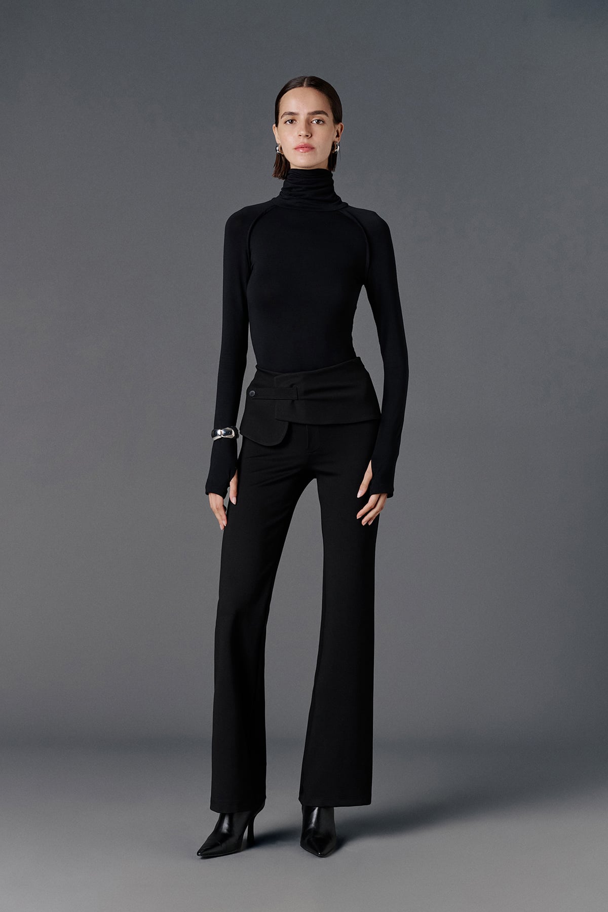 Düşük bel, ispanyol paça, örme kumaş, cepsiz. etek detaylı pantolon.