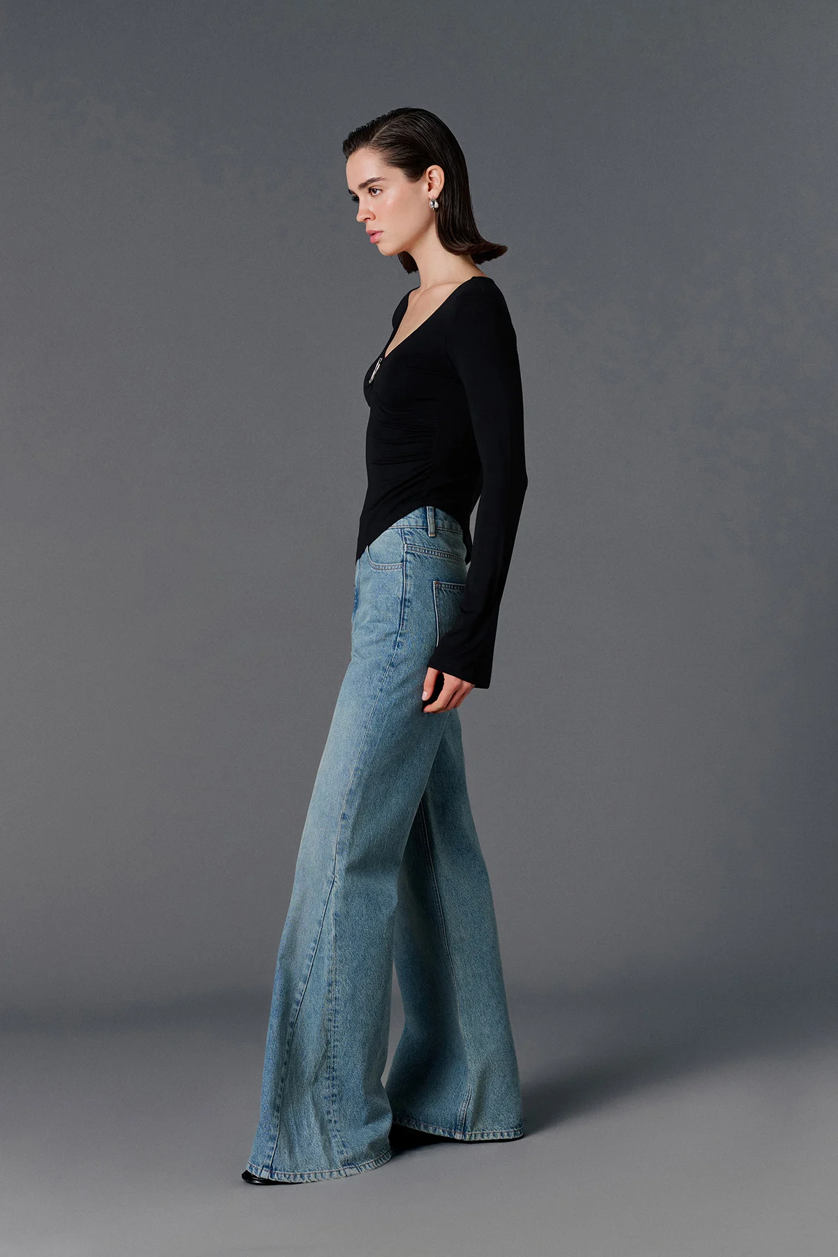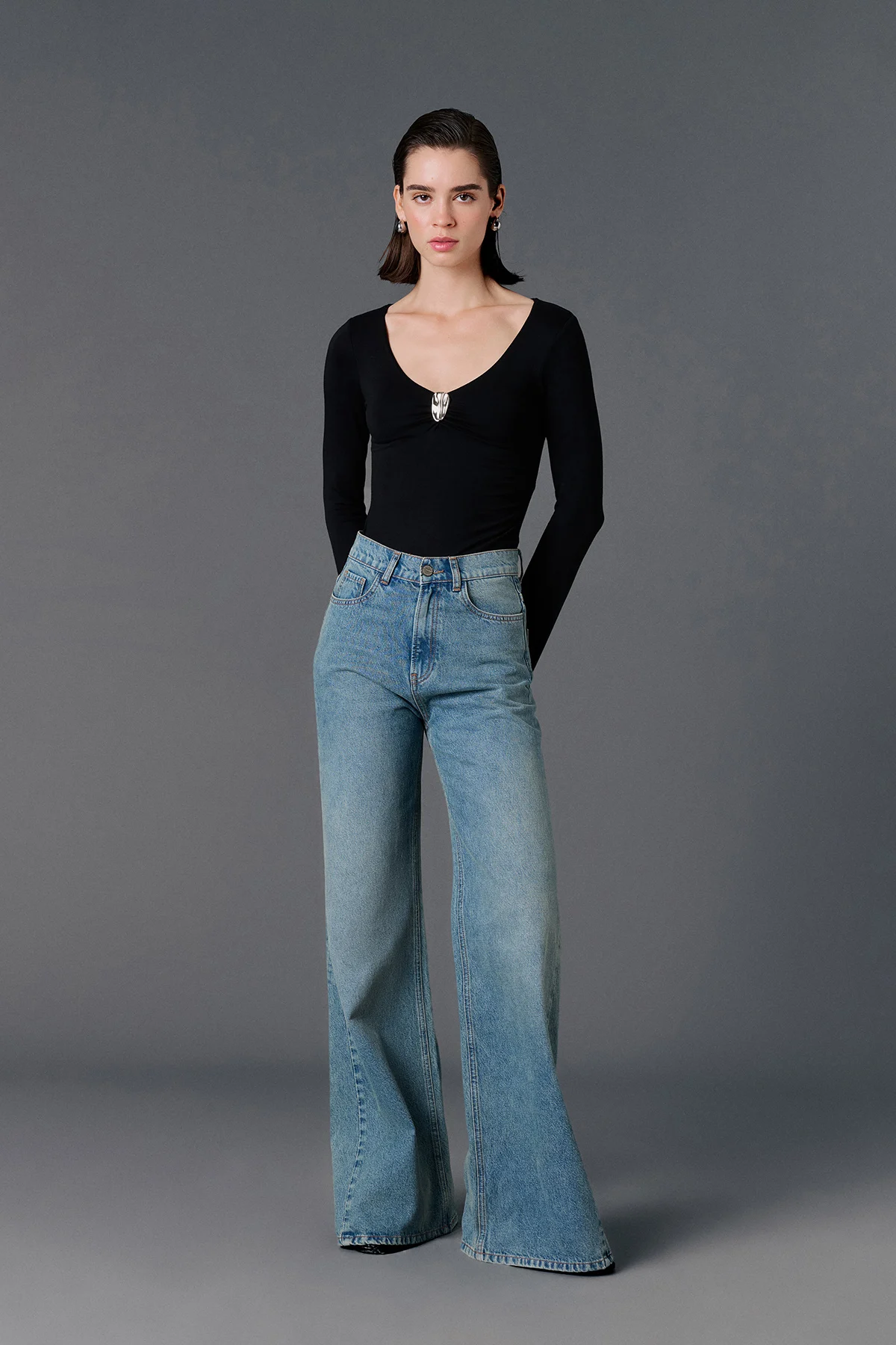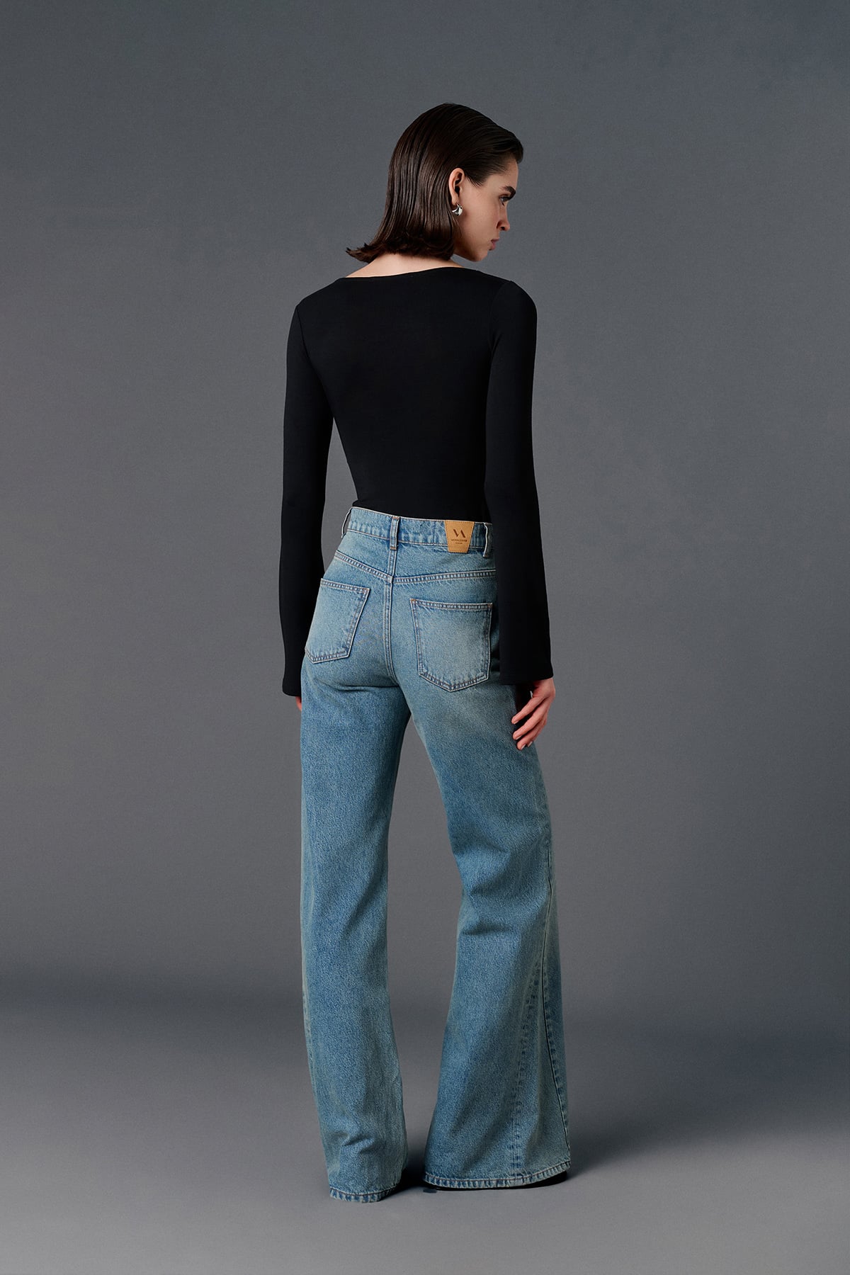 Yüksek bel, ispanyol paça, önü düğme ve fermuar kapamalı, yanlardan kesik detaylı, tam kalıp jean.
