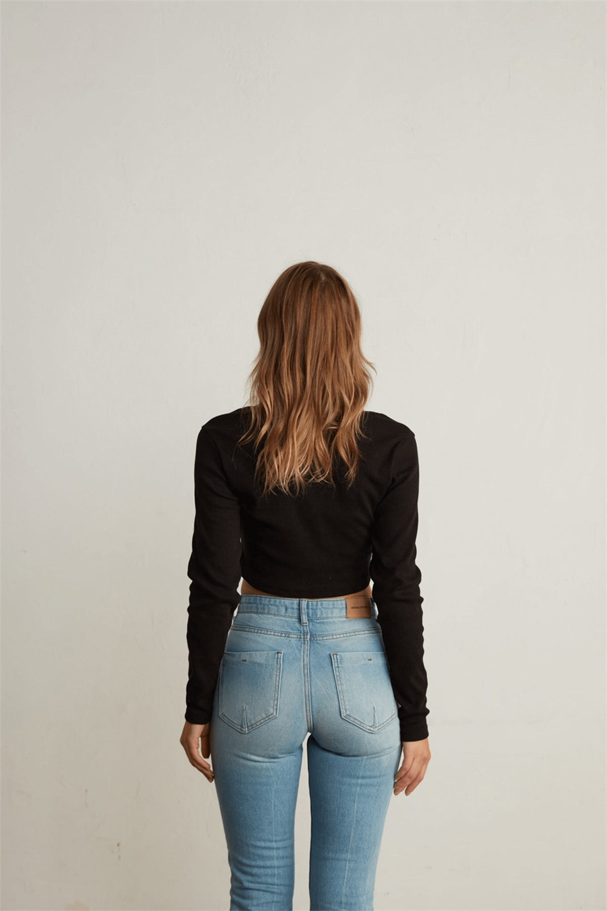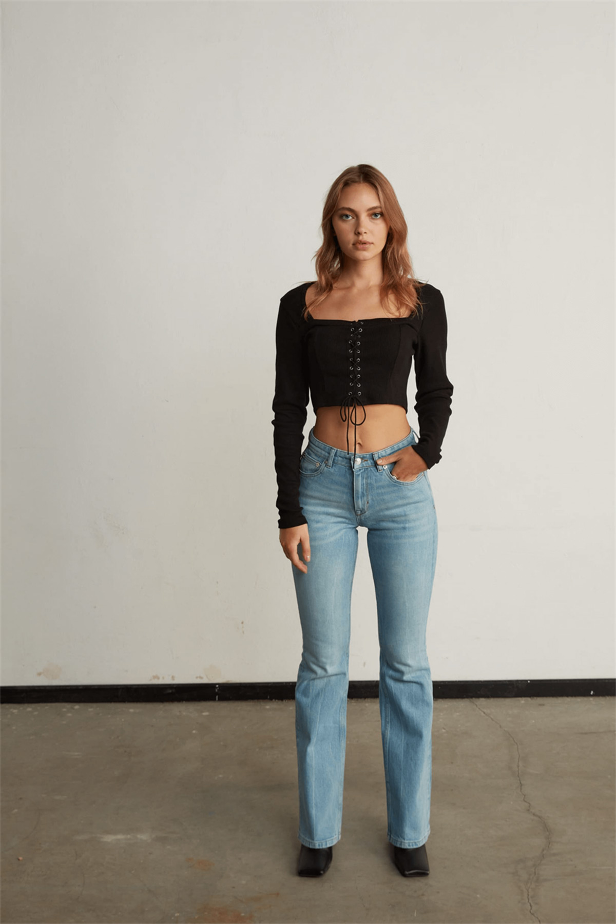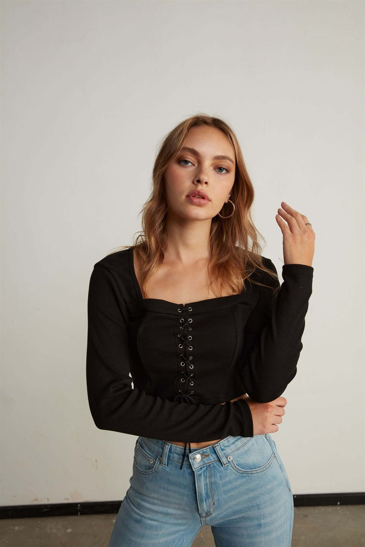 Kare yaka, fitilli, önü korse detaylı ve bağlamalı, uzun kol crop.