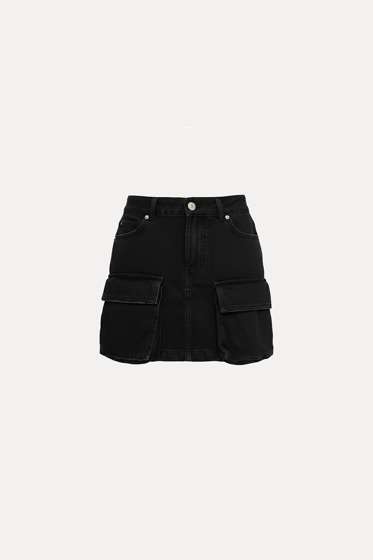 Yüksek bel, düğmeli ve fermuarlı, tam kalıp, kargo cepli, mini denim kargo etek.