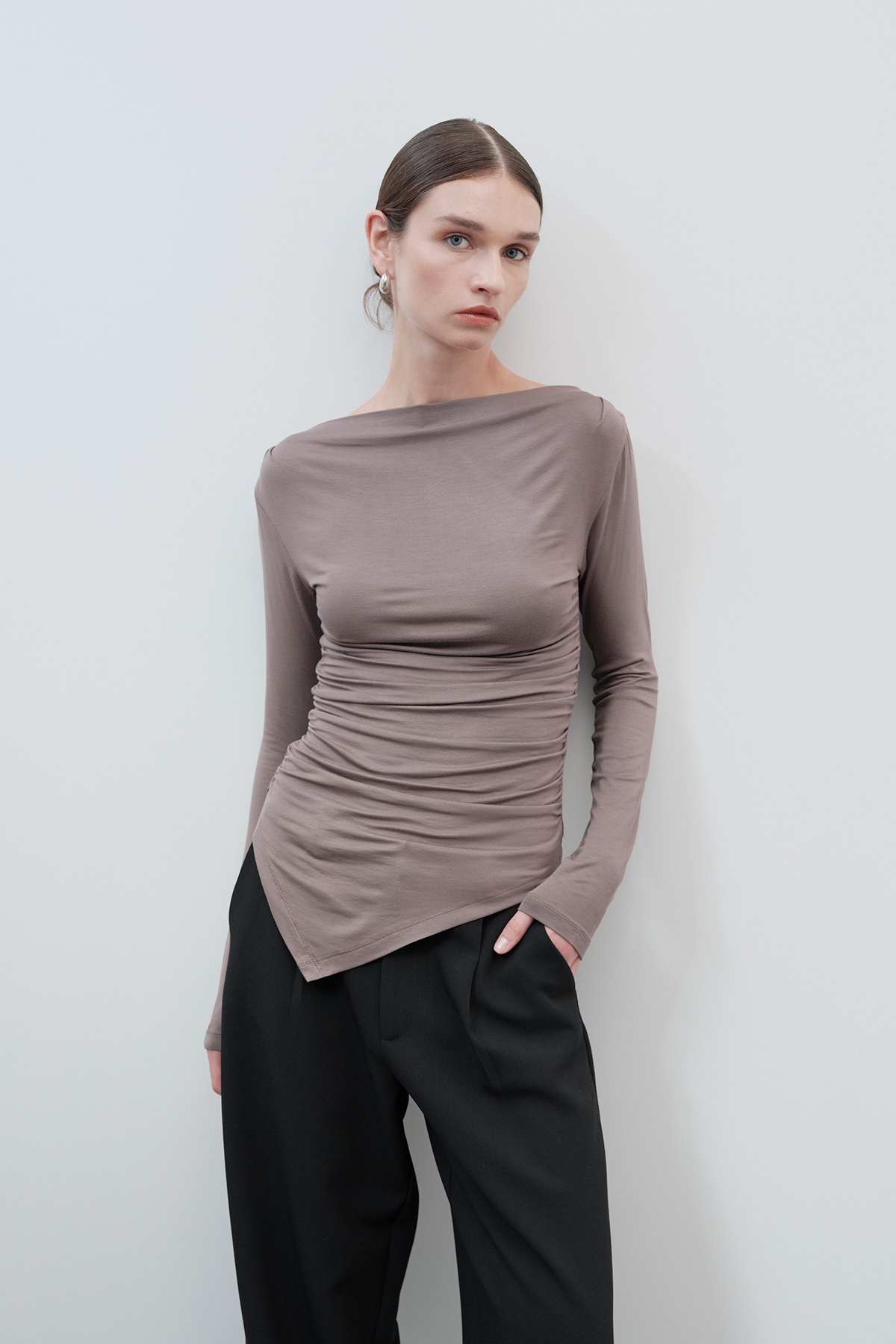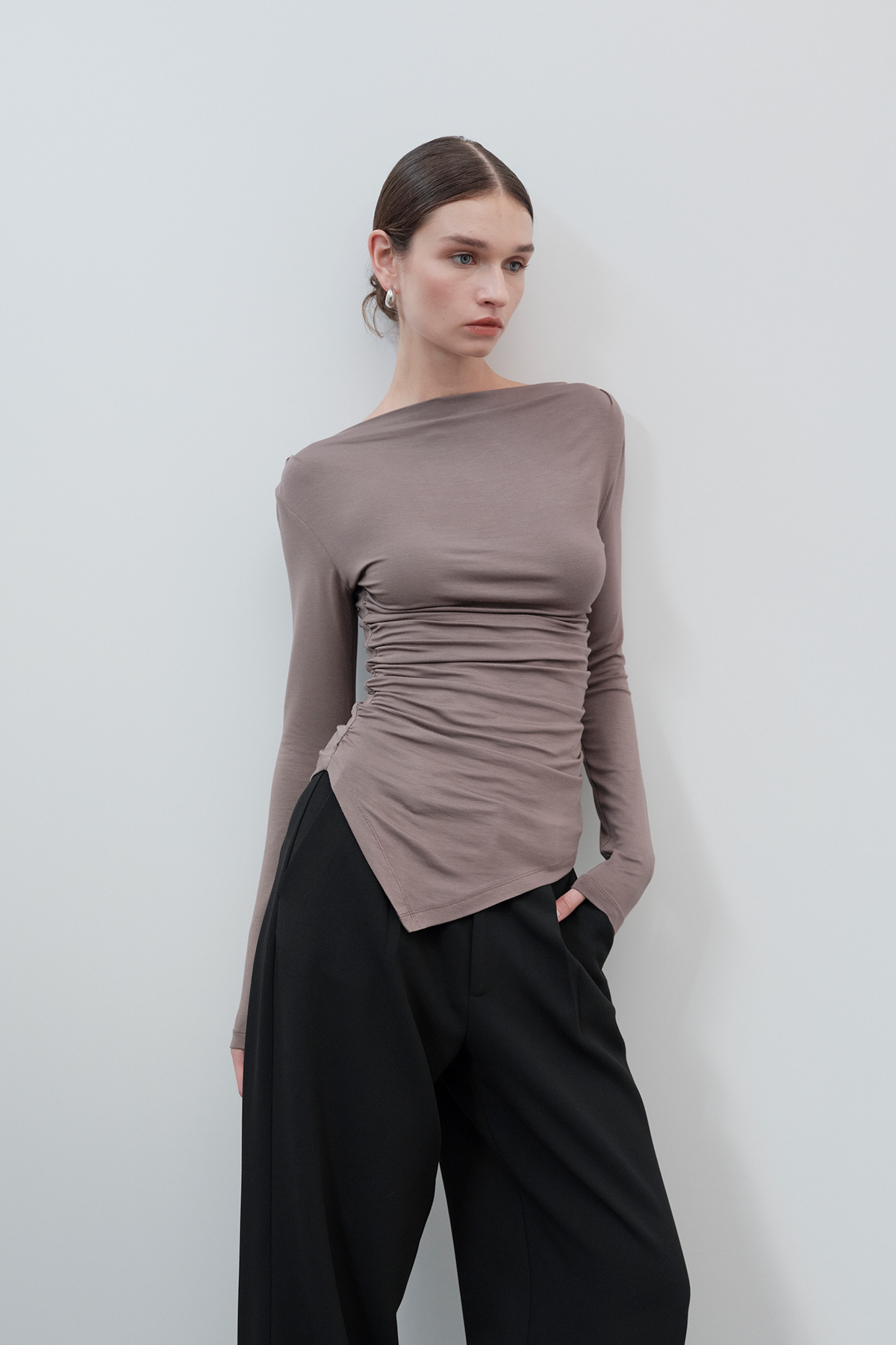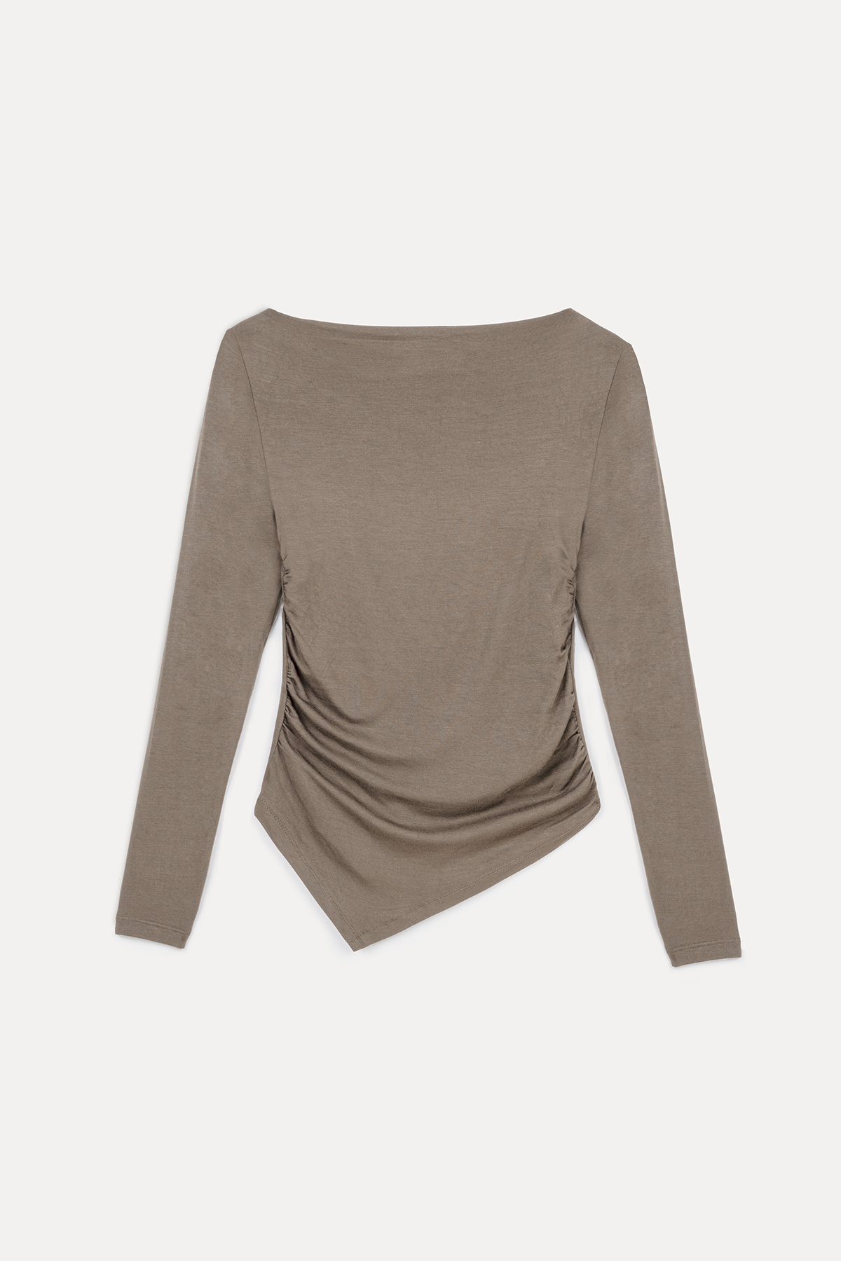 Asimetrik kesim, uzun kollu, astarsız, tam kalıp bluz