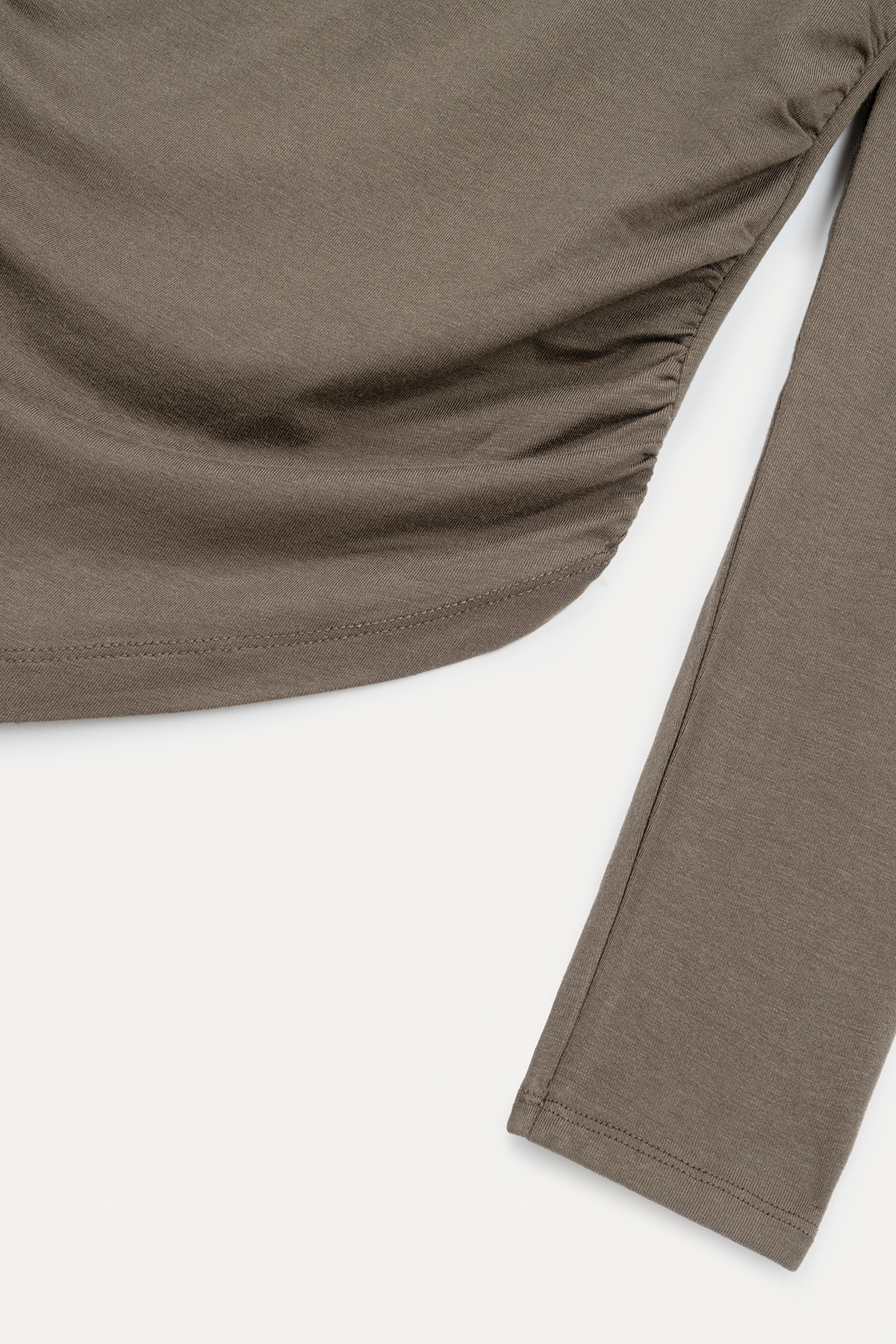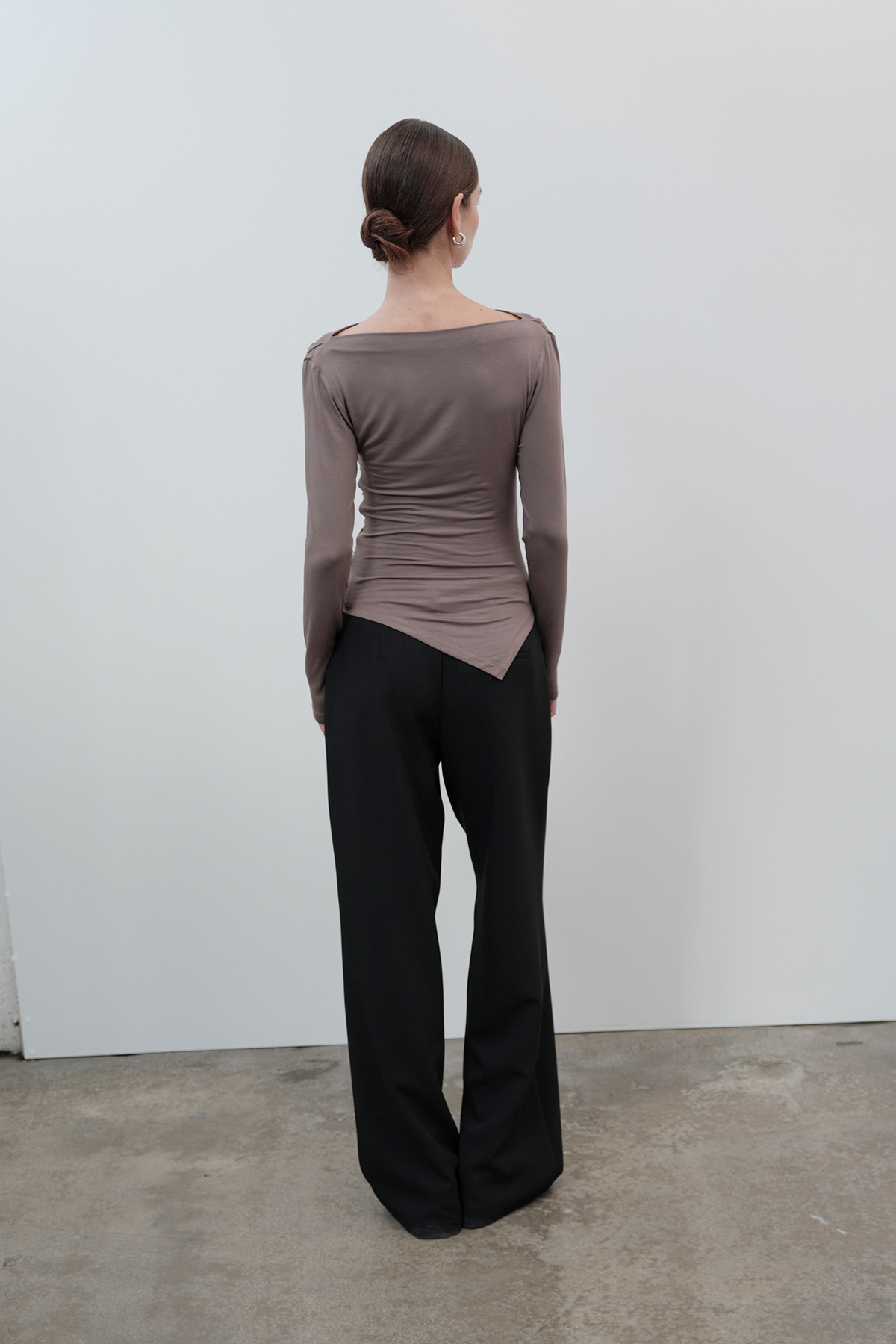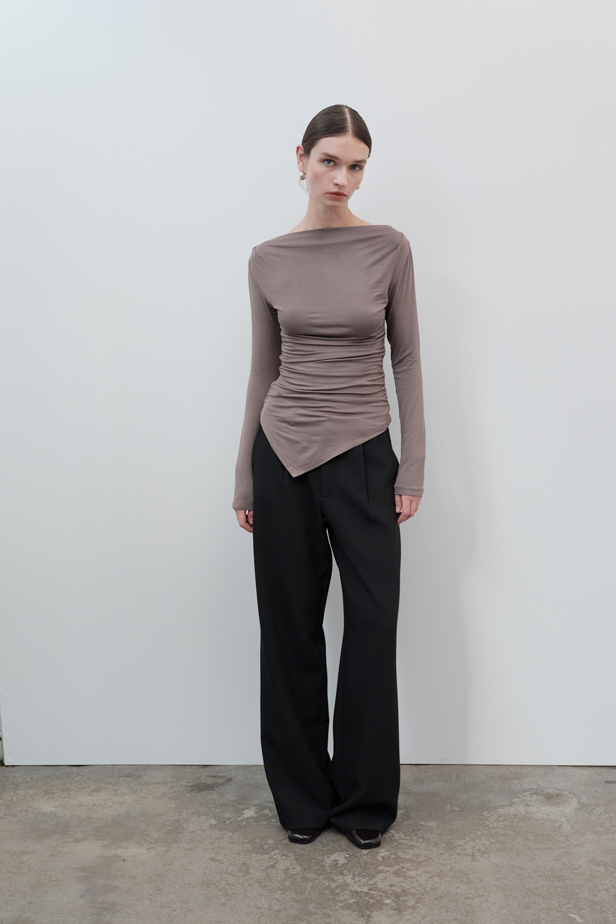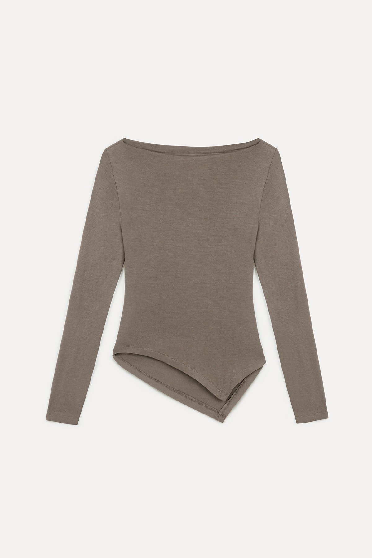 Asimetrik kesim, uzun kollu, astarsız, tam kalıp bluz