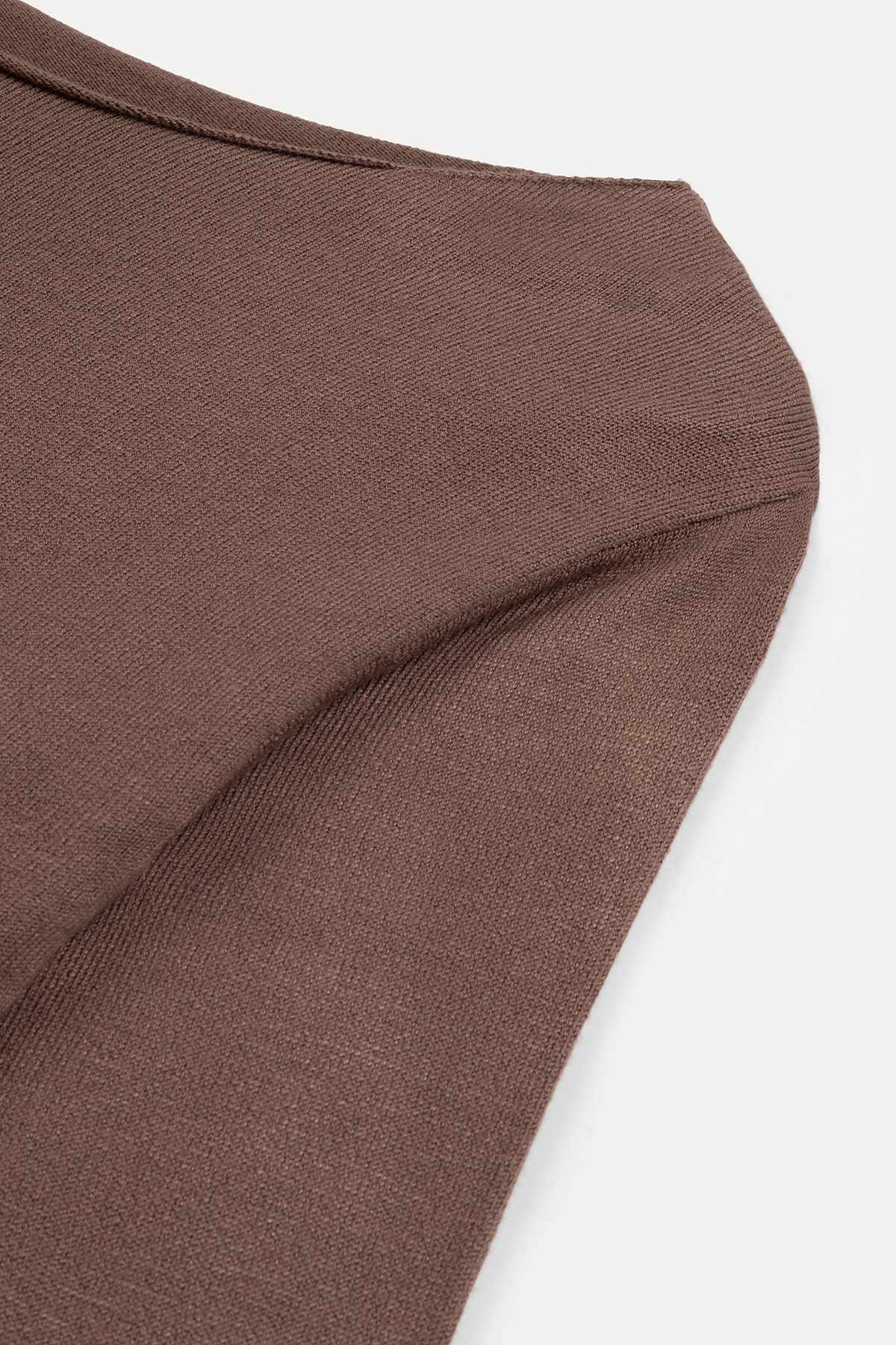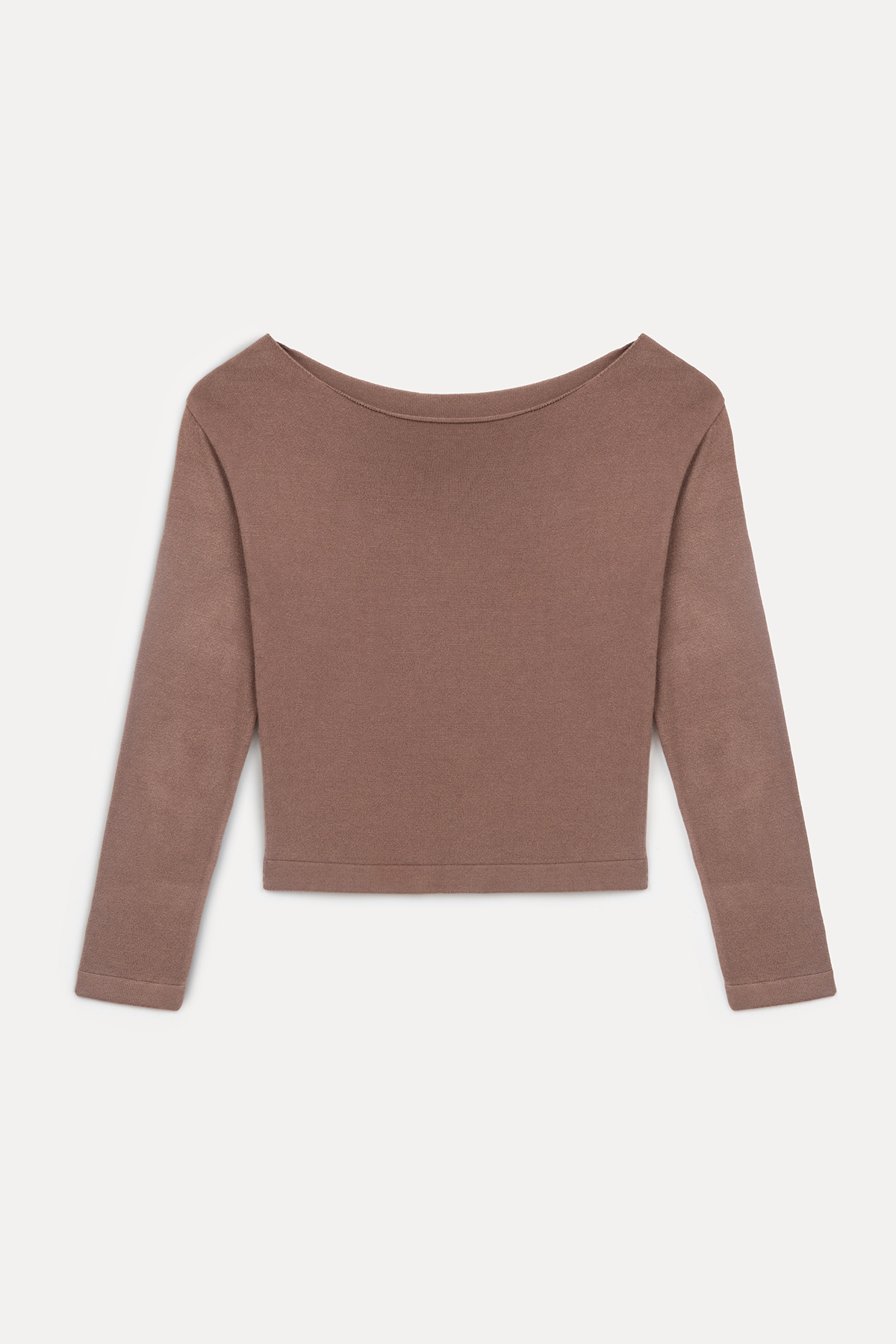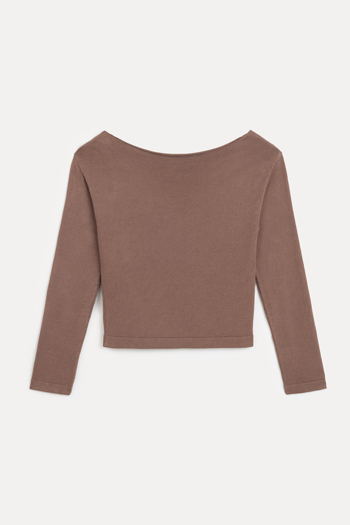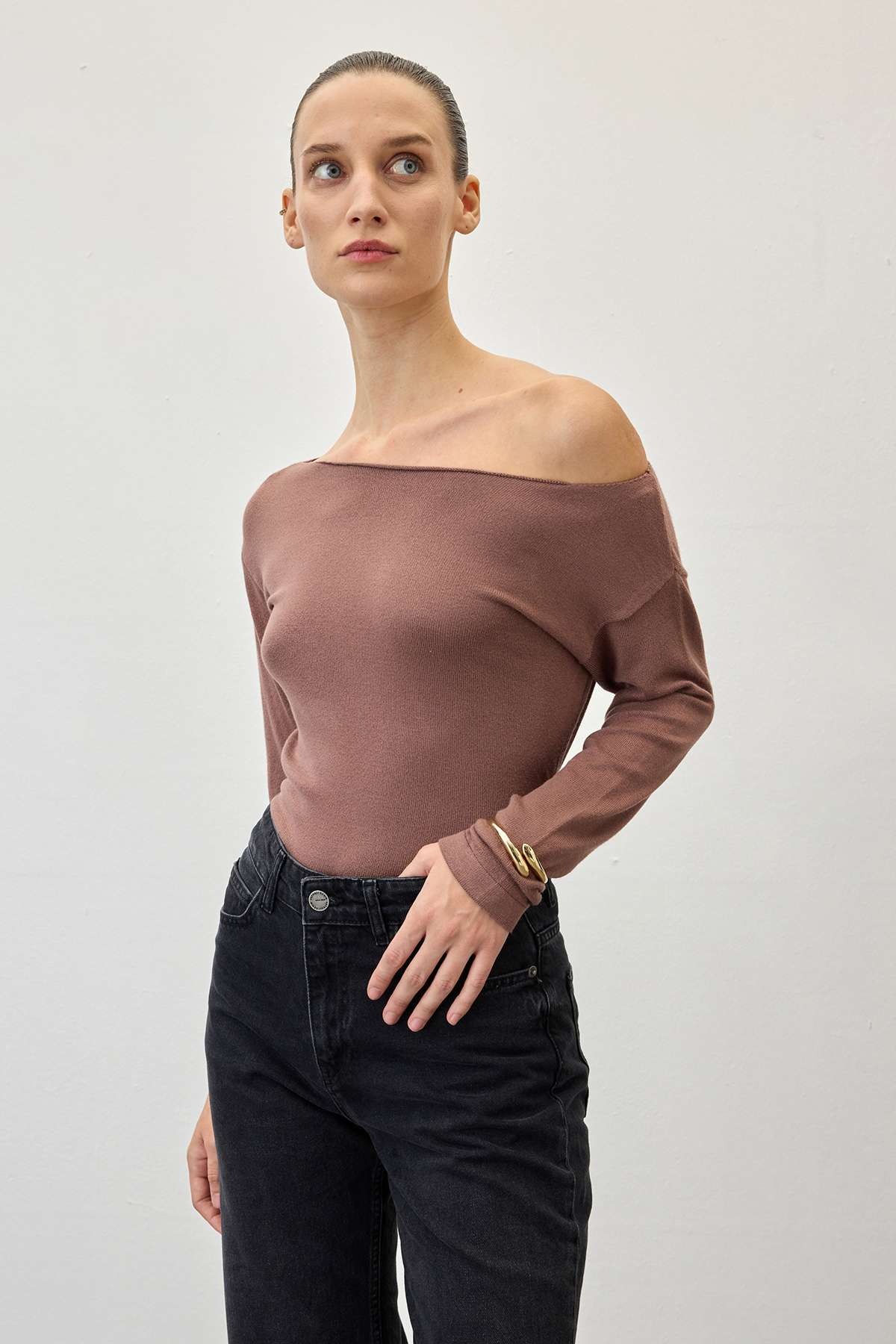 Kayık yaka, uzun kollu, omuzları açık, tam kalıp triko kazak