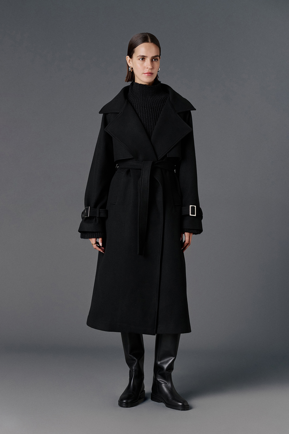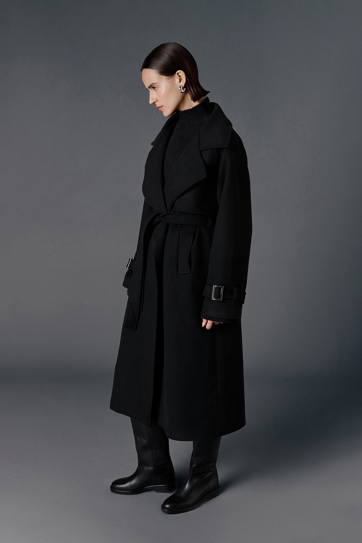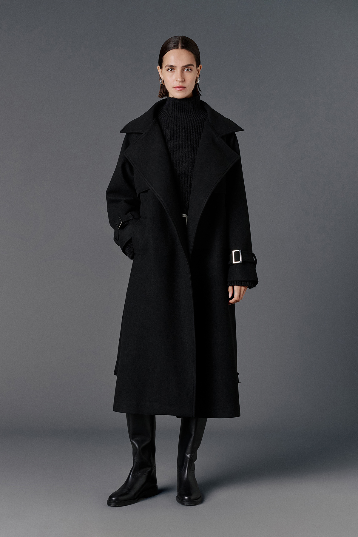 Kruvaze yaka, rüzgarlıklı, astarlı, kuşaklı, yanlardan iki cepli, yün karışımlı, manşeti kemer detaylı, midi boy kaban.