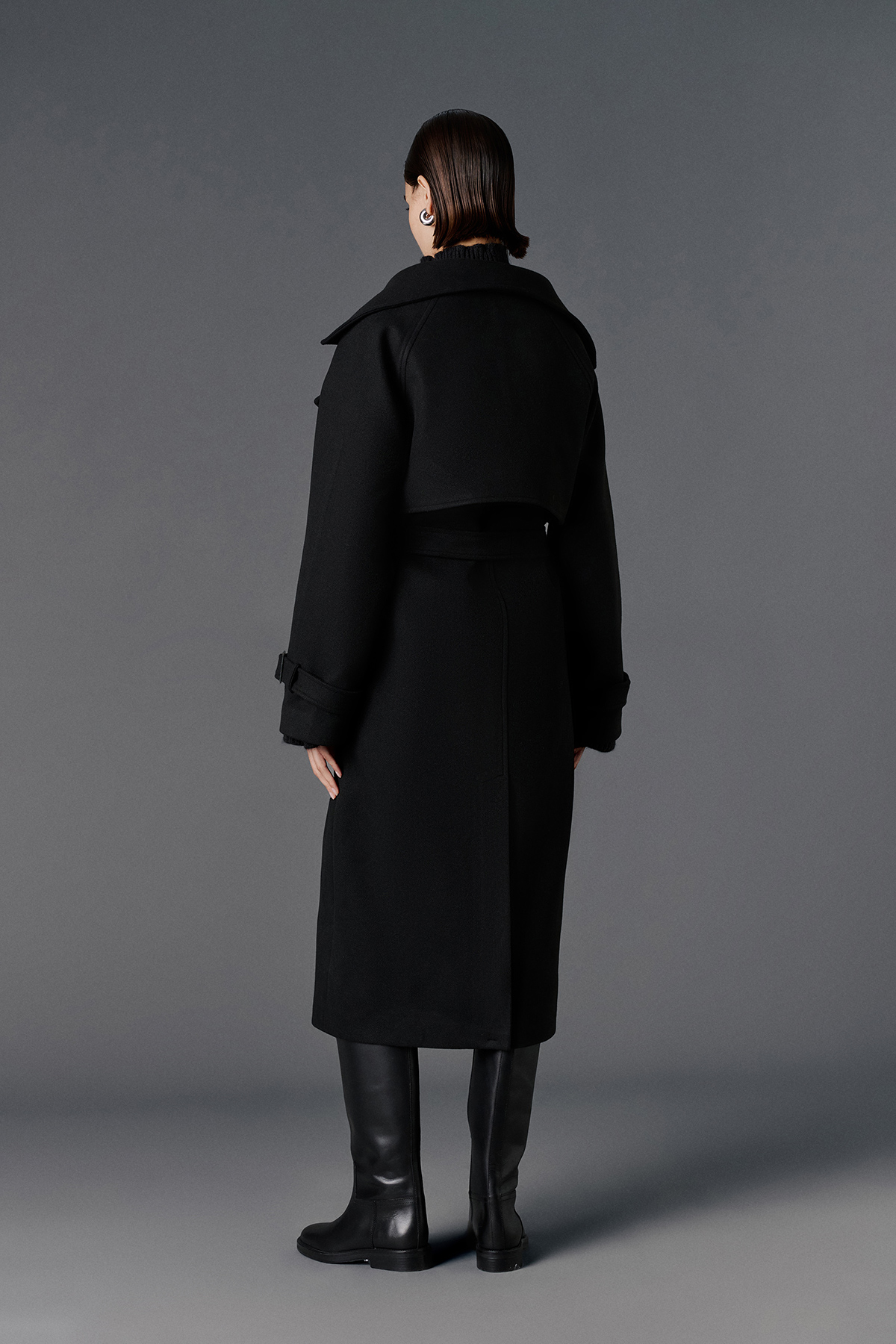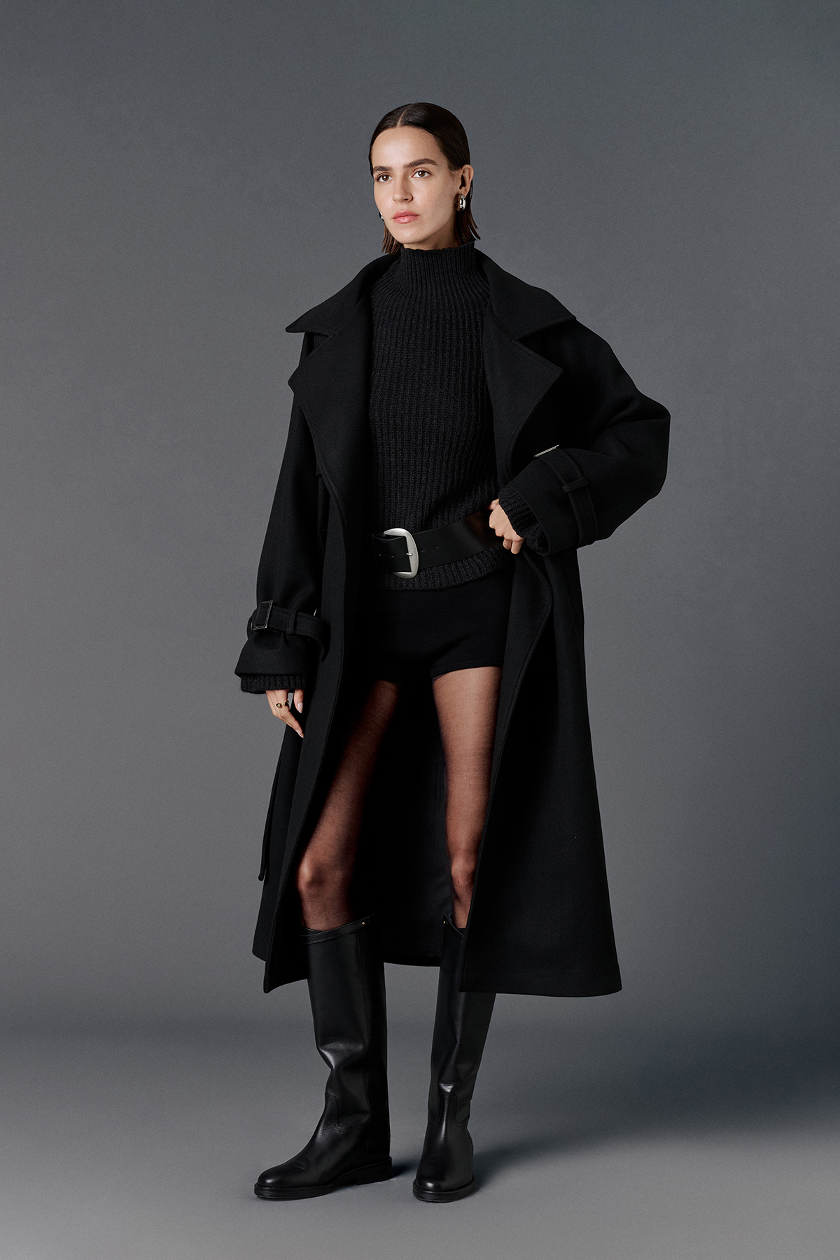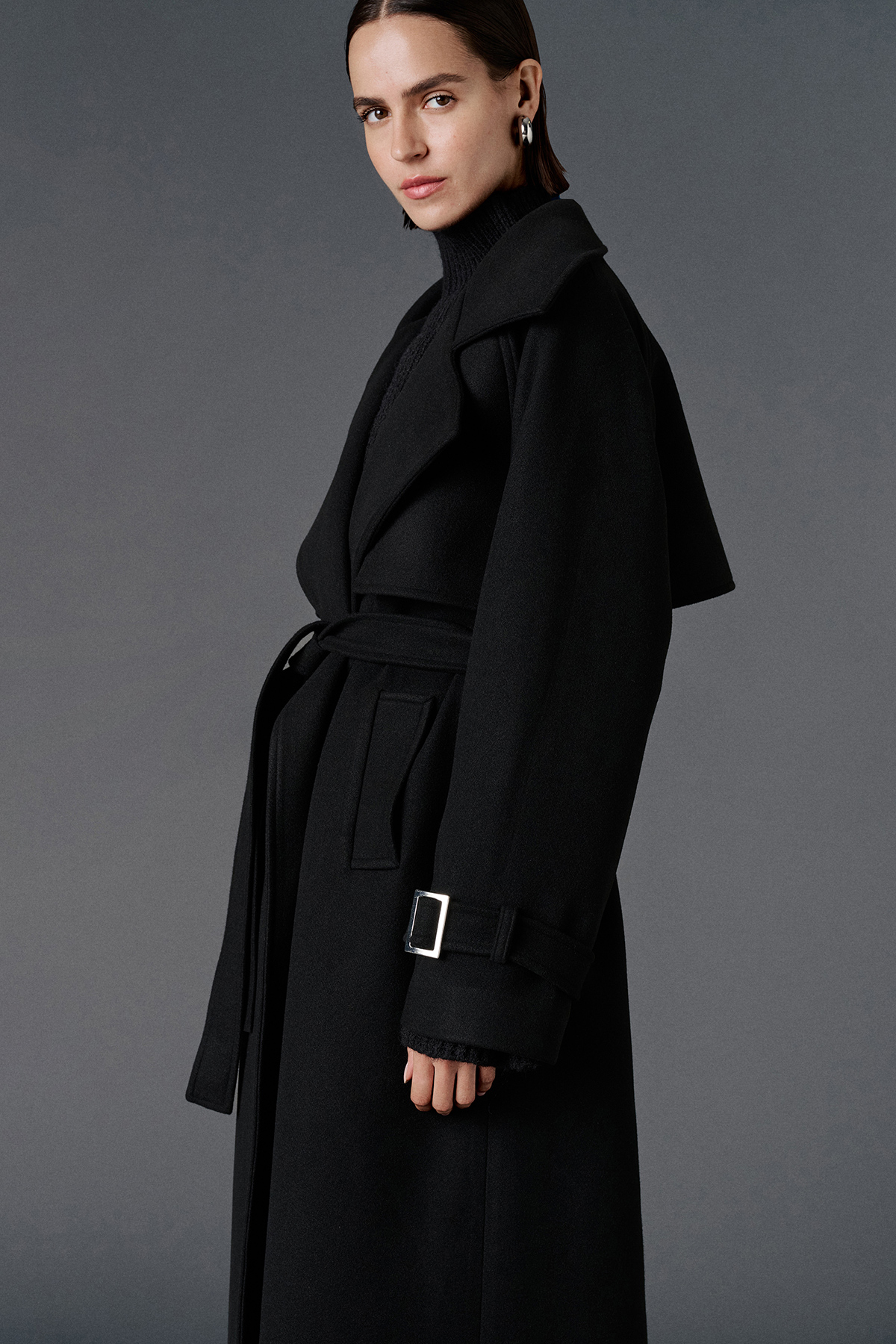Kruvaze yaka, rüzgarlıklı, astarlı, kuşaklı, yanlardan iki cepli, yün karışımlı, manşeti kemer detaylı, midi boy kaban.