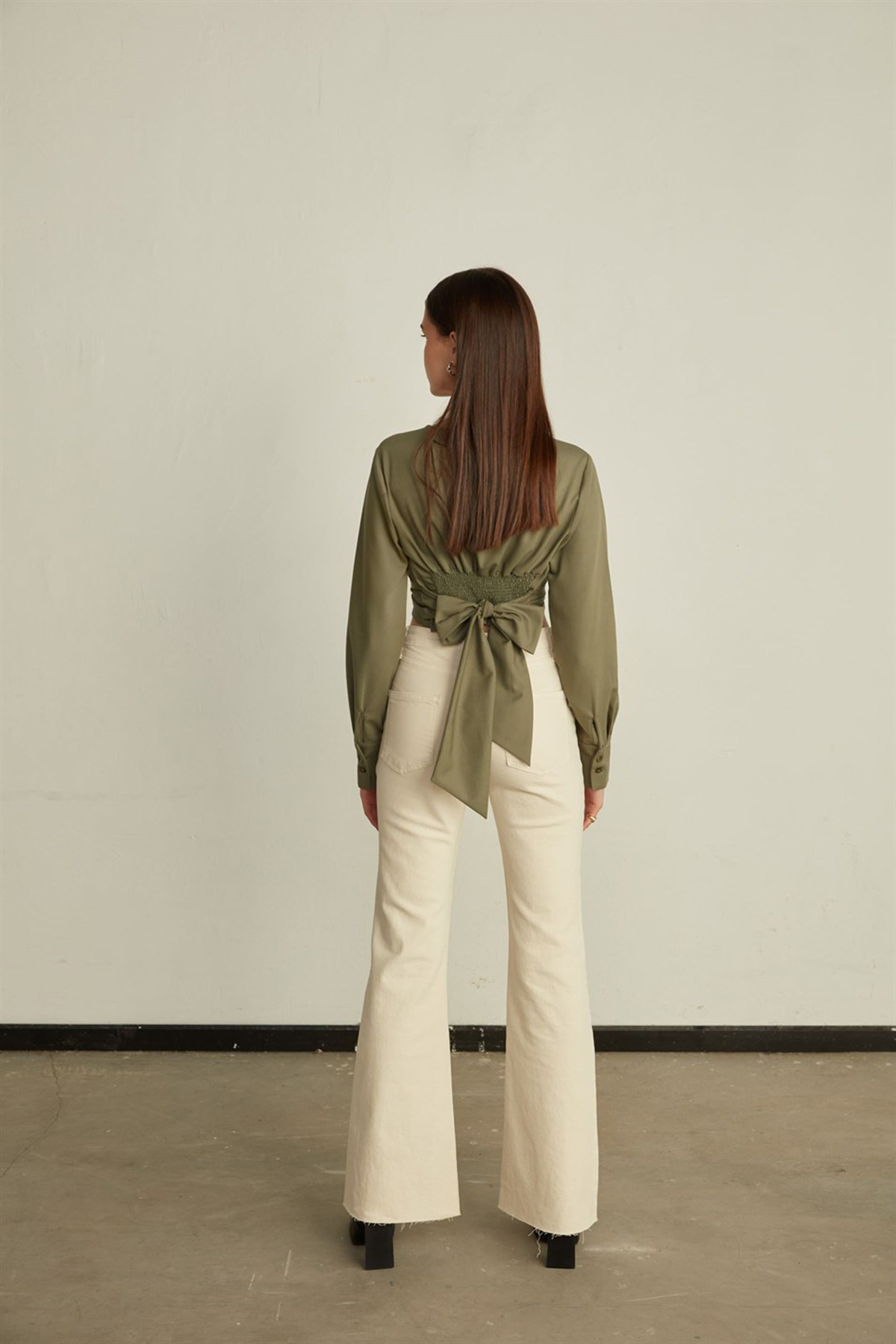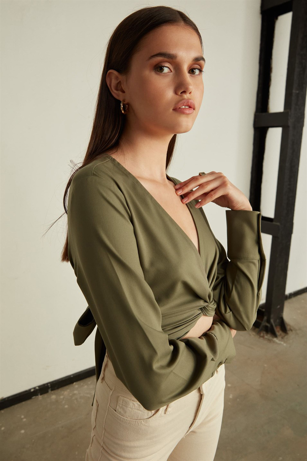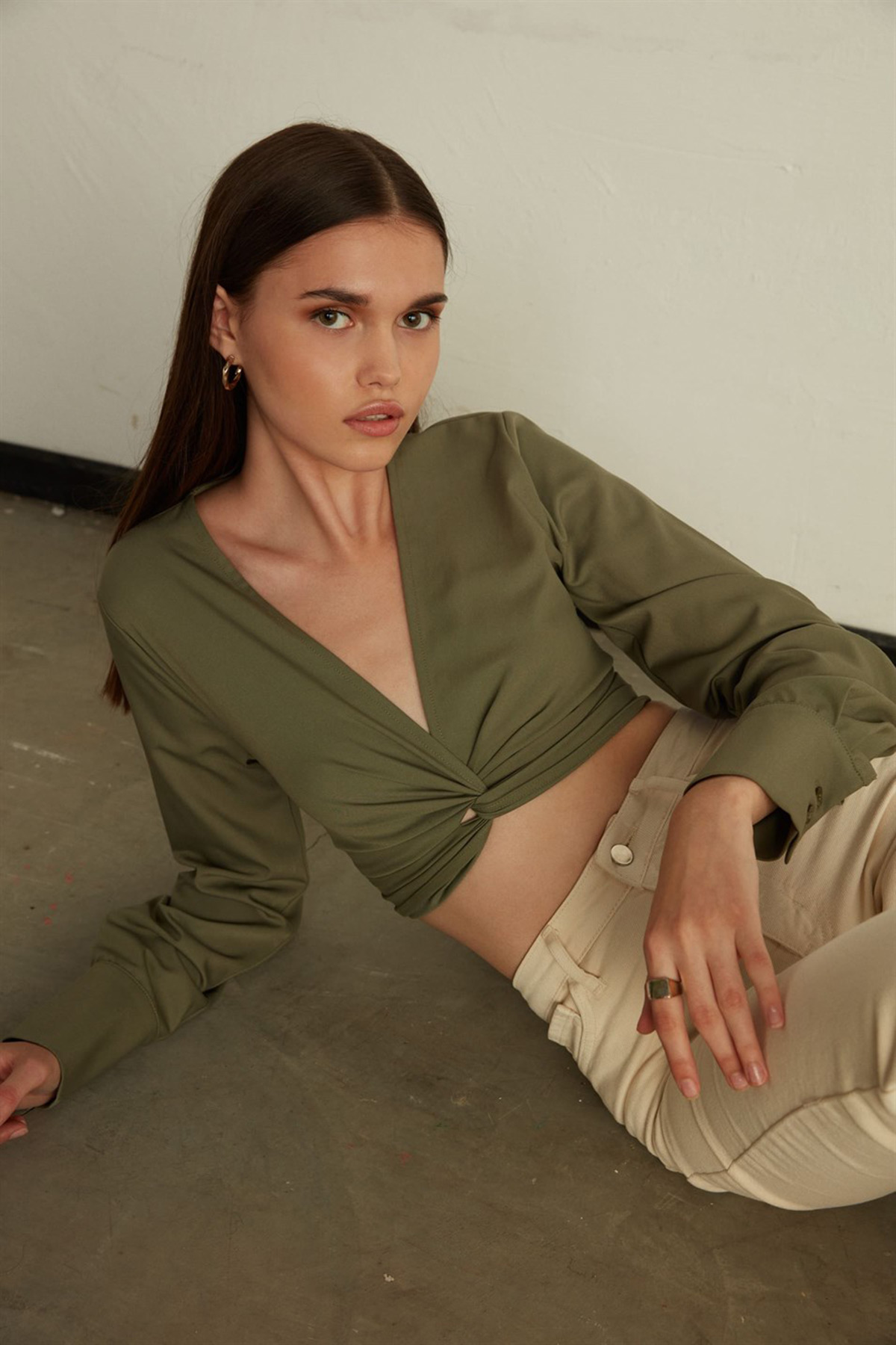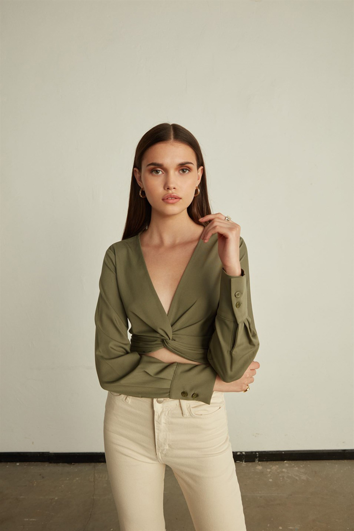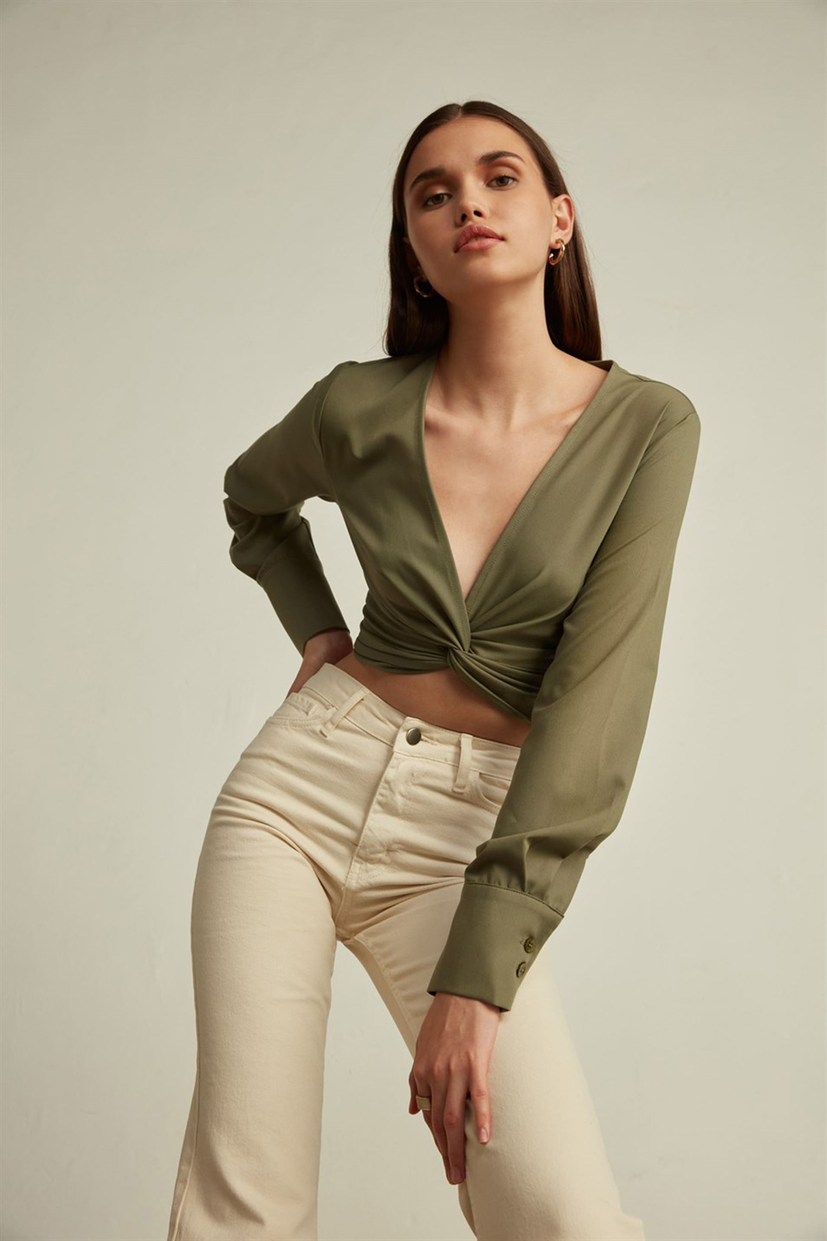 V yaka, önü büzgü detaylı, bağlamalı, manşet kollu ve beli lastikli crop bluz.