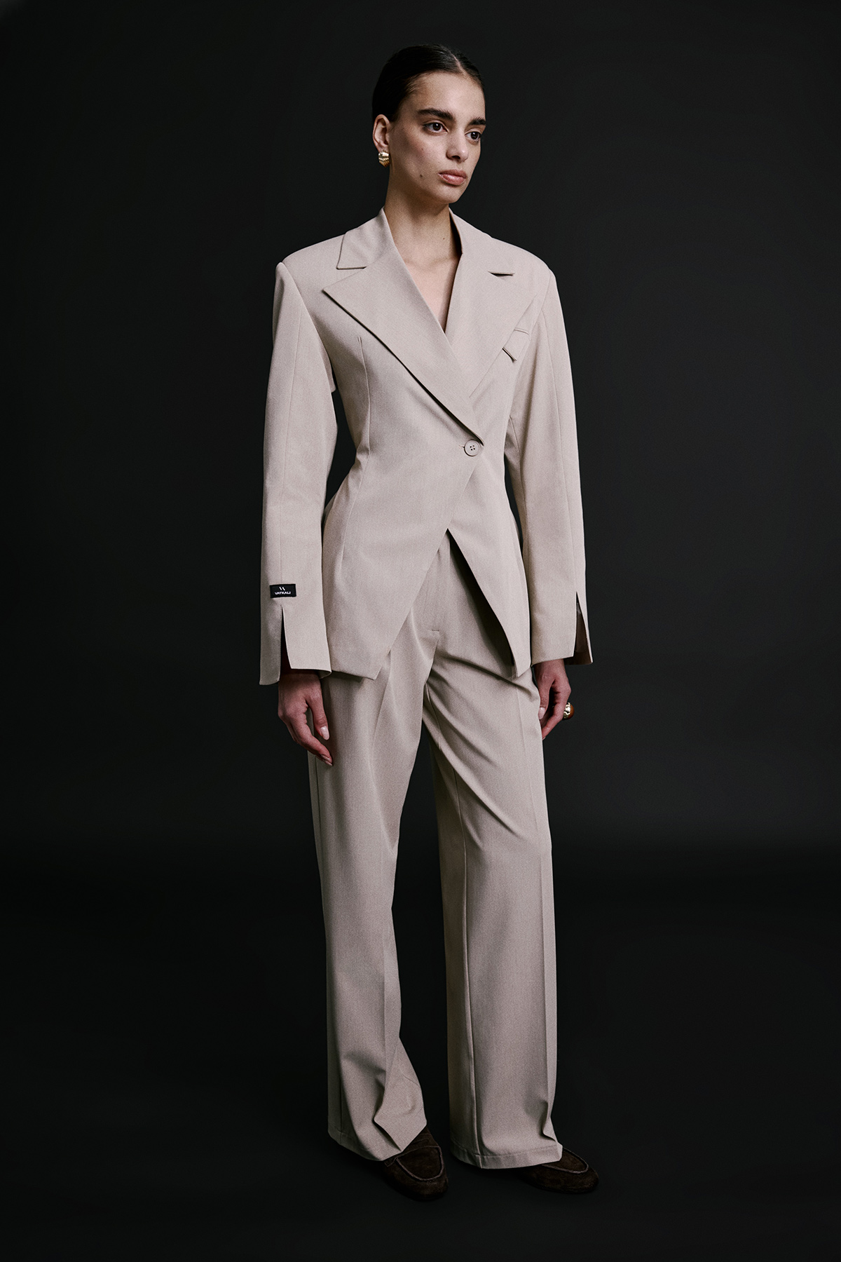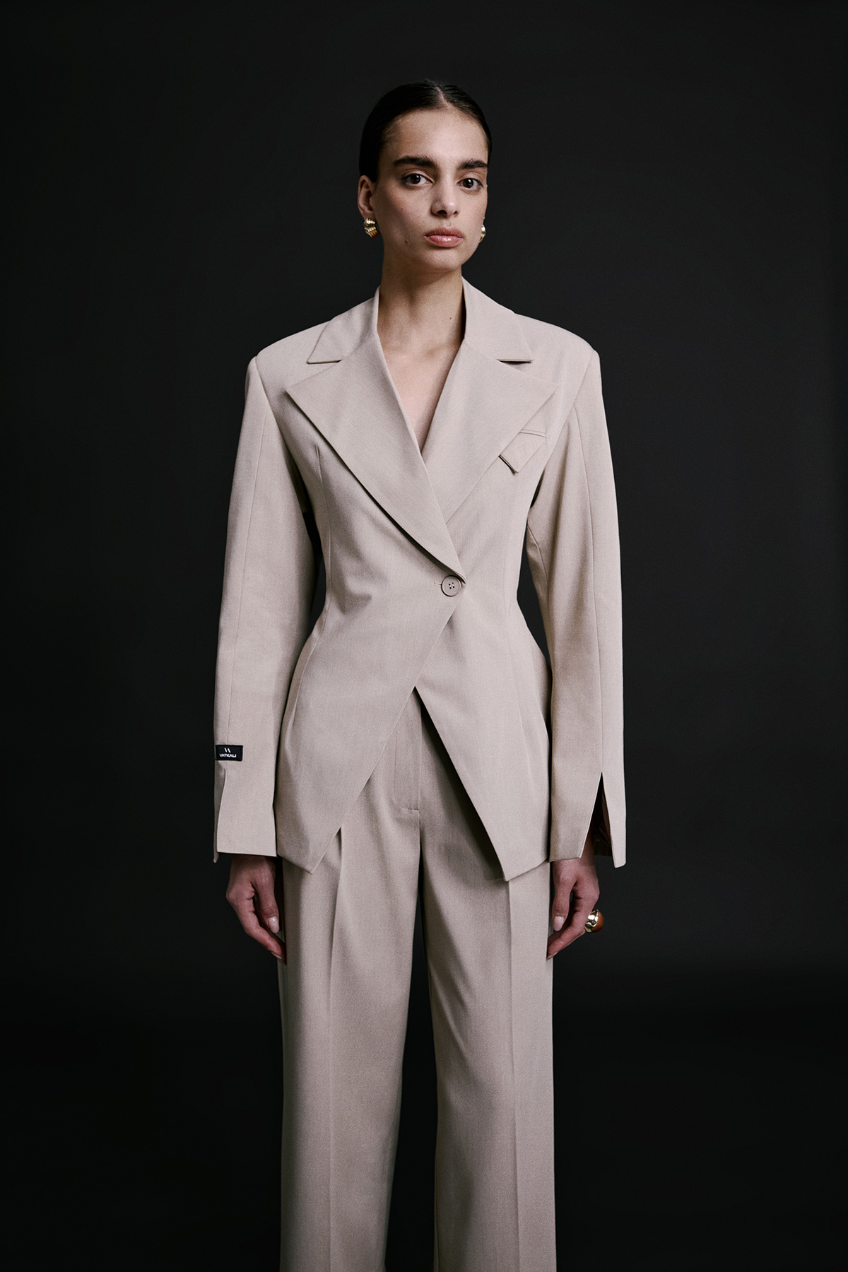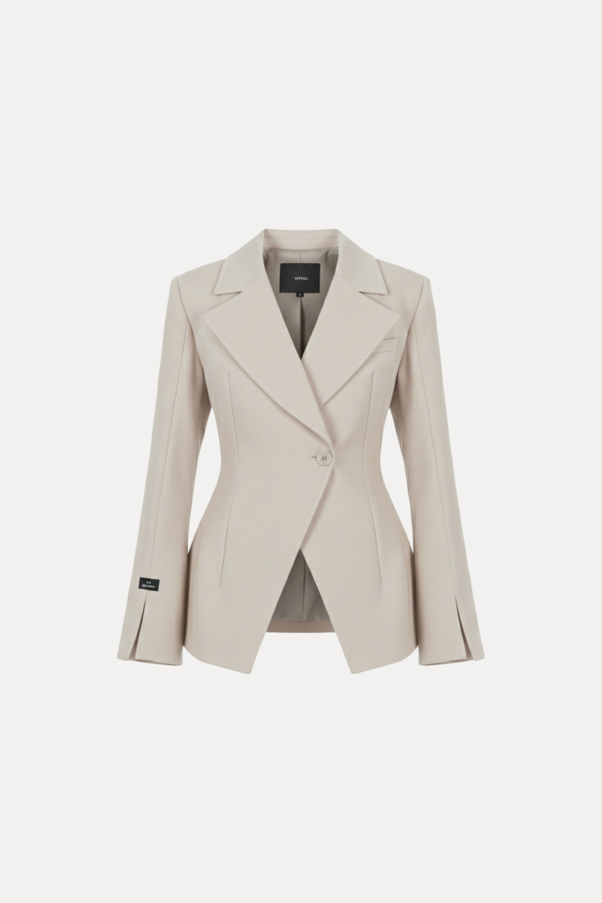 Vatkalı, tek düğmeli, uzun kollu, manşeti yırtmaçlı, kruvaze yaka, astarlı, vücuda oturan blazer ceket.