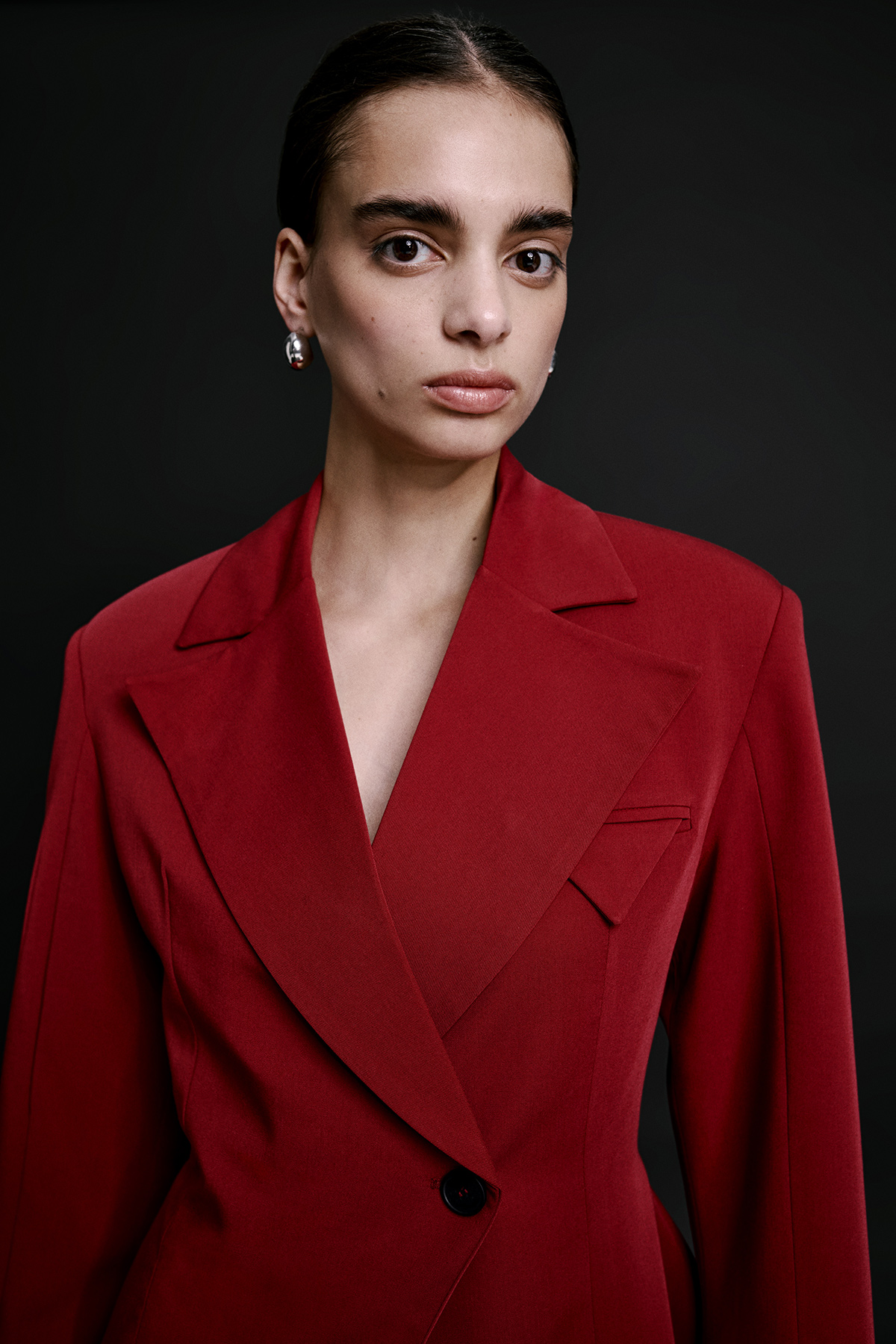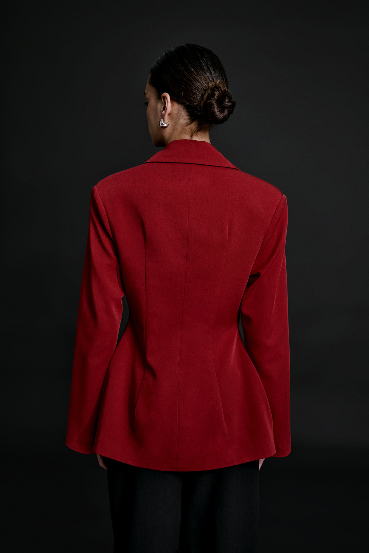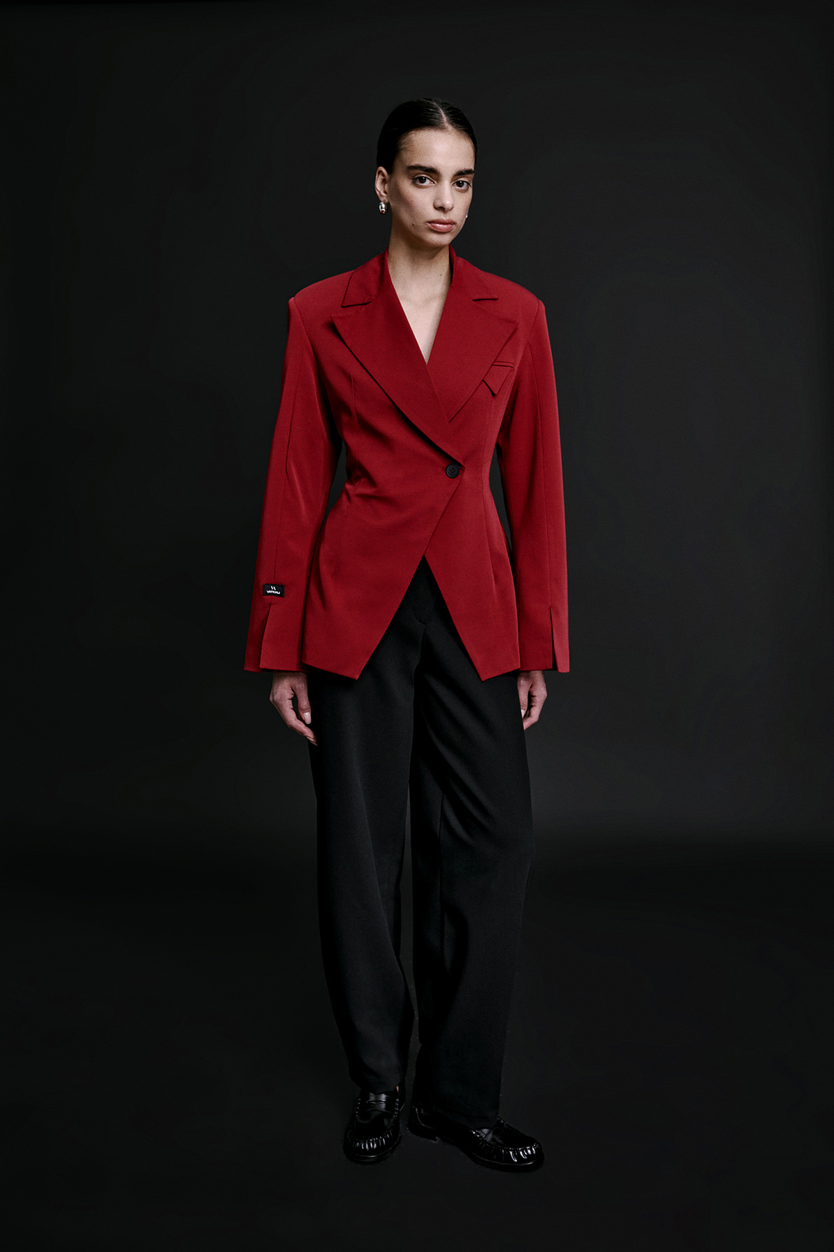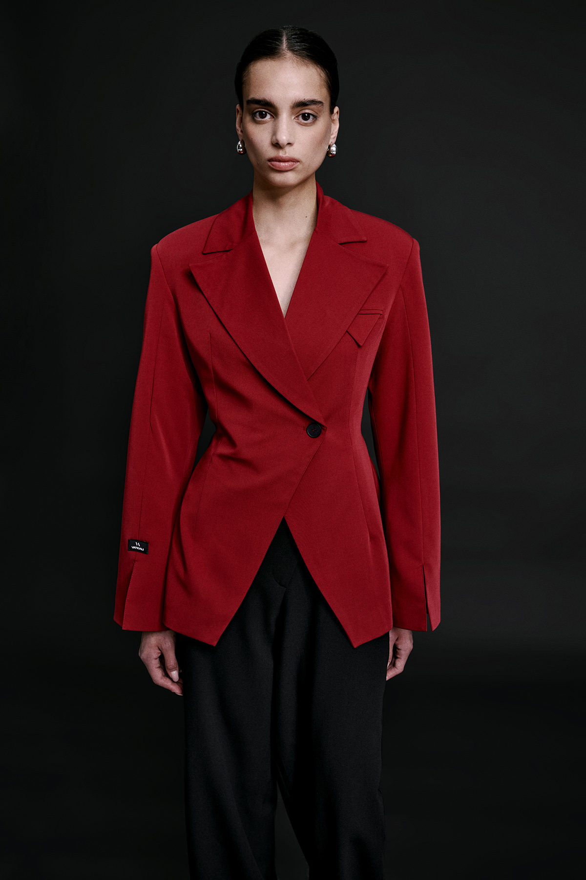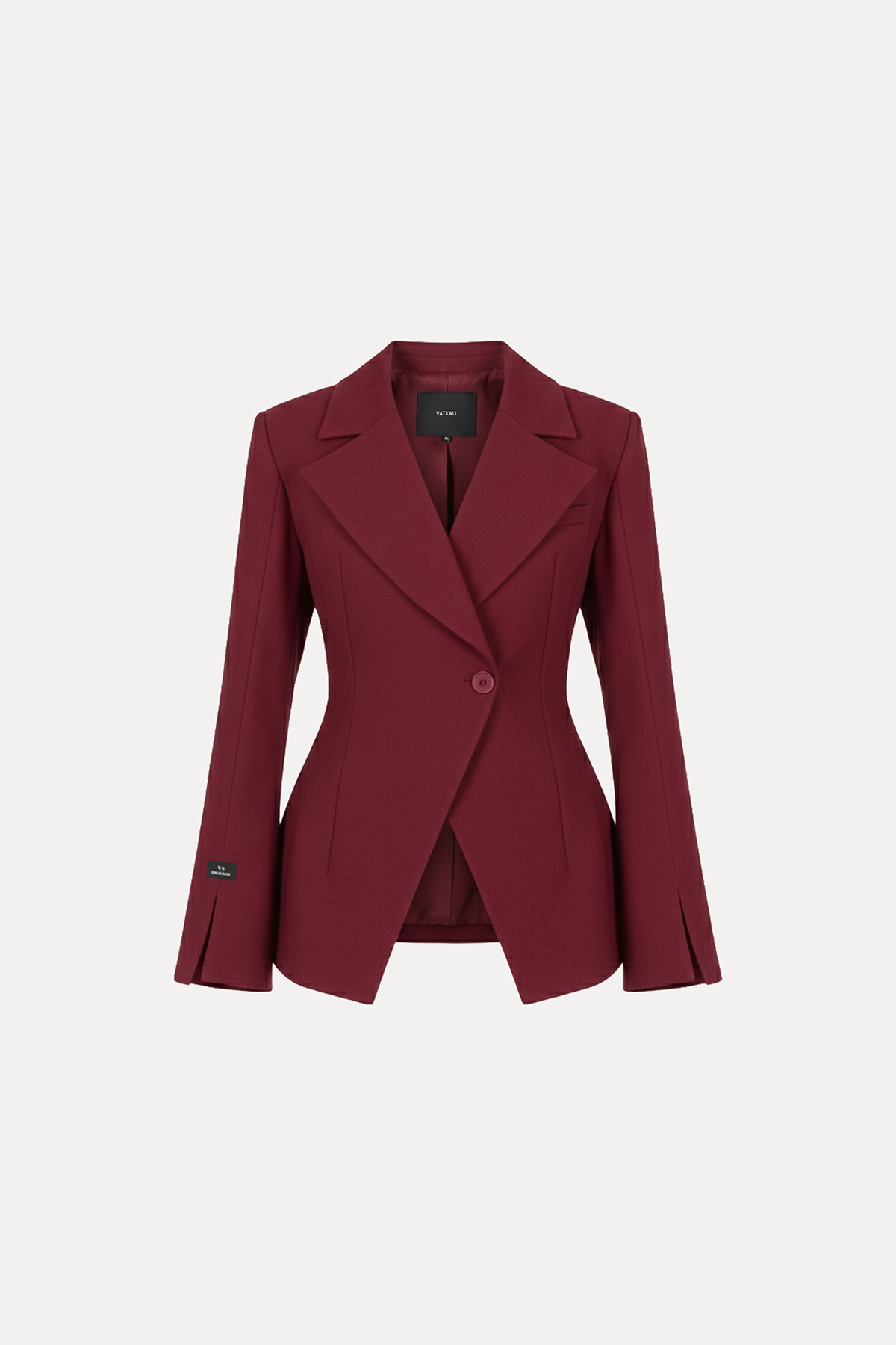 Vatkalı, tek düğmeli, uzun kollu, manşeti yırtmaçlı, kruvaze yaka, astarlı, vücuda oturan blazer ceket.