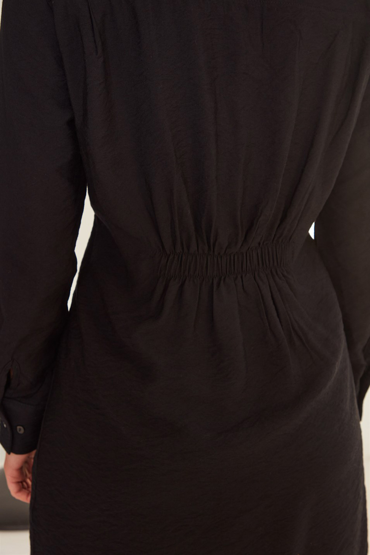 Kruvaze yaka,manşeti düğmeli,yarım astarlı, önü yarım dikişli,sırttan lastik detaylı,önü tek cepli, uzun kol mini elbise.
