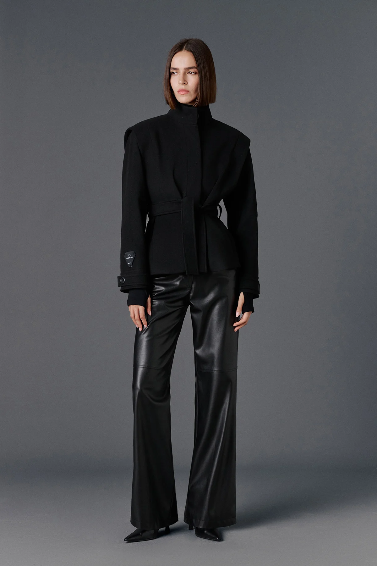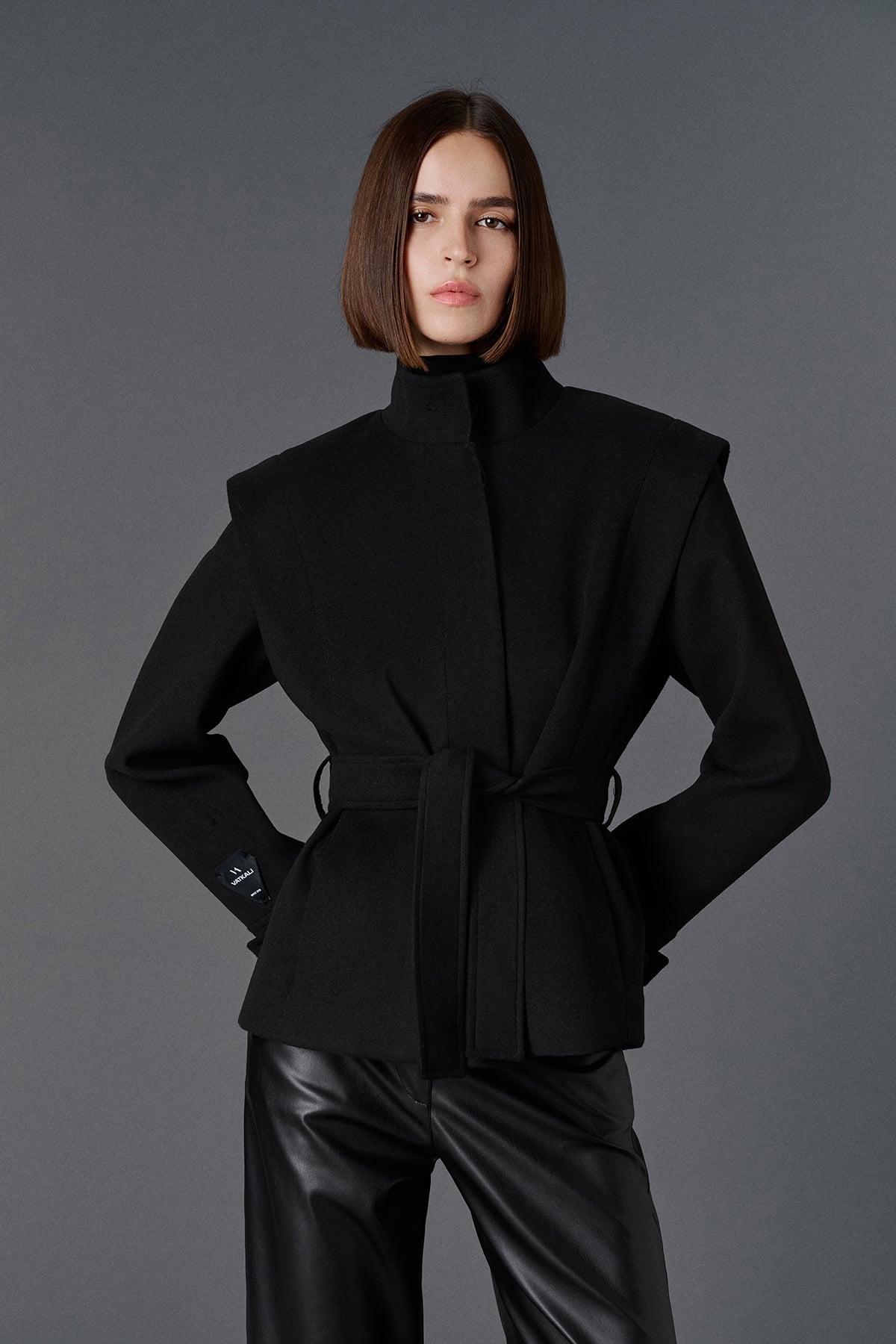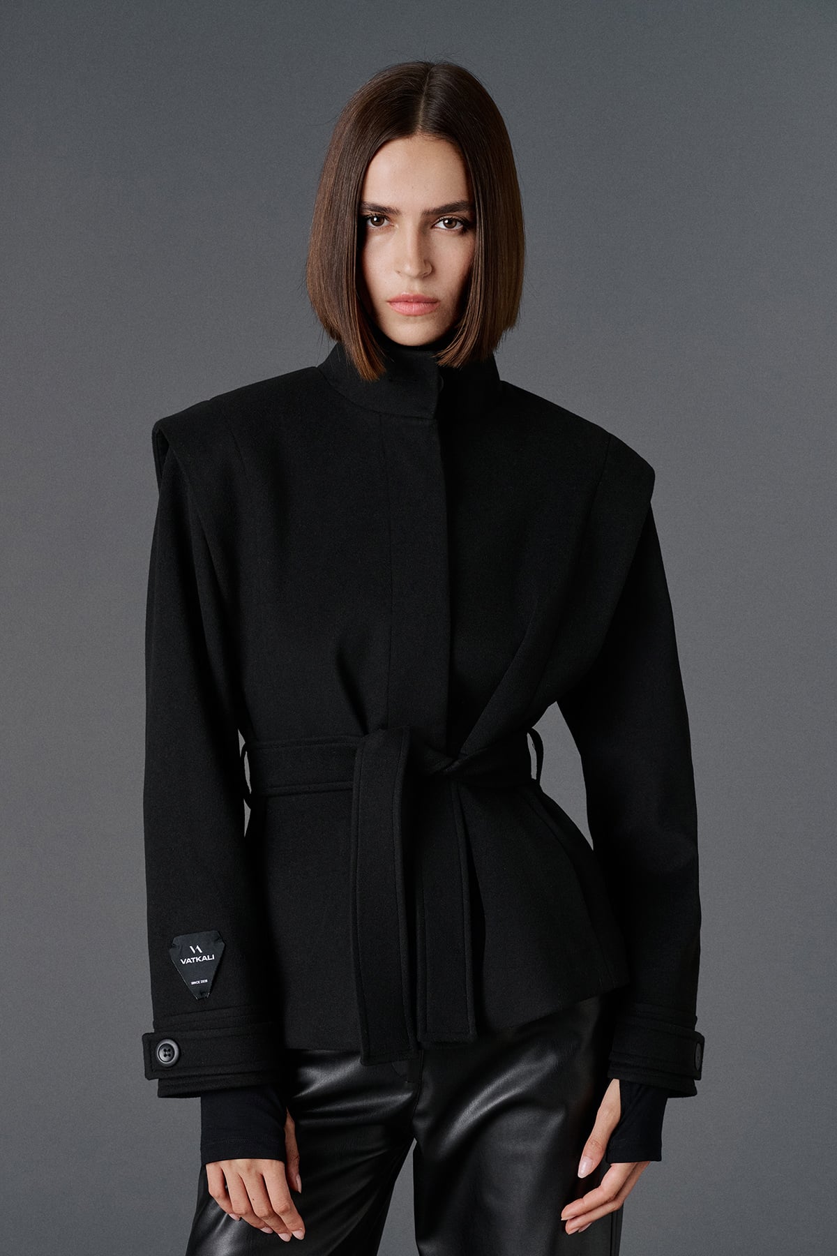 Kuşaklı, dik yaka, astarlı, vatkalı, 2 cepli, gizli düğme kapamalı, manşeti logo detaylı, kısa kaşe kaban.