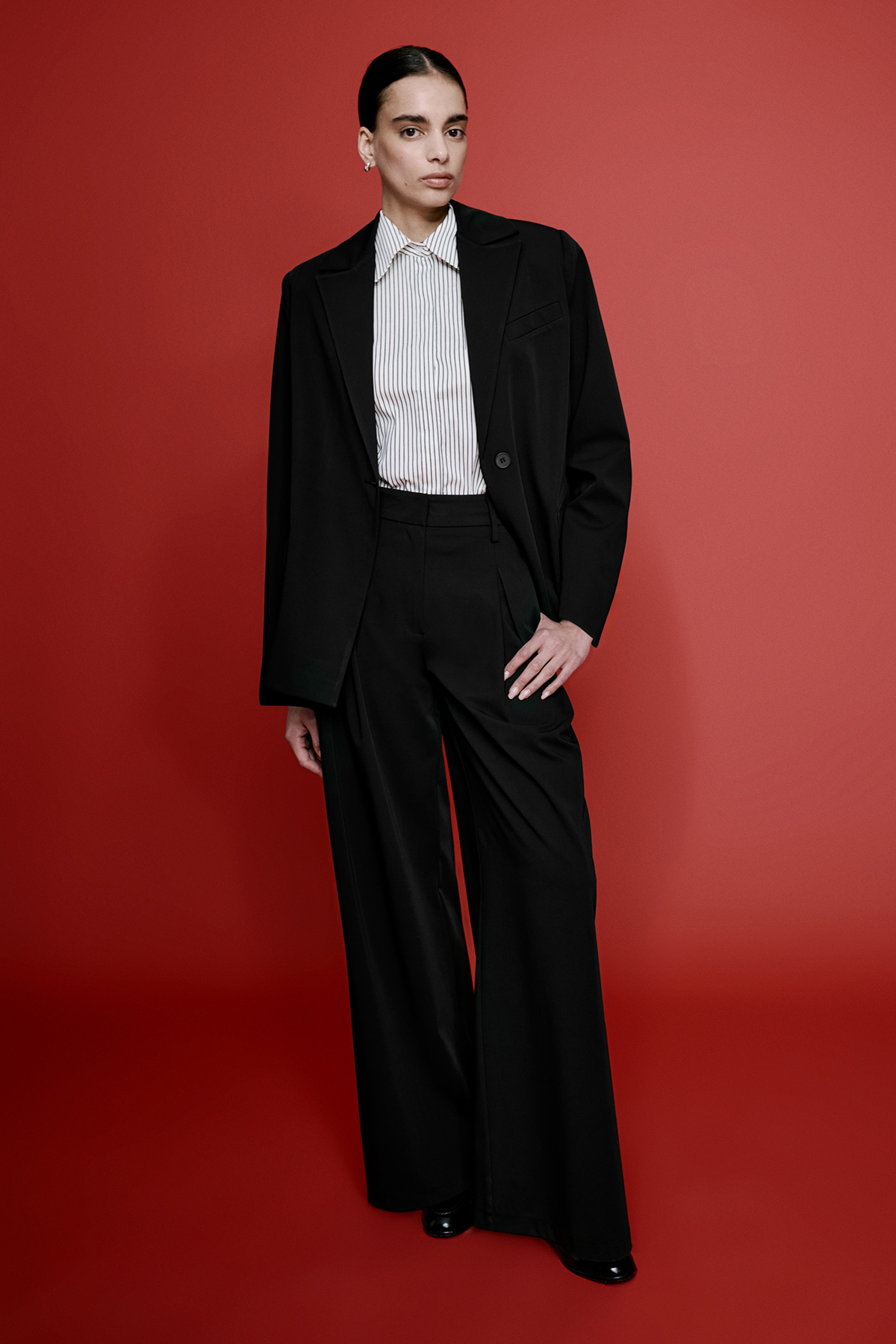 Oversize, önü tek düğmeli, vatkalı, astarlı, kuşaklı, üç adet aksesuar cep detaylı.