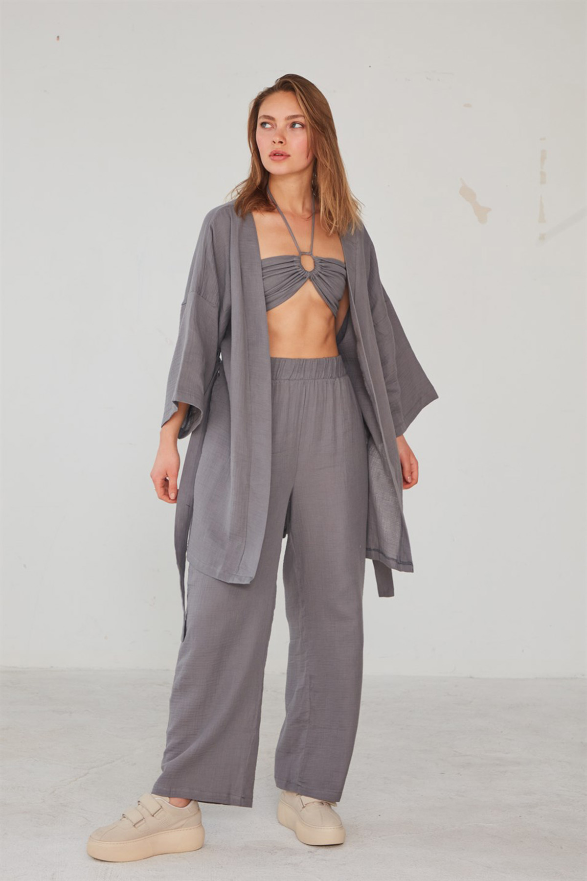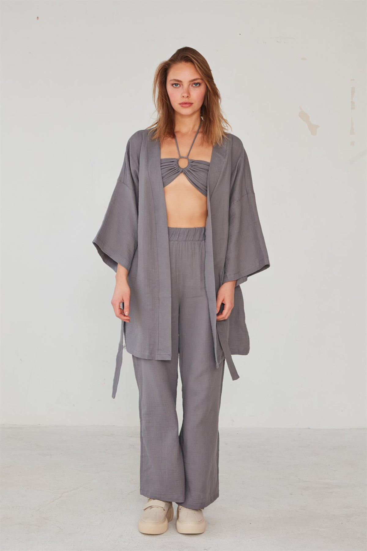 Kimono: geniş kollu, kuşaklı, kruvaze yaka ve oversize kalıptır.