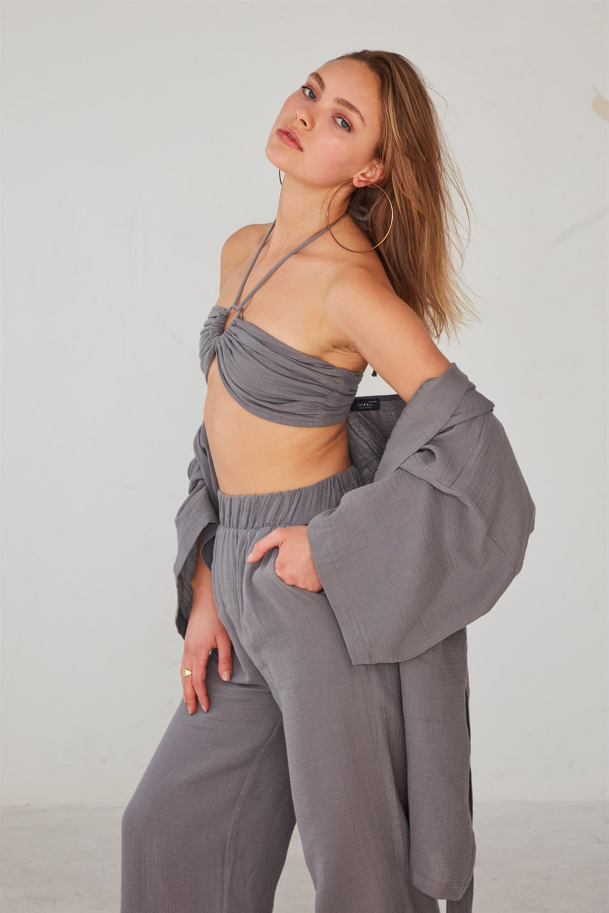 Pantolon: Beli lastikli, geniş paça, Oversize kalıptır.