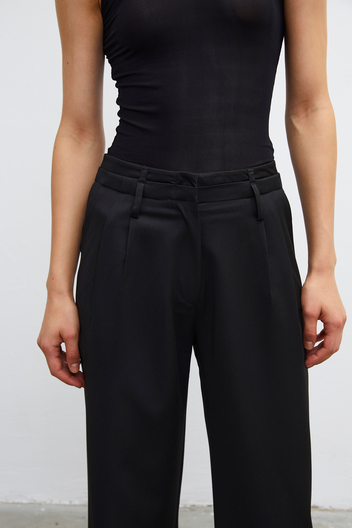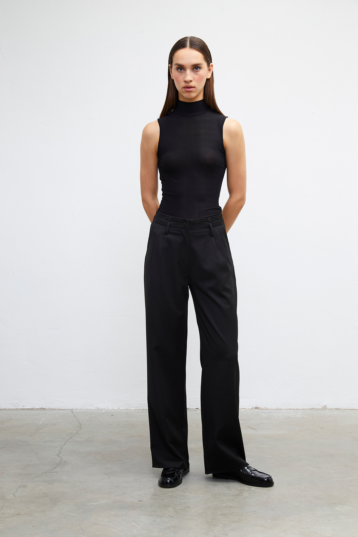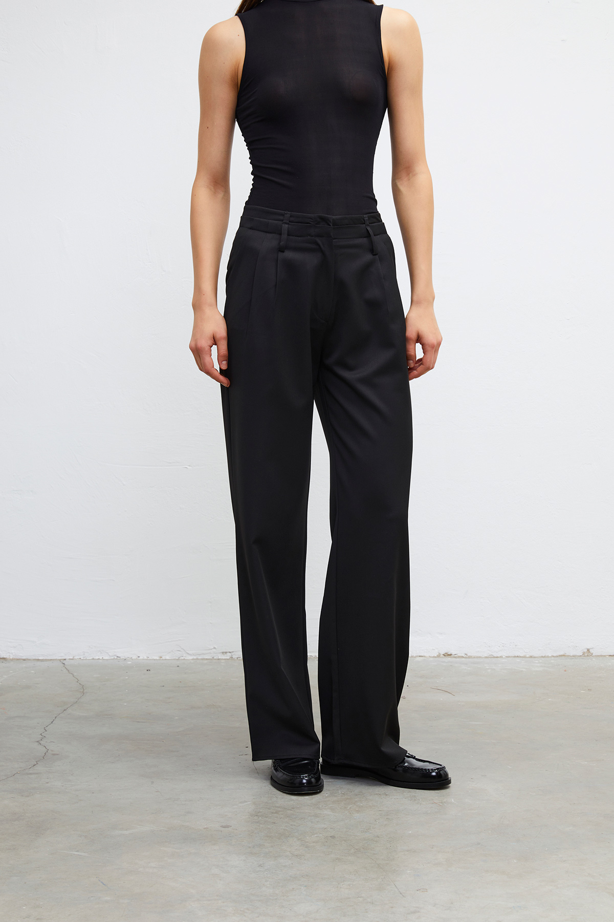 Yüksek bel, çift bel bantlı ve önü fermuarlı,cepli, loose fit pantolon.
