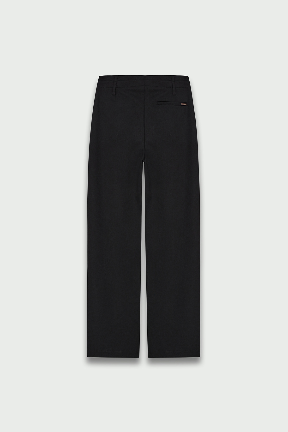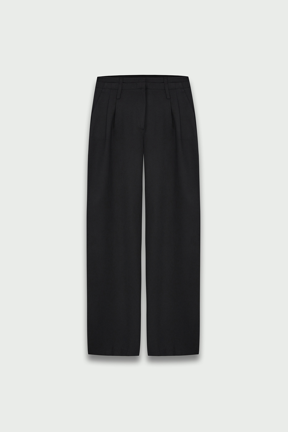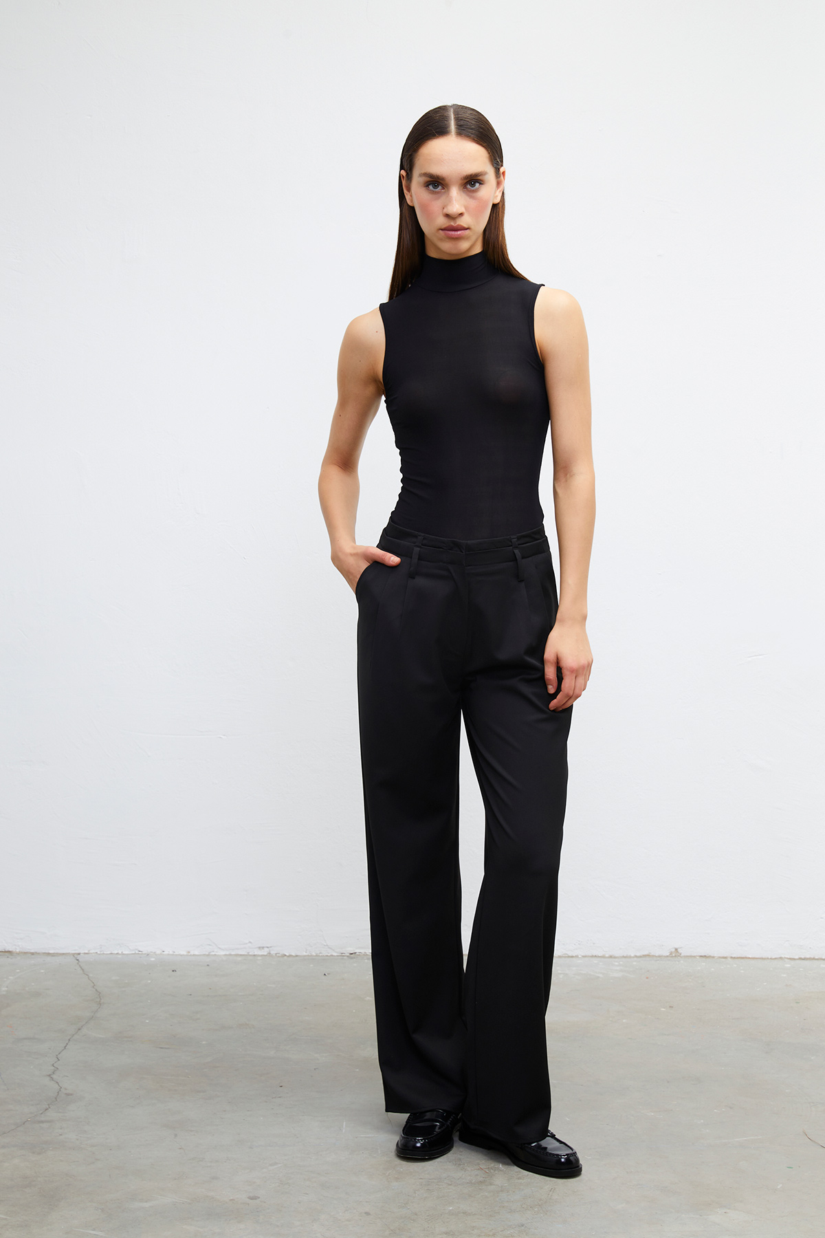 Yüksek bel, çift bel bantlı ve önü fermuarlı,cepli, loose fit pantolon.