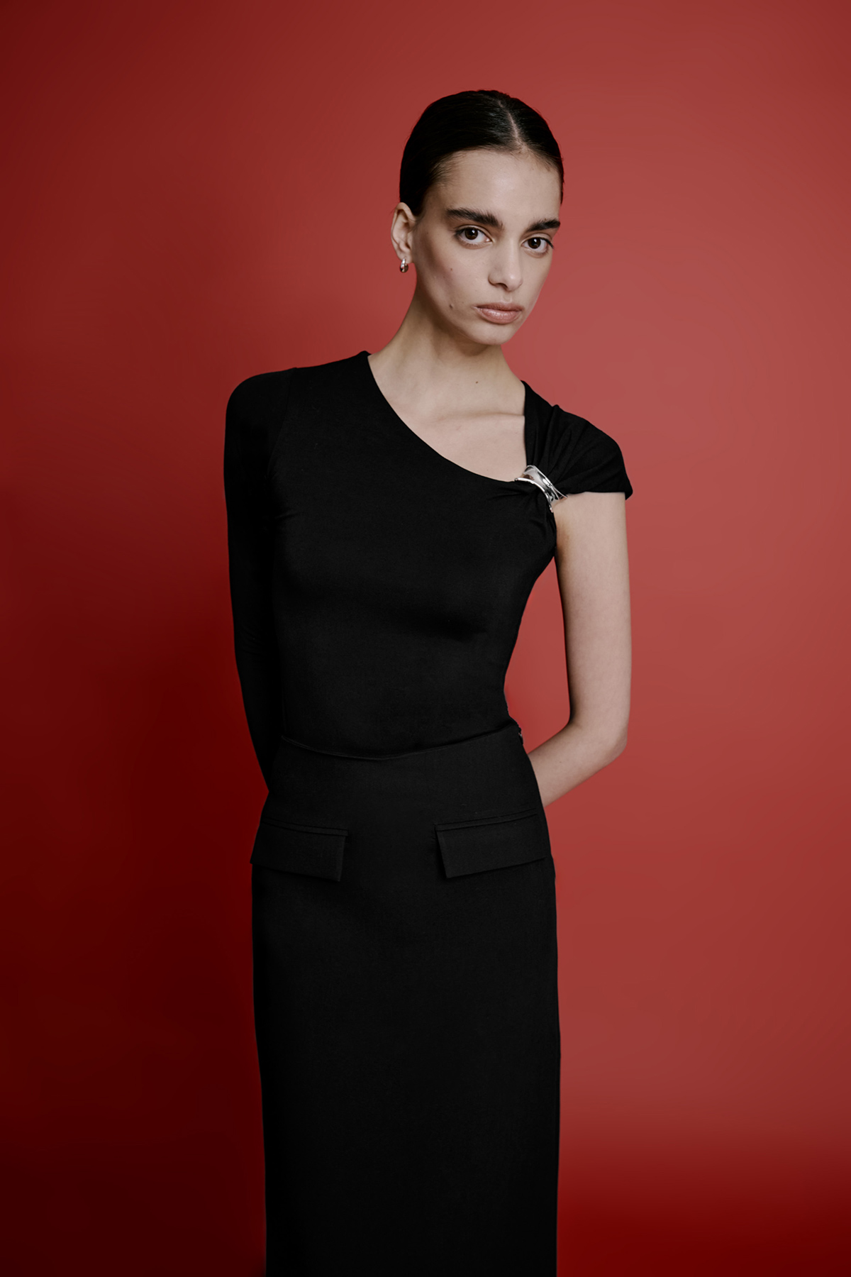 Tek kol tasarım, aksesuar detaylı, asimetrik yaka, fitted bluz