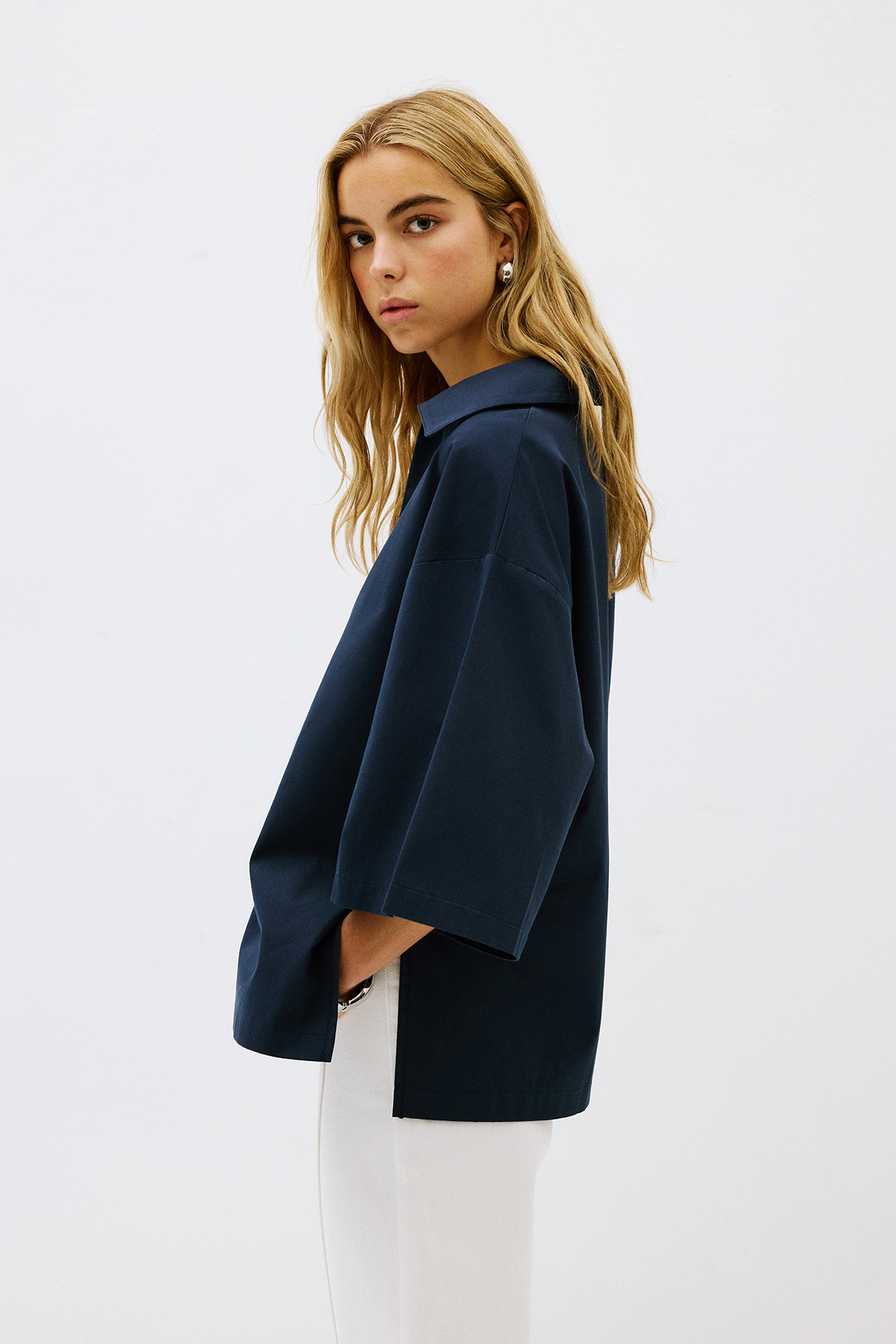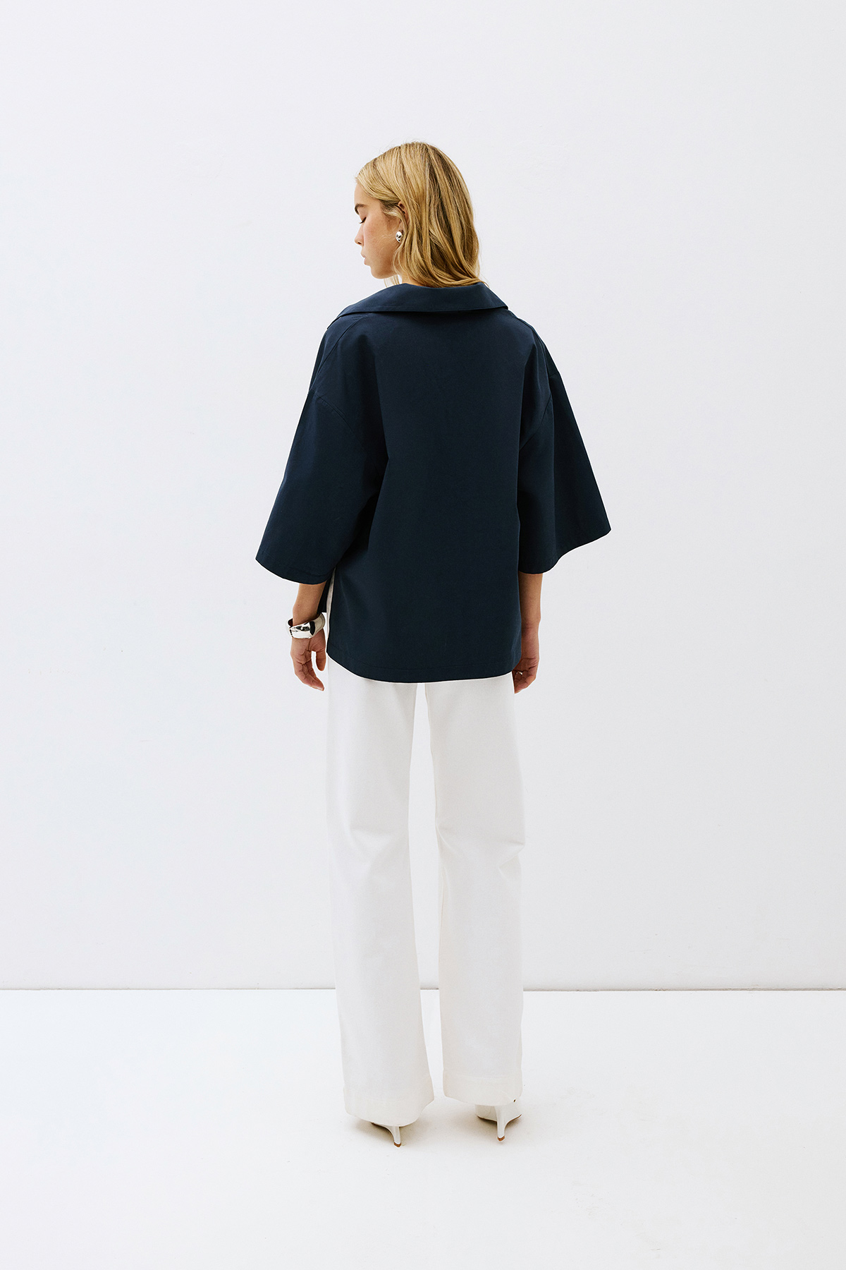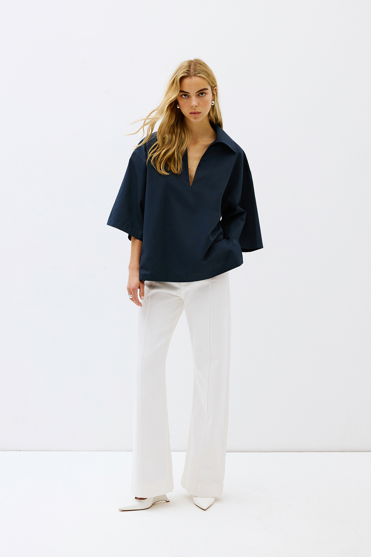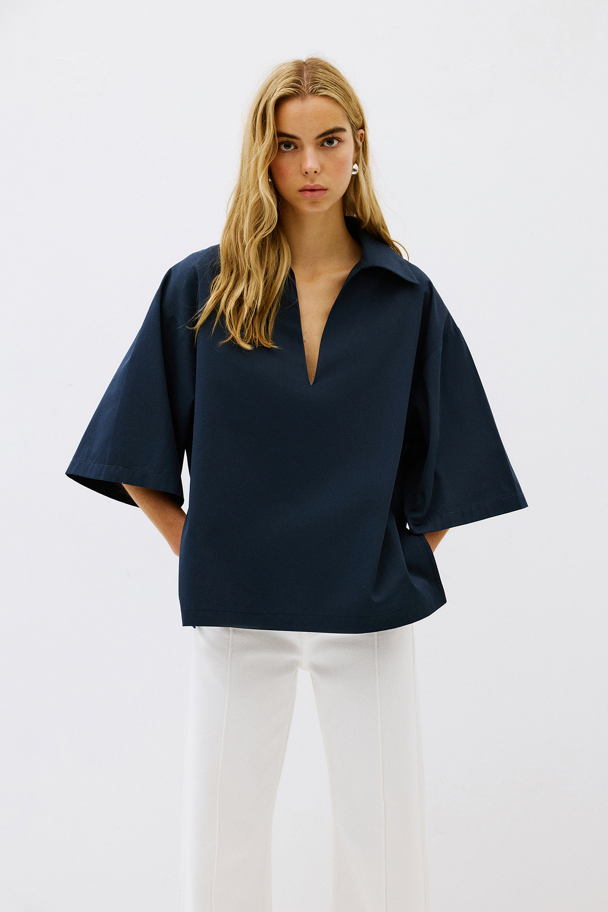 Polo yaka, önü V dekolteli, astarsız, yarım kollu, oversize gömlek.