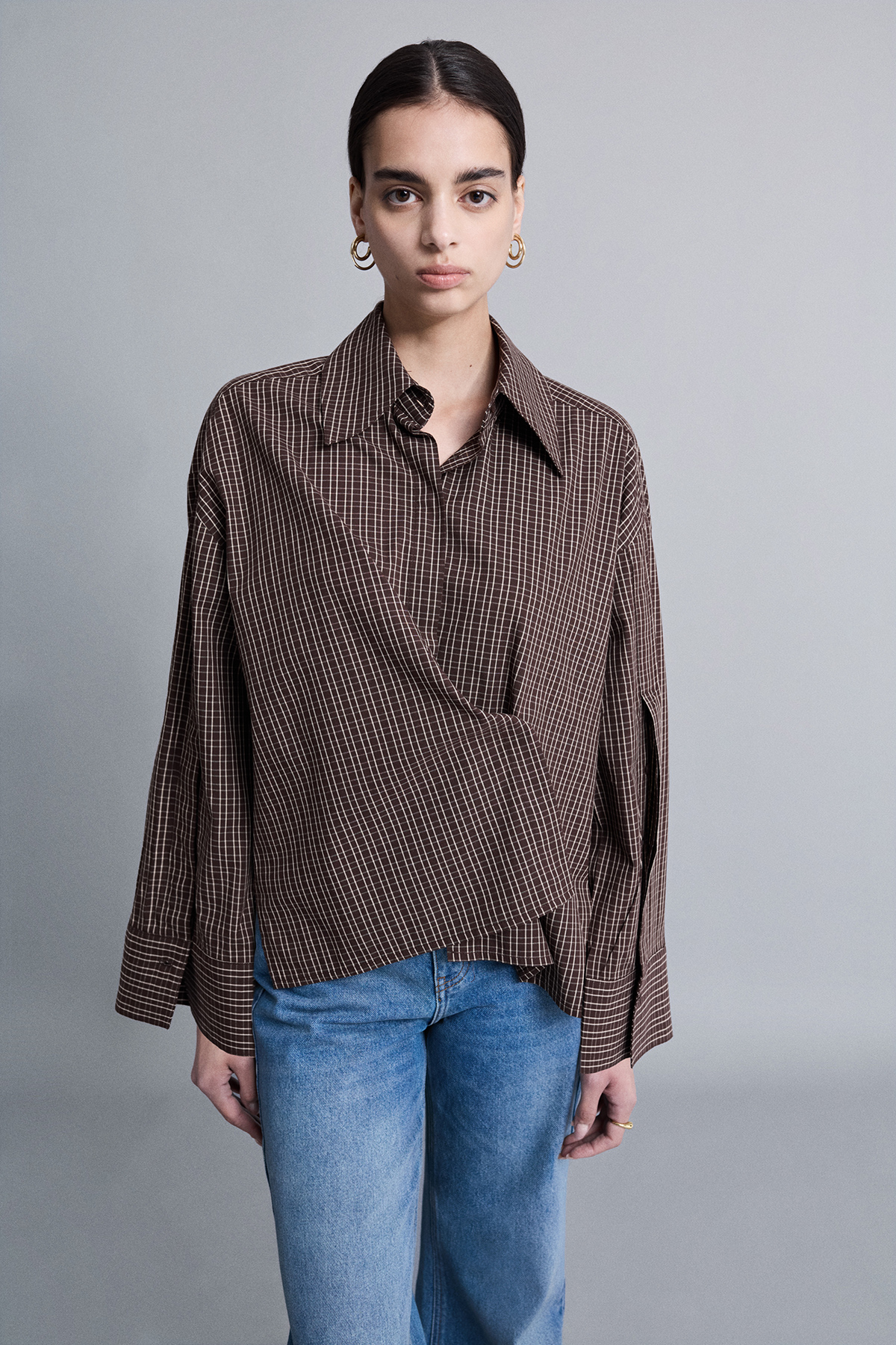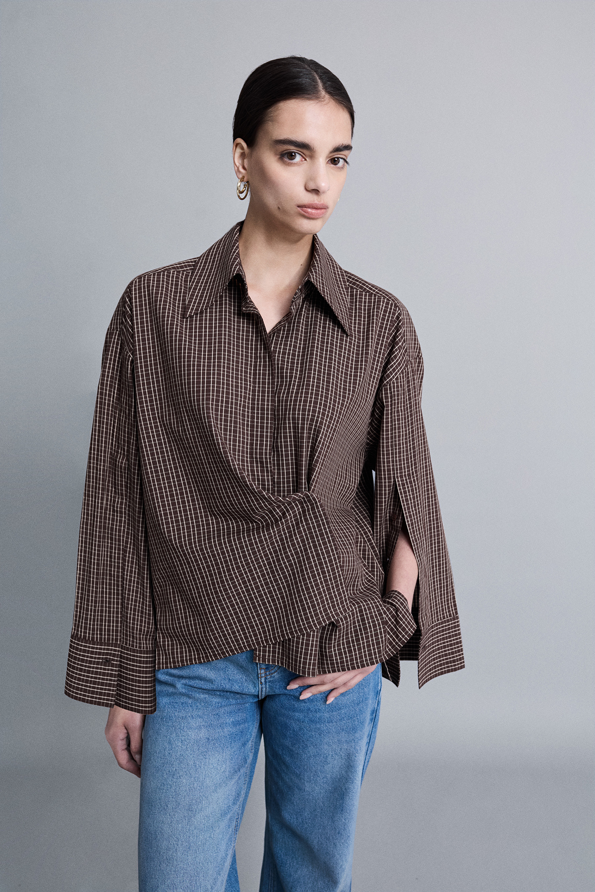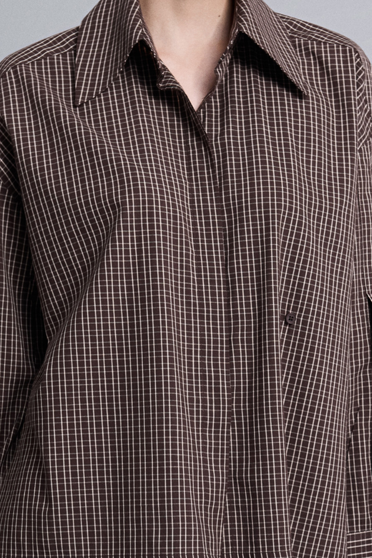 Oversize, astarsız, derin kol yırtmaçlı, gizli pat düğme kapamalı, uzun kollu gömlek.