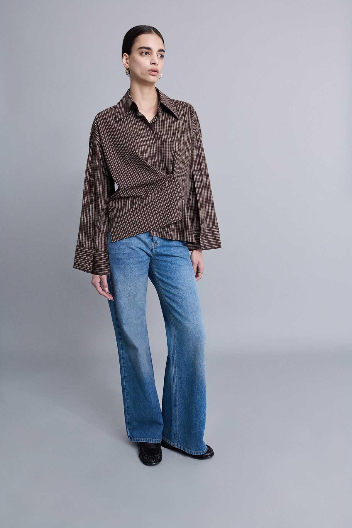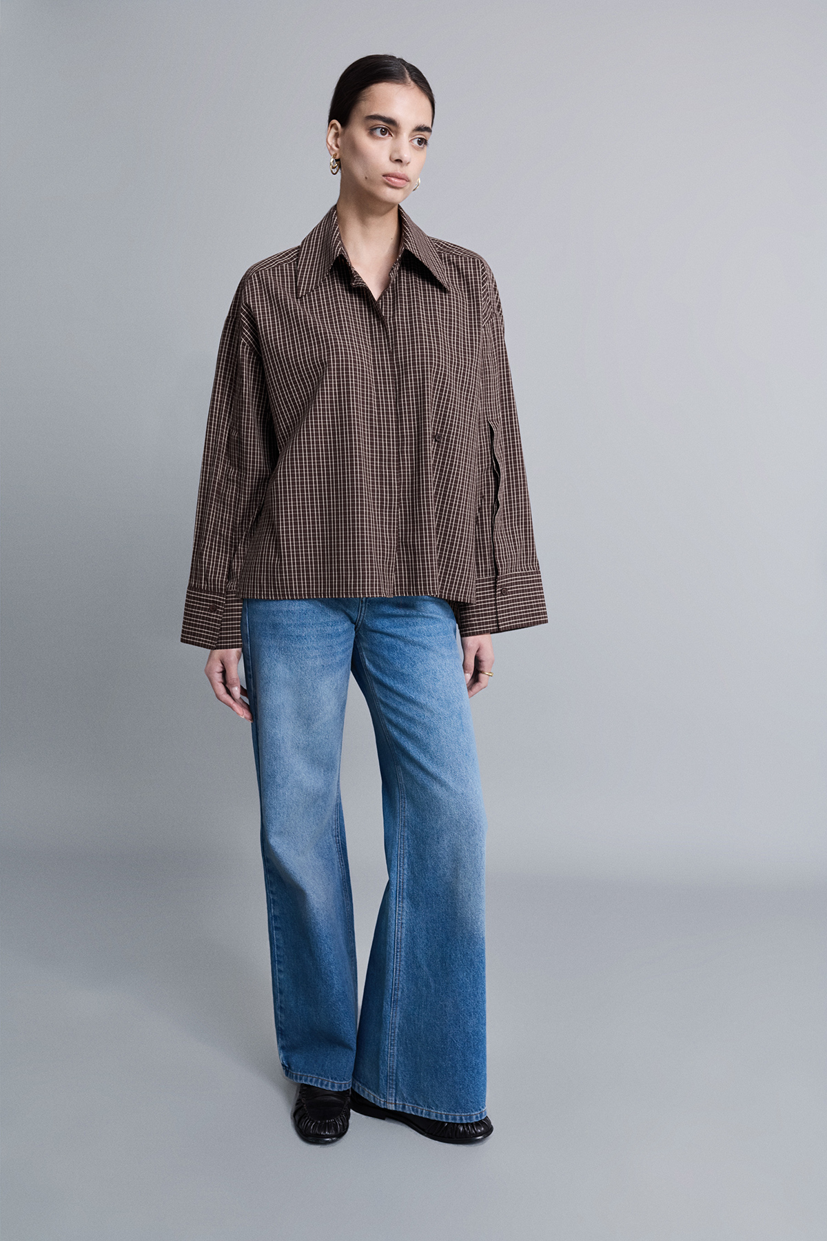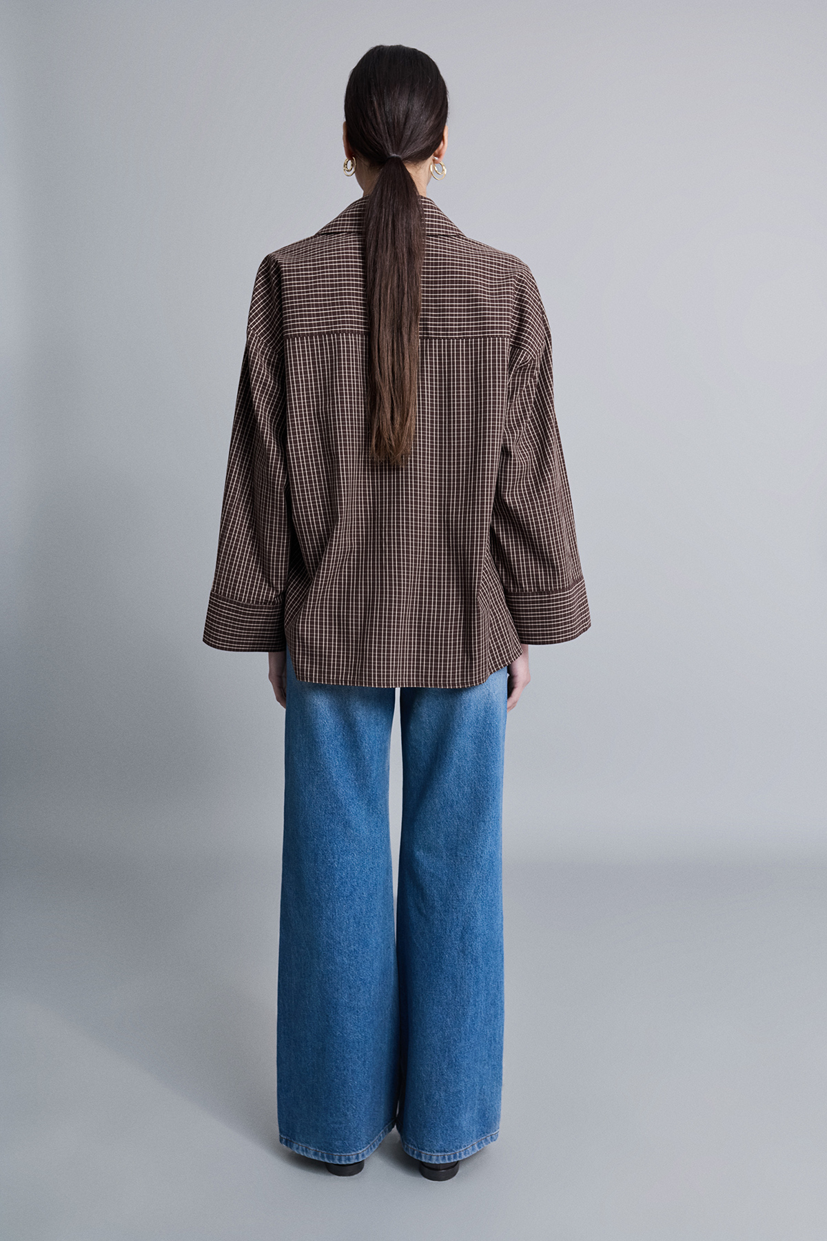 Oversize, astarsız, derin kol yırtmaçlı, gizli pat düğme kapamalı, uzun kollu gömlek.