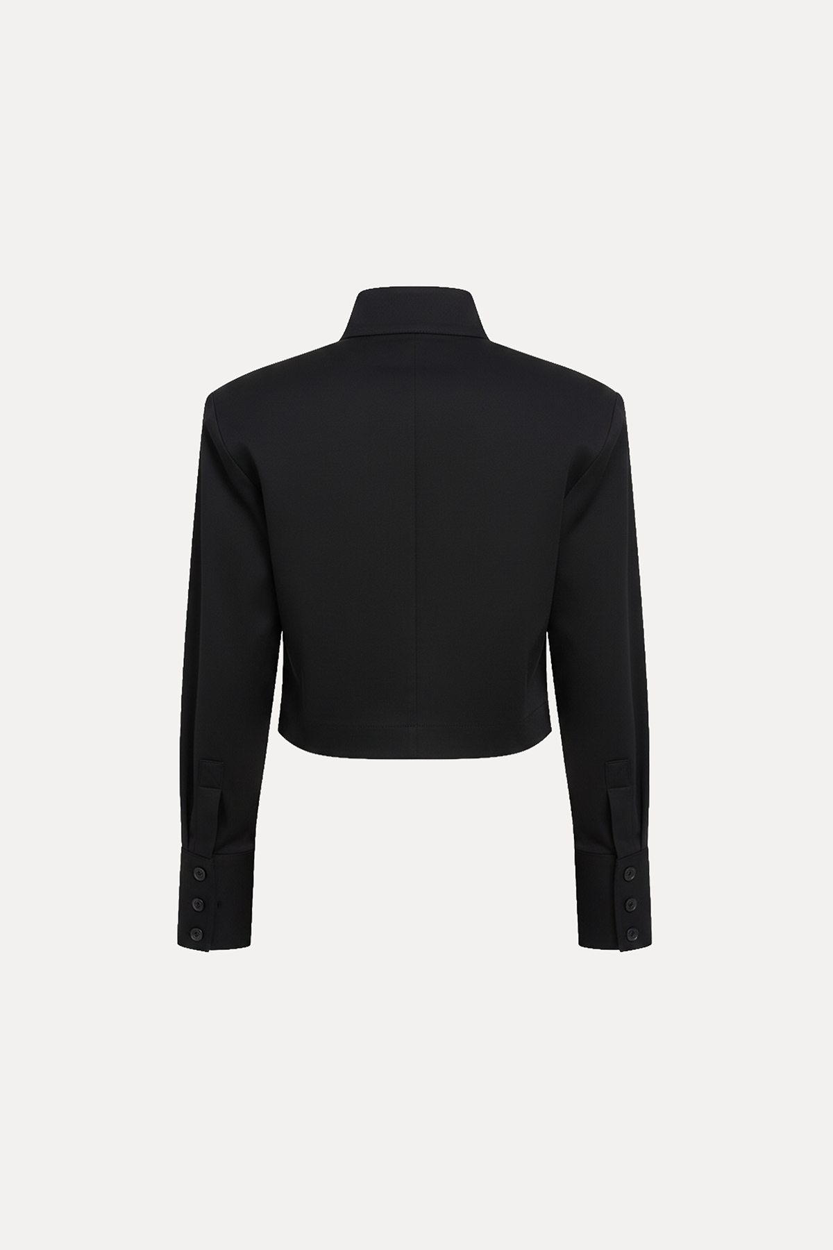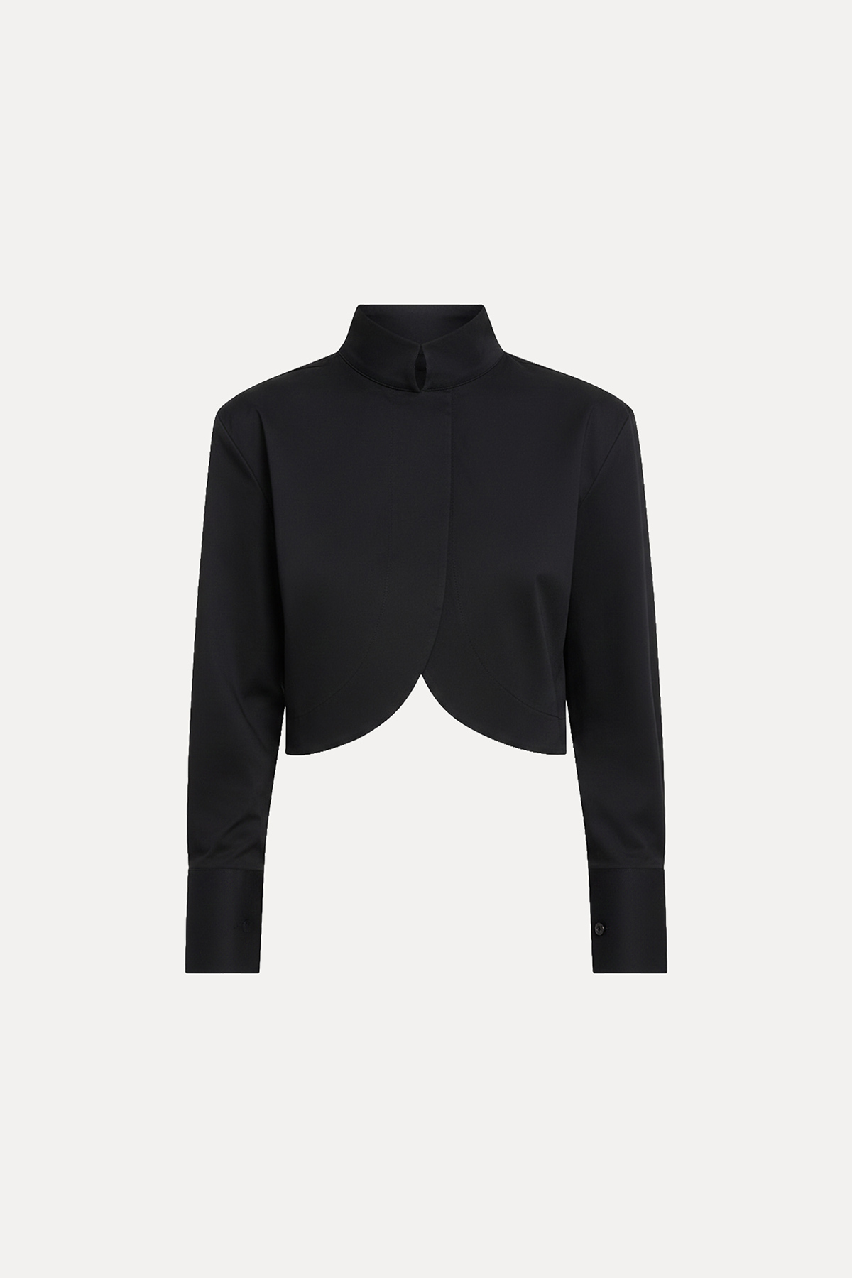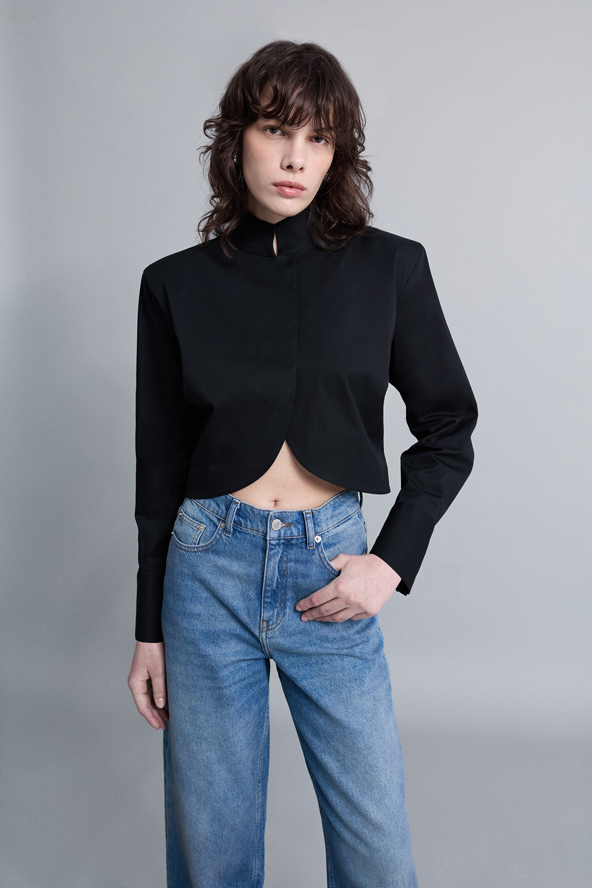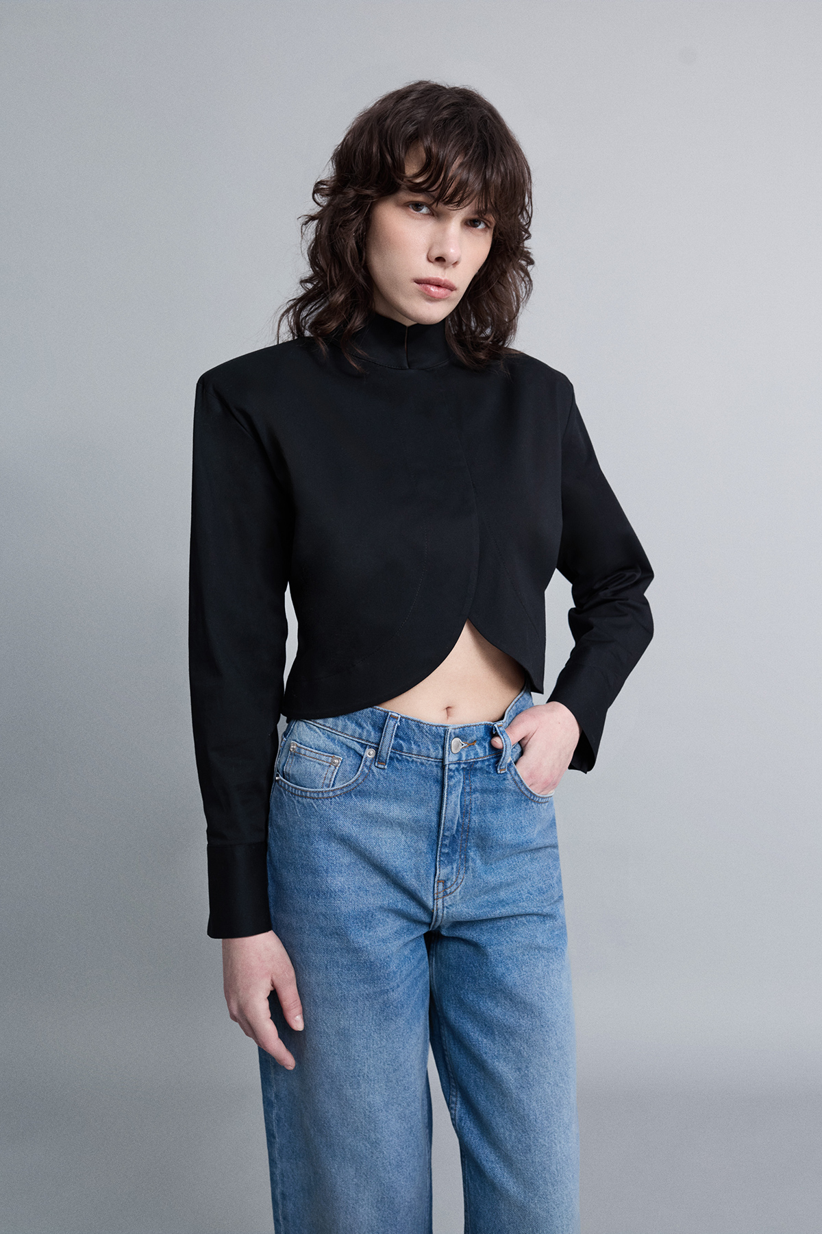 Crop kesim, modern silüet, dik yaka, çift düğme kapamalı, kavisli tasarım crop gömlek.