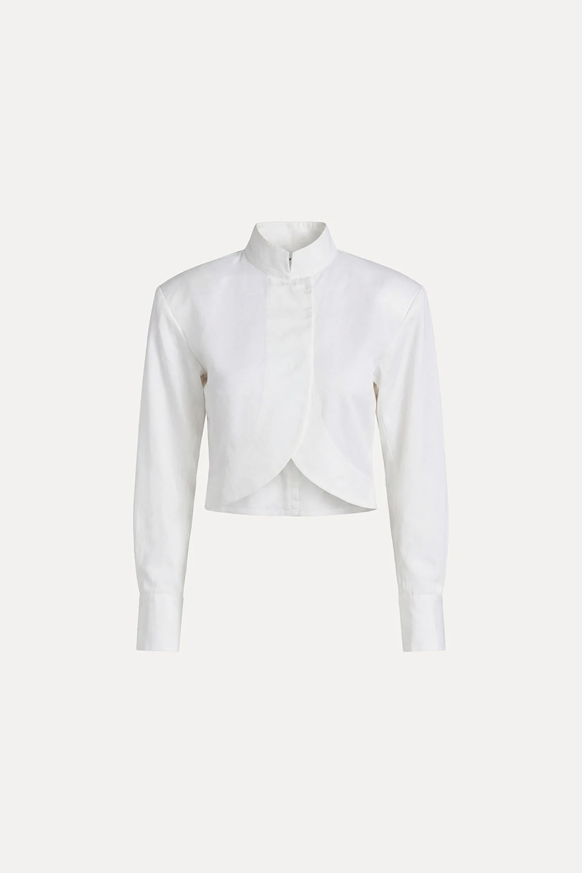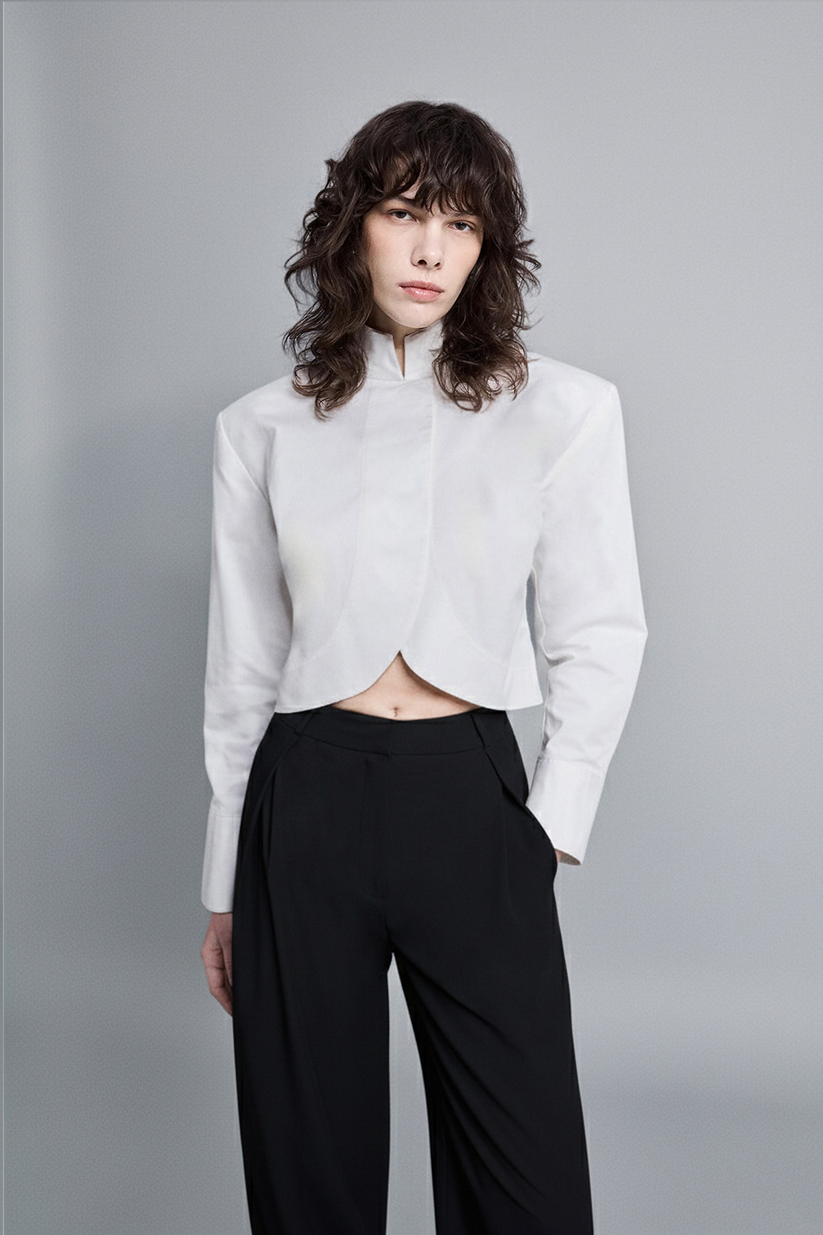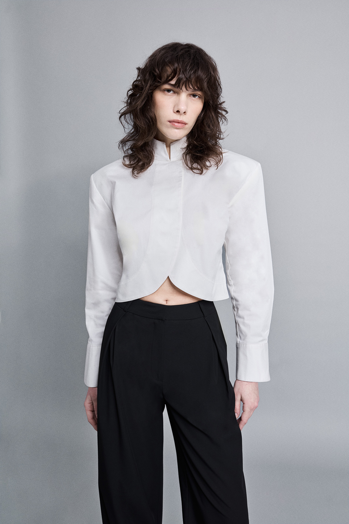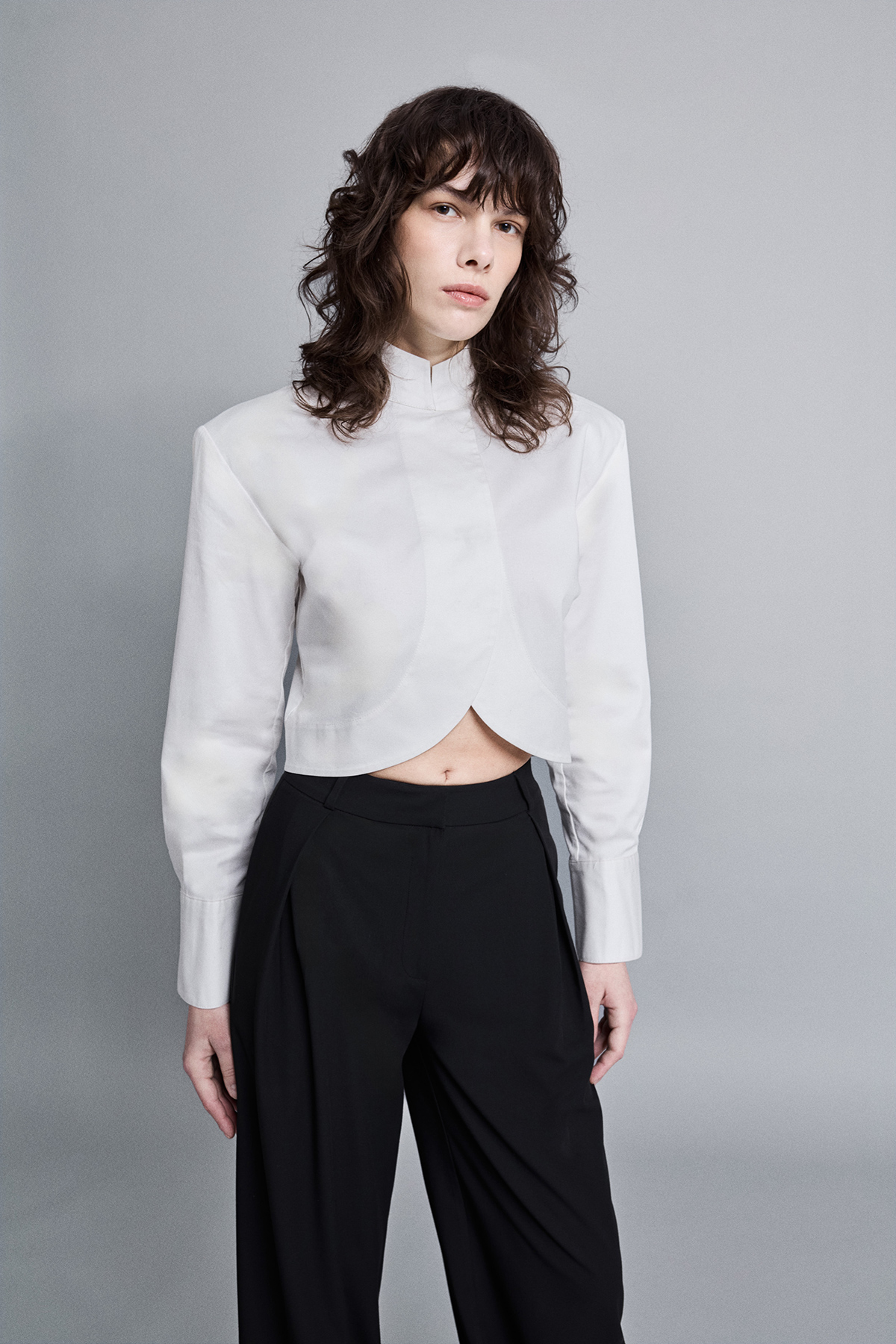 Crop kesim, modern silüet, dik yaka, çift düğme kapamalı, kavisli tasarım crop gömlek.