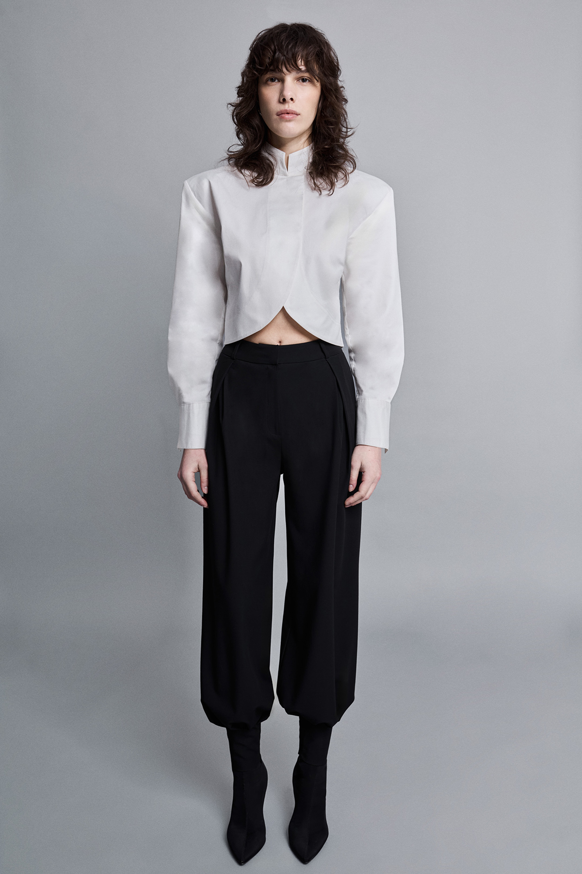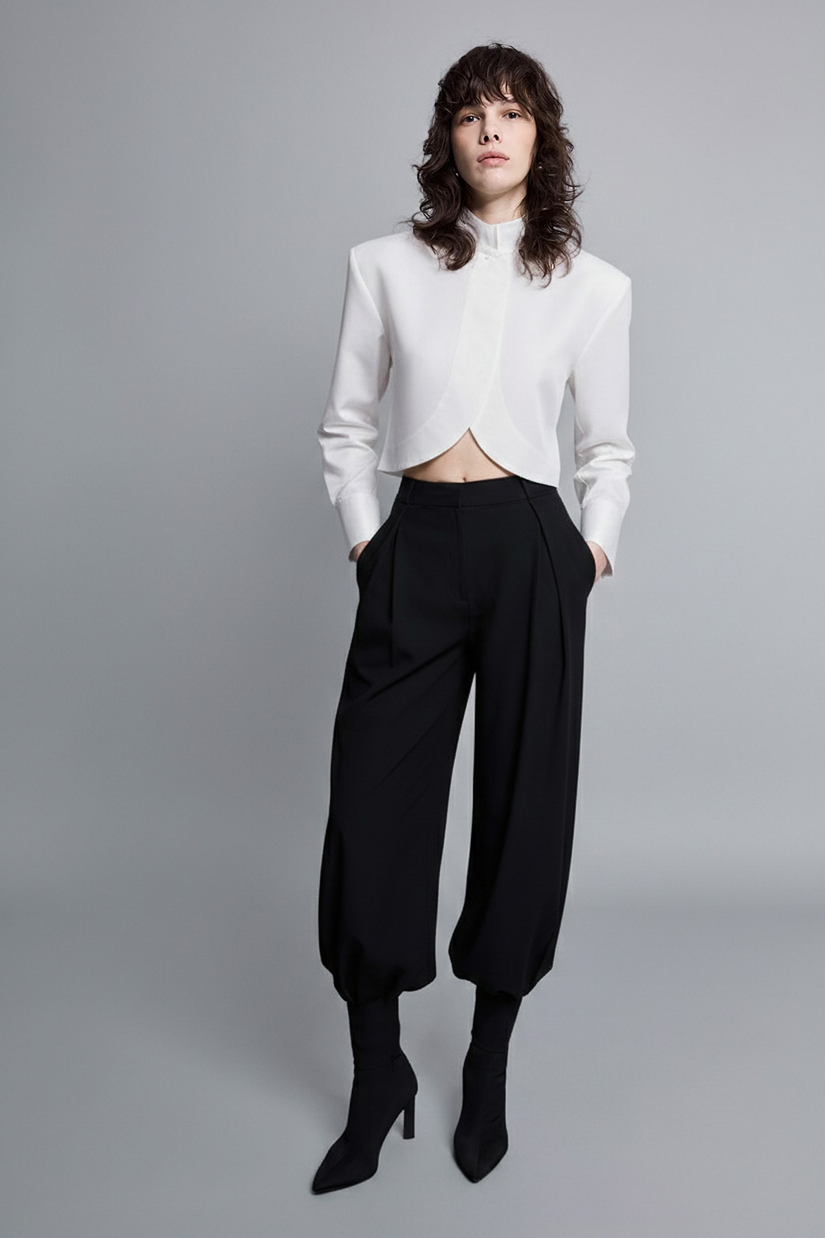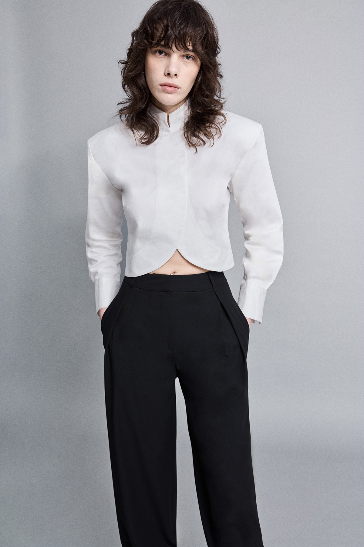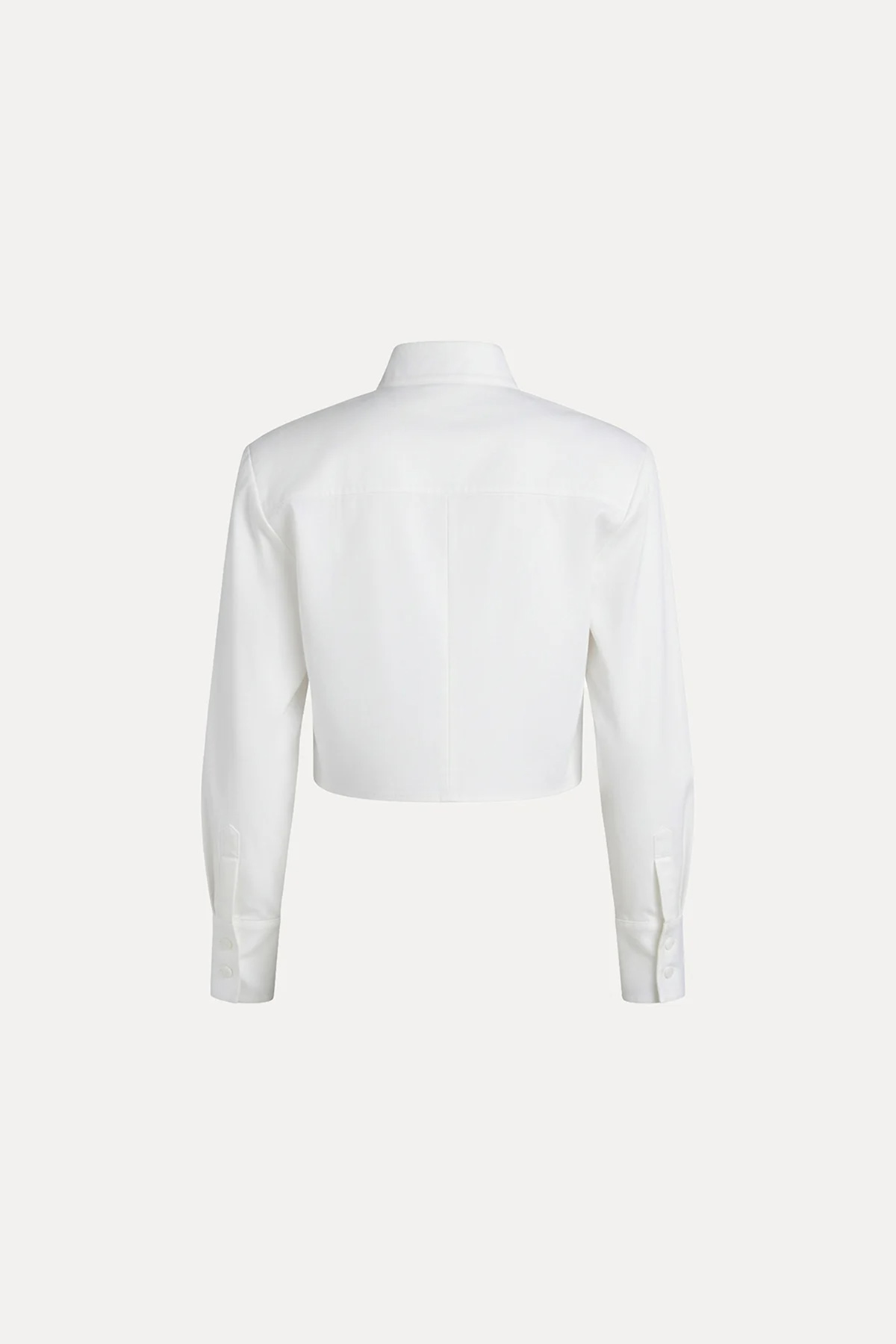 Crop kesim, modern silüet, dik yaka, çift düğme kapamalı, kavisli tasarım crop gömlek.