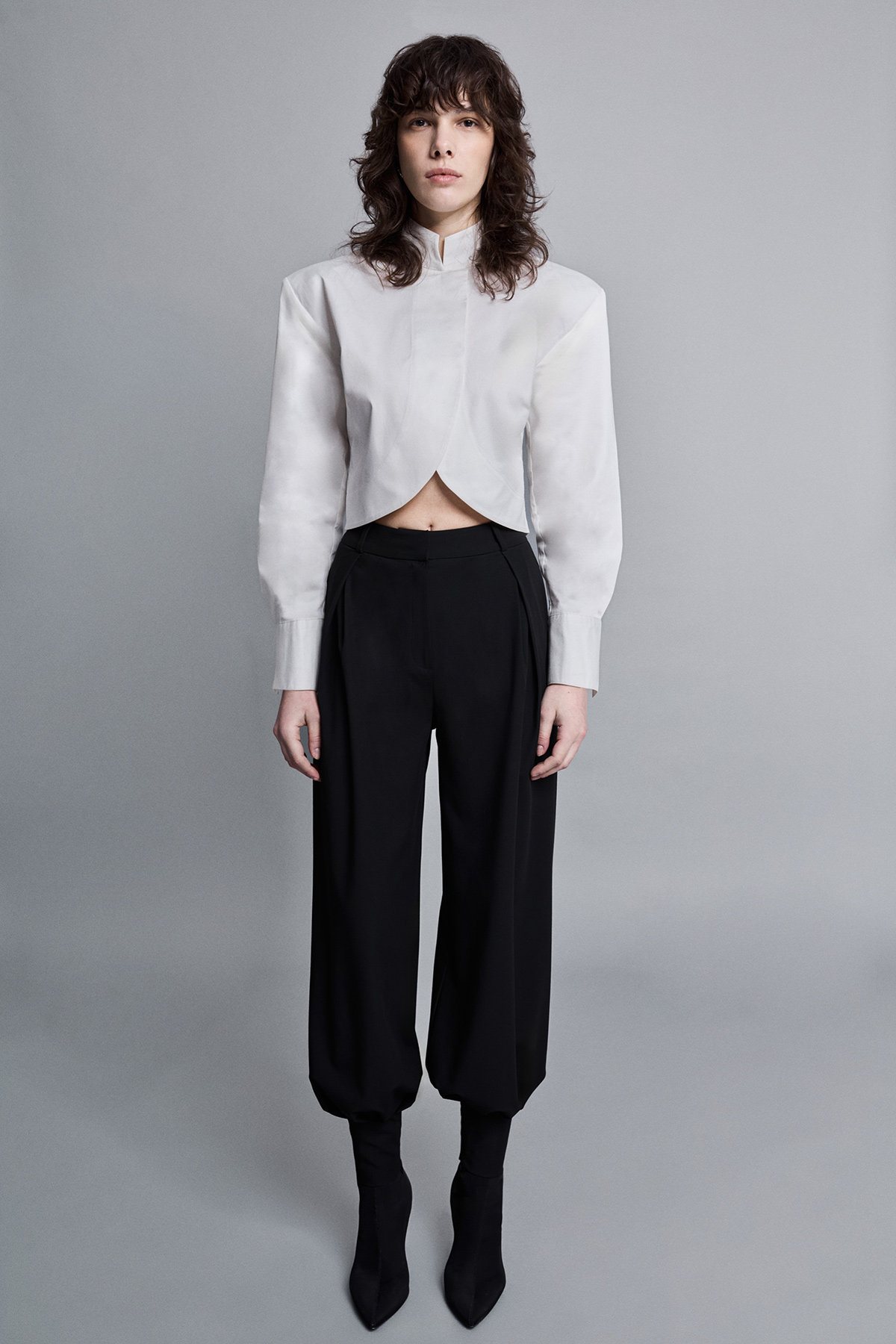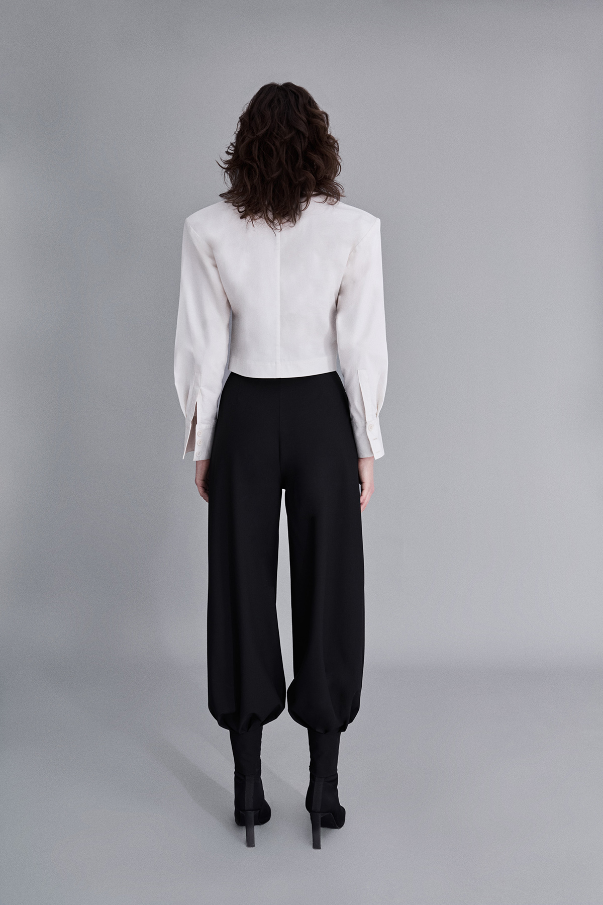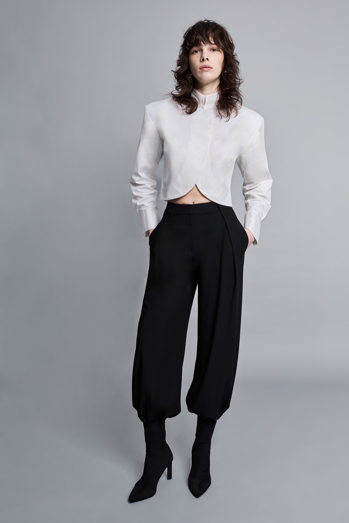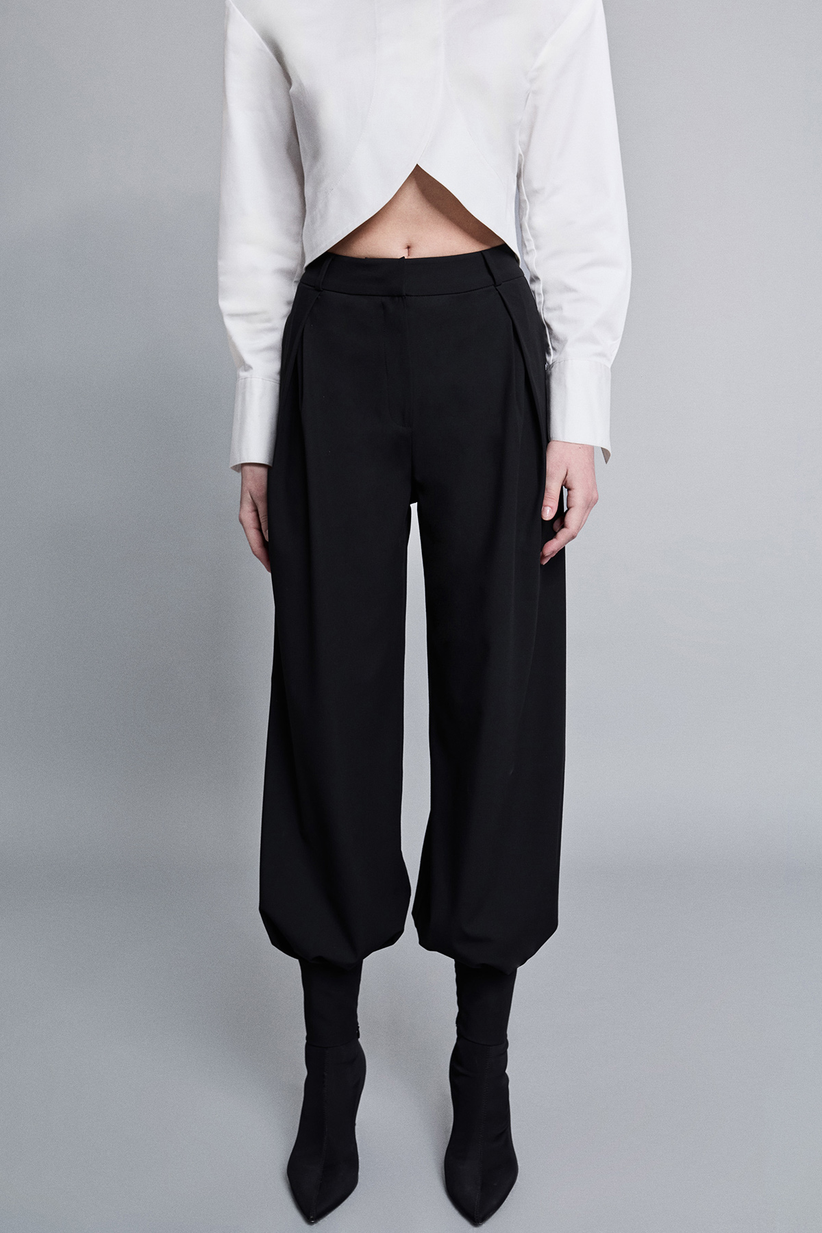 Yüksek bel, geniş formlu, düğme ve fermuar kapamalı, çift cepli, pile detaylı, şalvar pantolon.