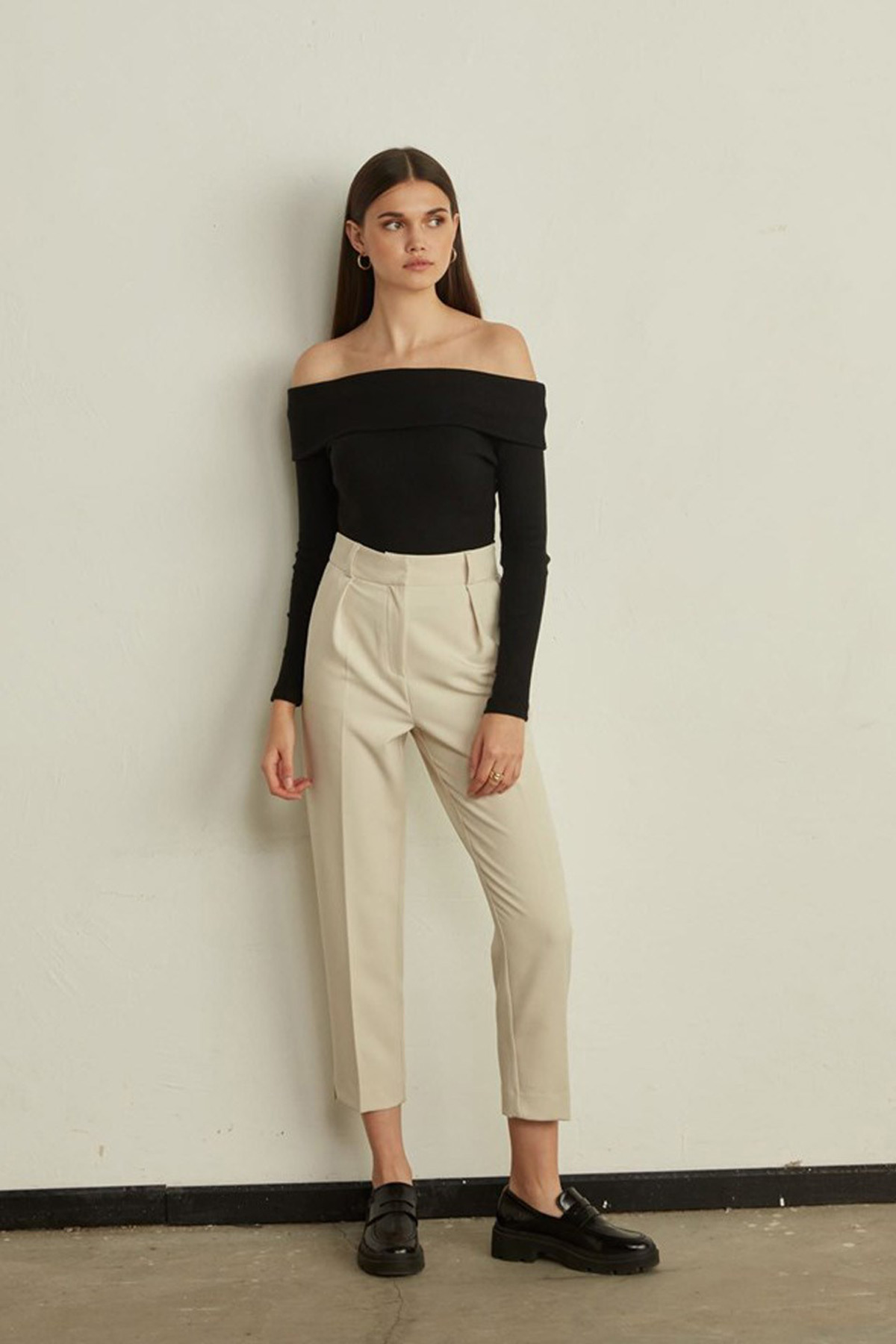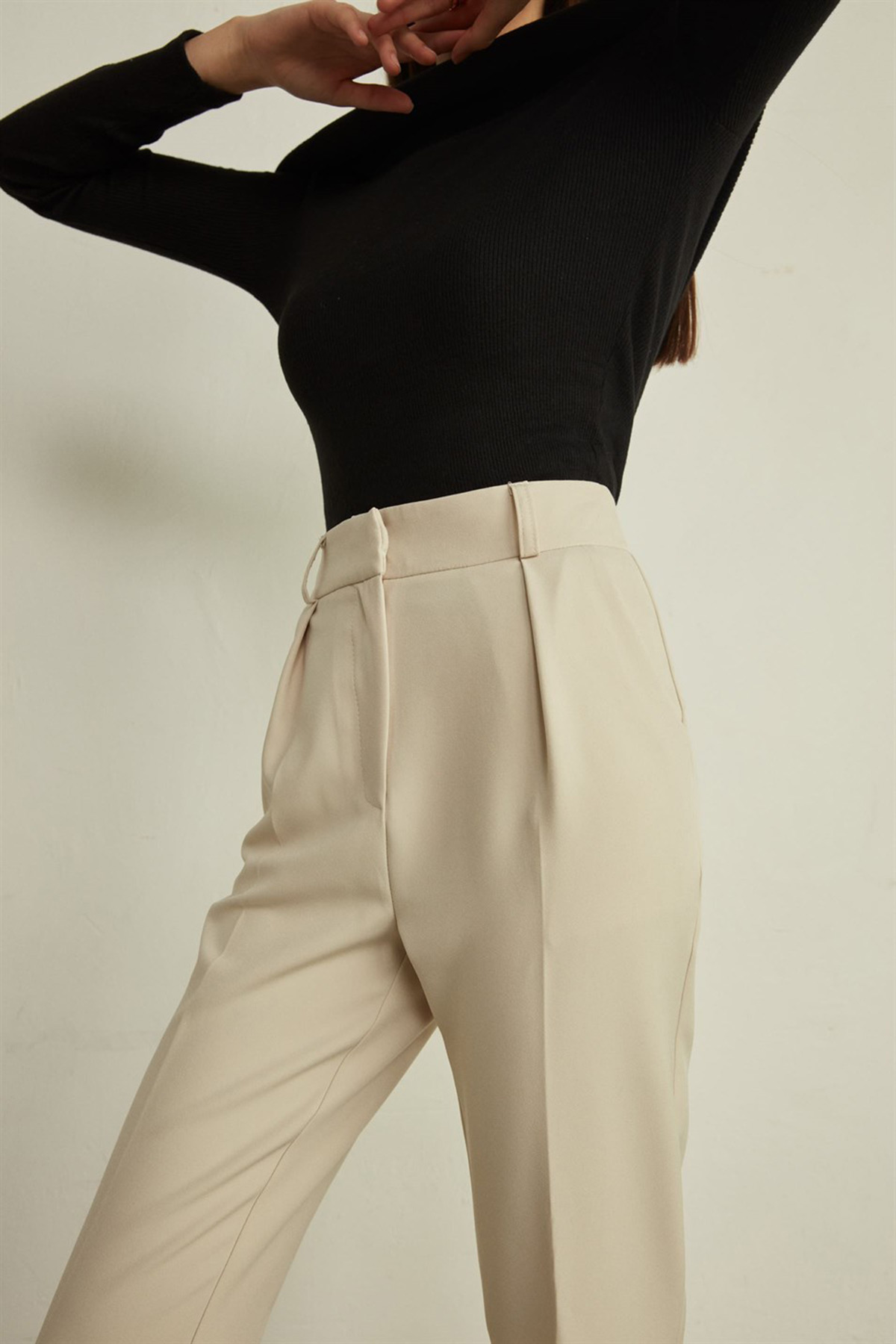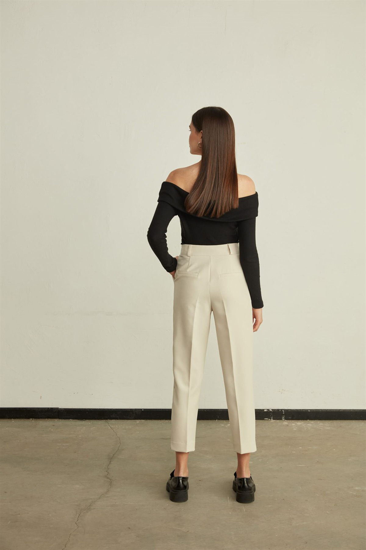 Yüksek bel, 2 ön cepli, arkası sahte cepli, tek pensli ve gizli düğmeli, her iki paçası kesik detaylı palazzo pantolon.