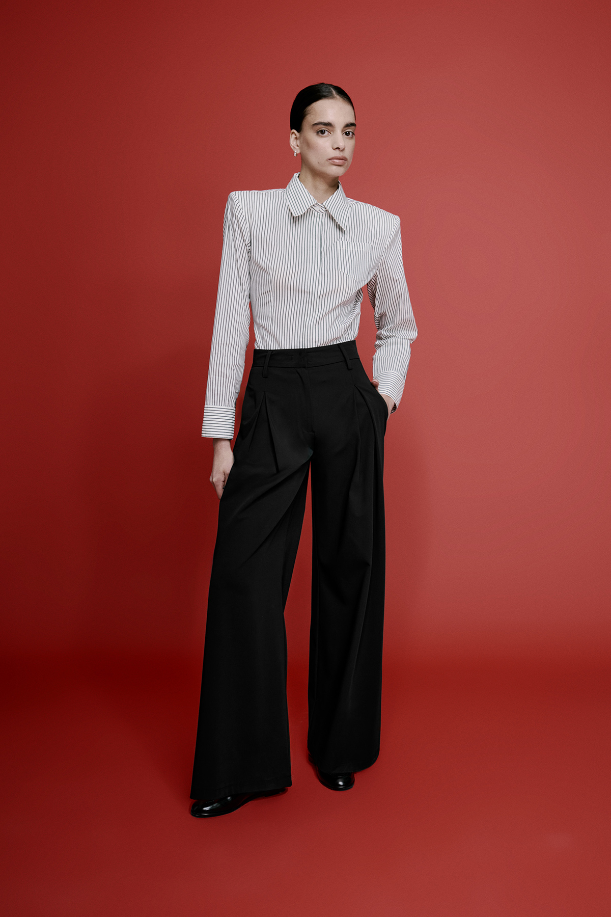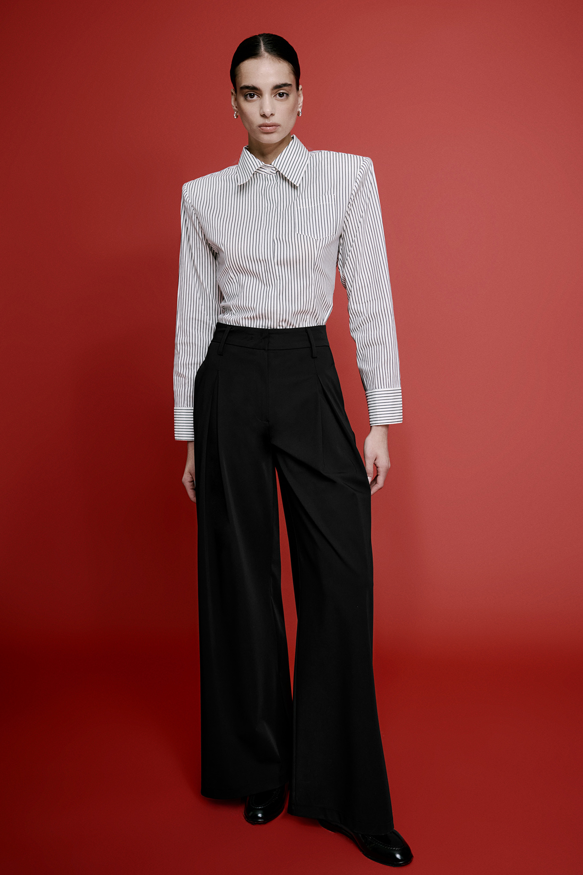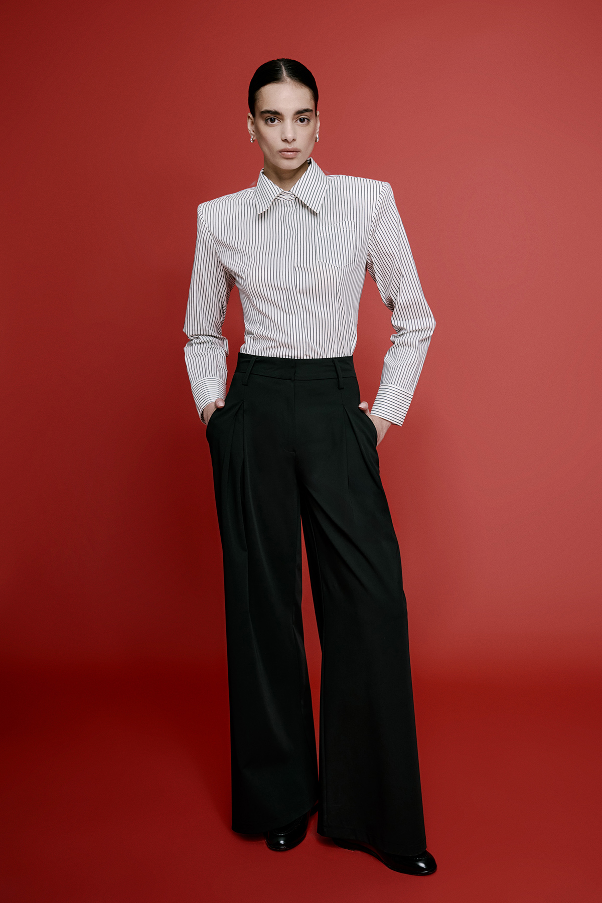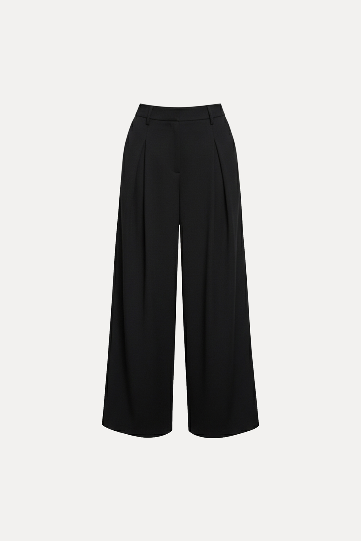 Yüksek bel, önden klips ve fermuar kapamalı, pileli, yanlardan çift cepli, bol paça pantolon.