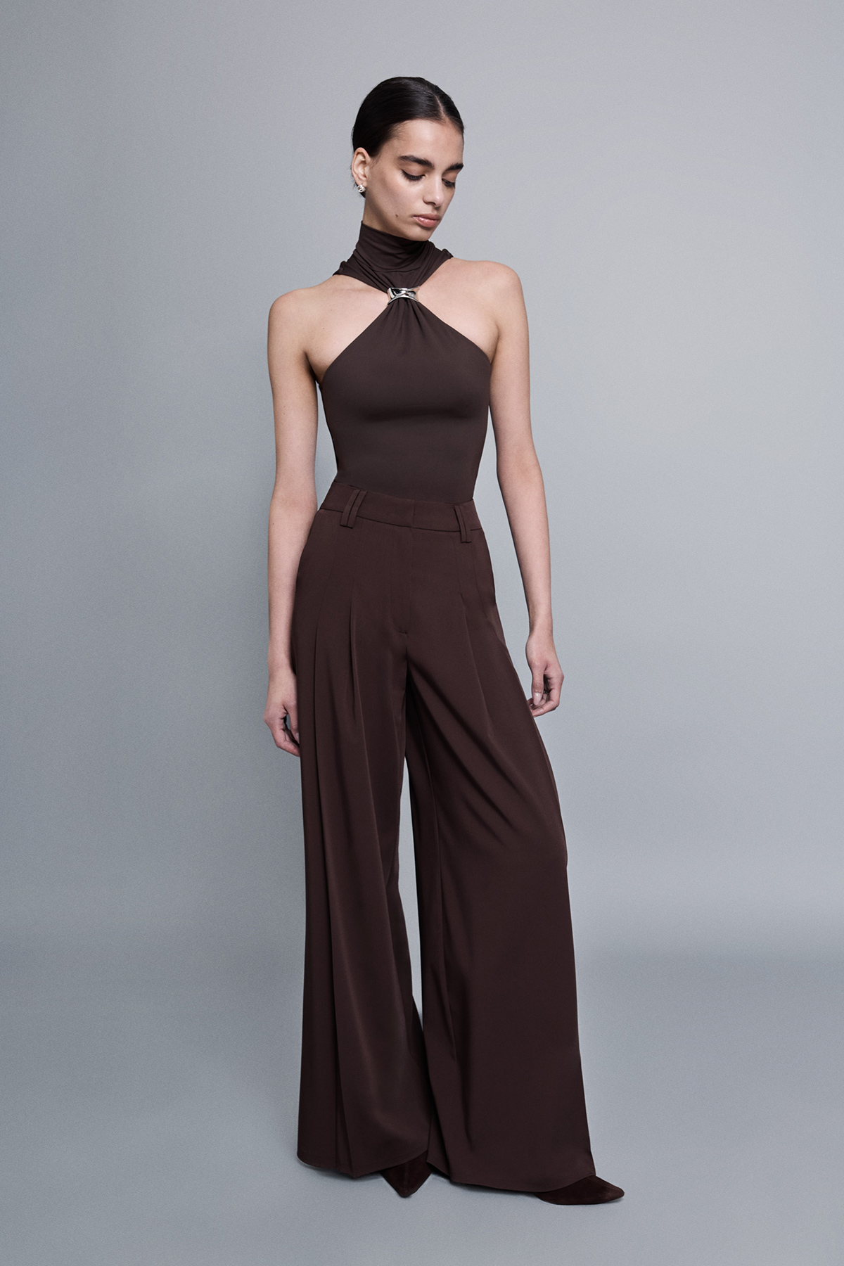 Yüksek bel, önden klips ve fermuar kapamalı, pileli, yanlardan çift cepli, bol paça pantolon.