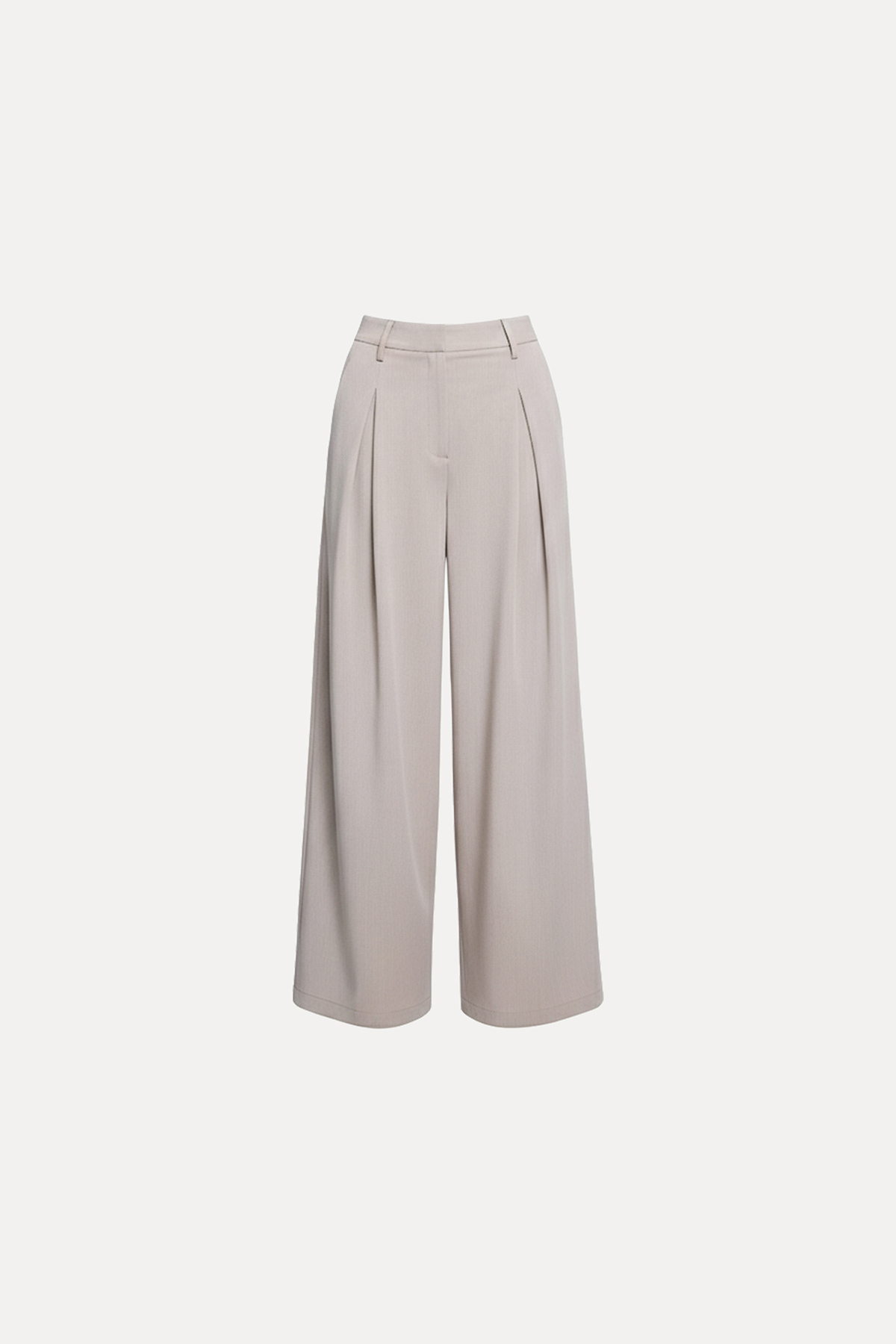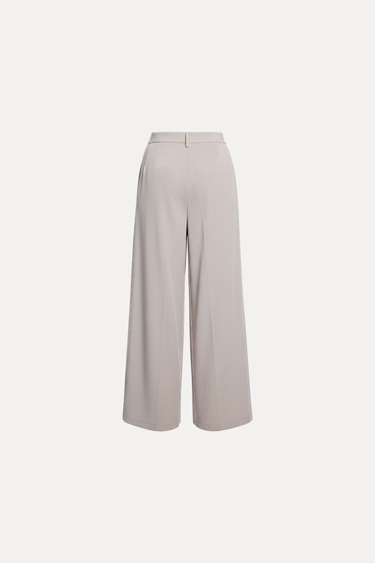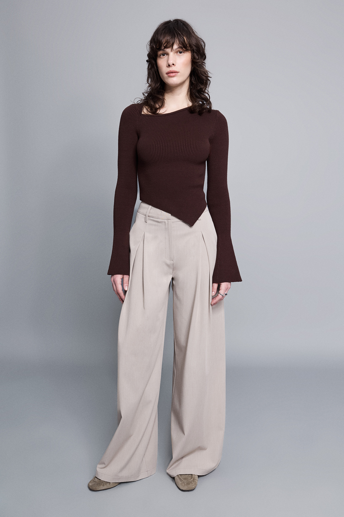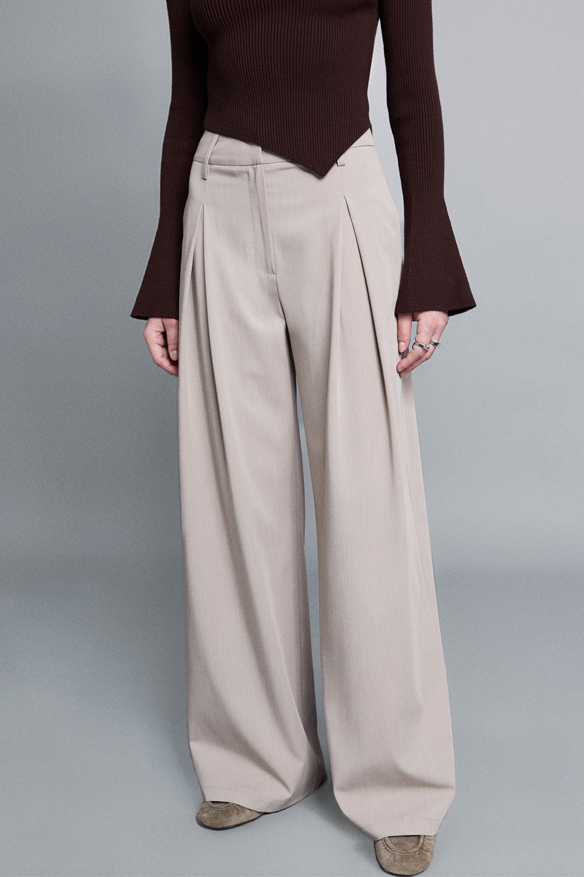 Yüksek bel, önden klips ve fermuar kapamalı, pileli, yanlardan çift cepli, bol paça pantolon.