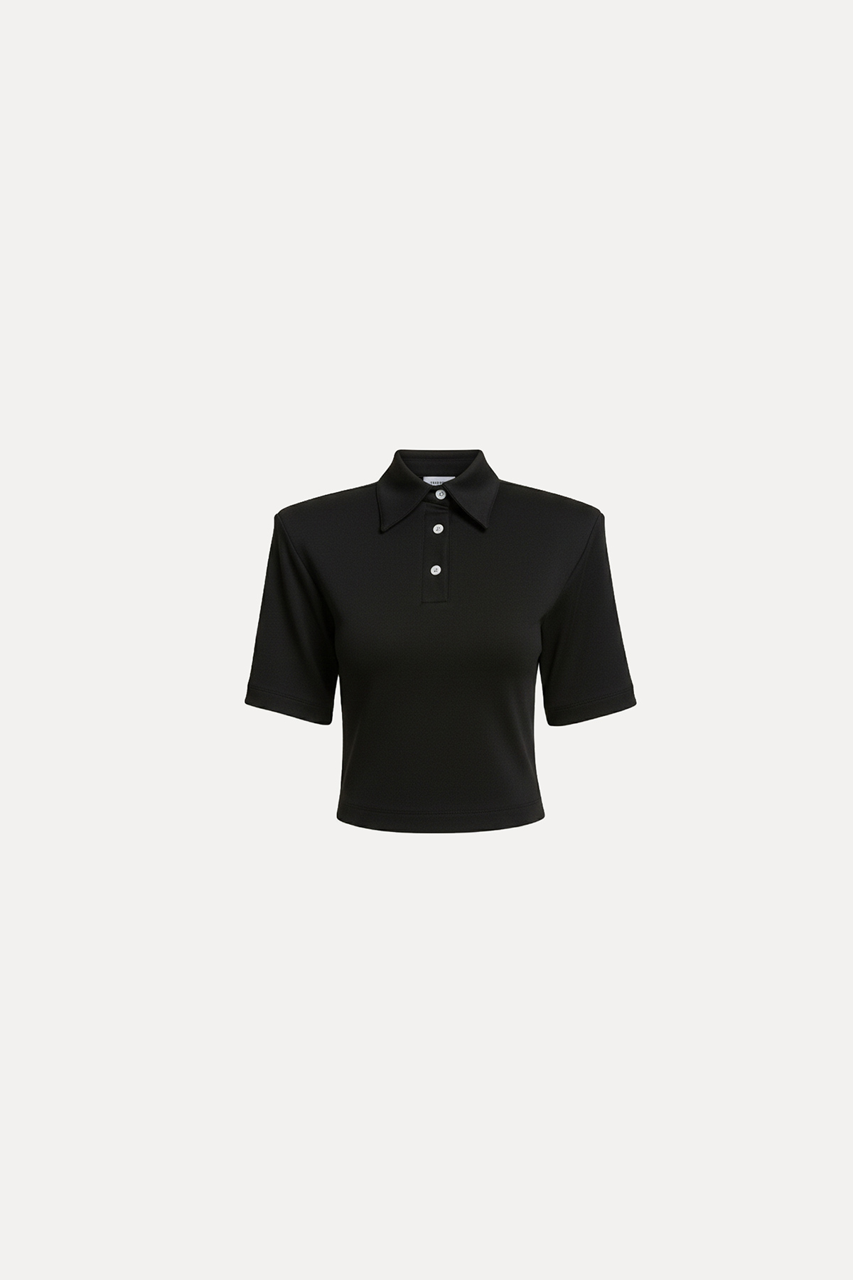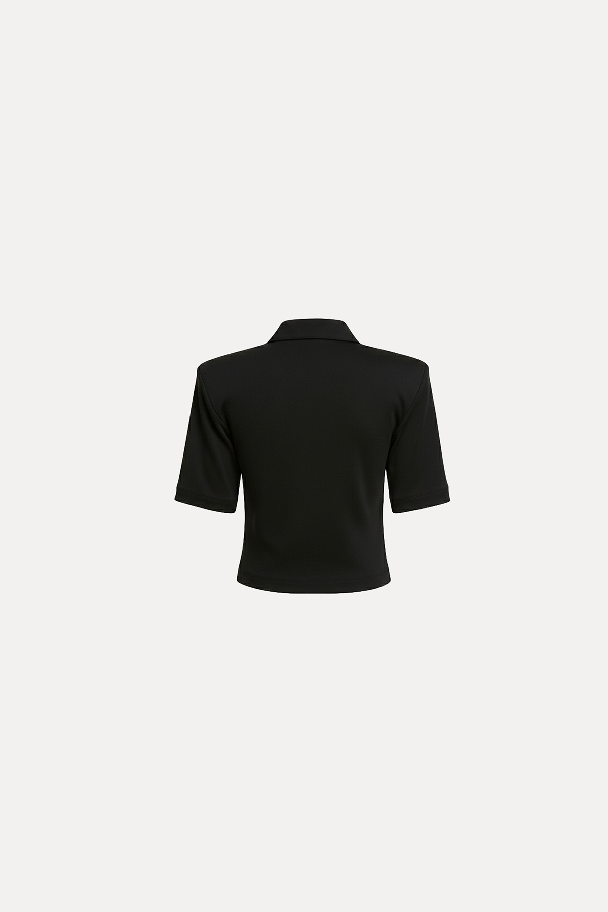 Polo yaka, esnek kumaş, kısa kollu, vatkalı, regular kalıp bluz.