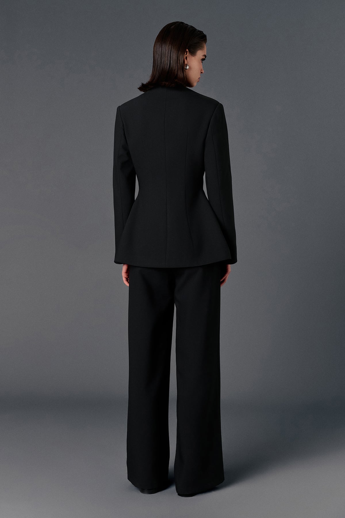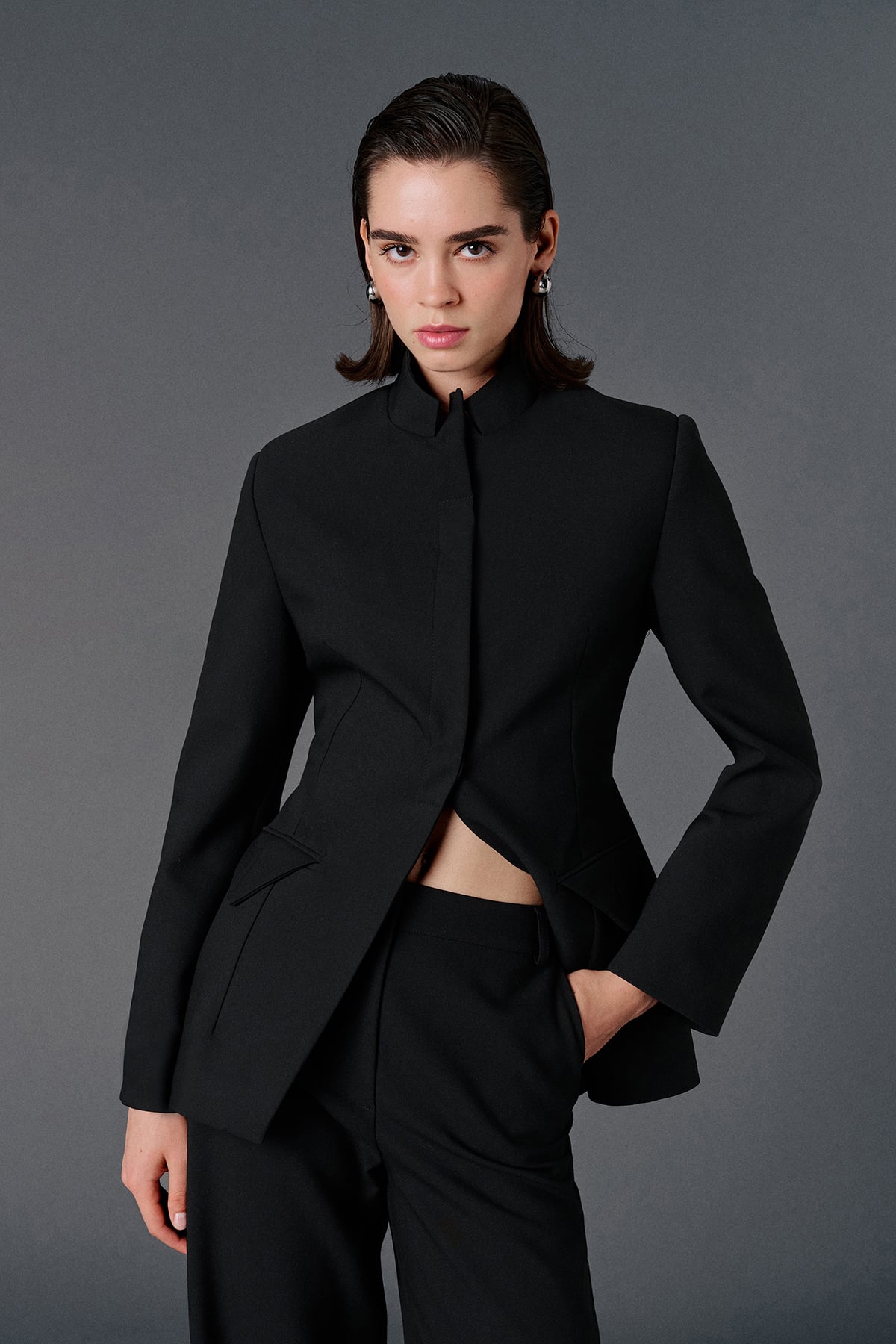 Vatkalı, iki adet işlevsiz cep aksesuarlı, gizli patlı, düğmeli, uzun kollu, astarlı,vücuda oturan blazer ceket