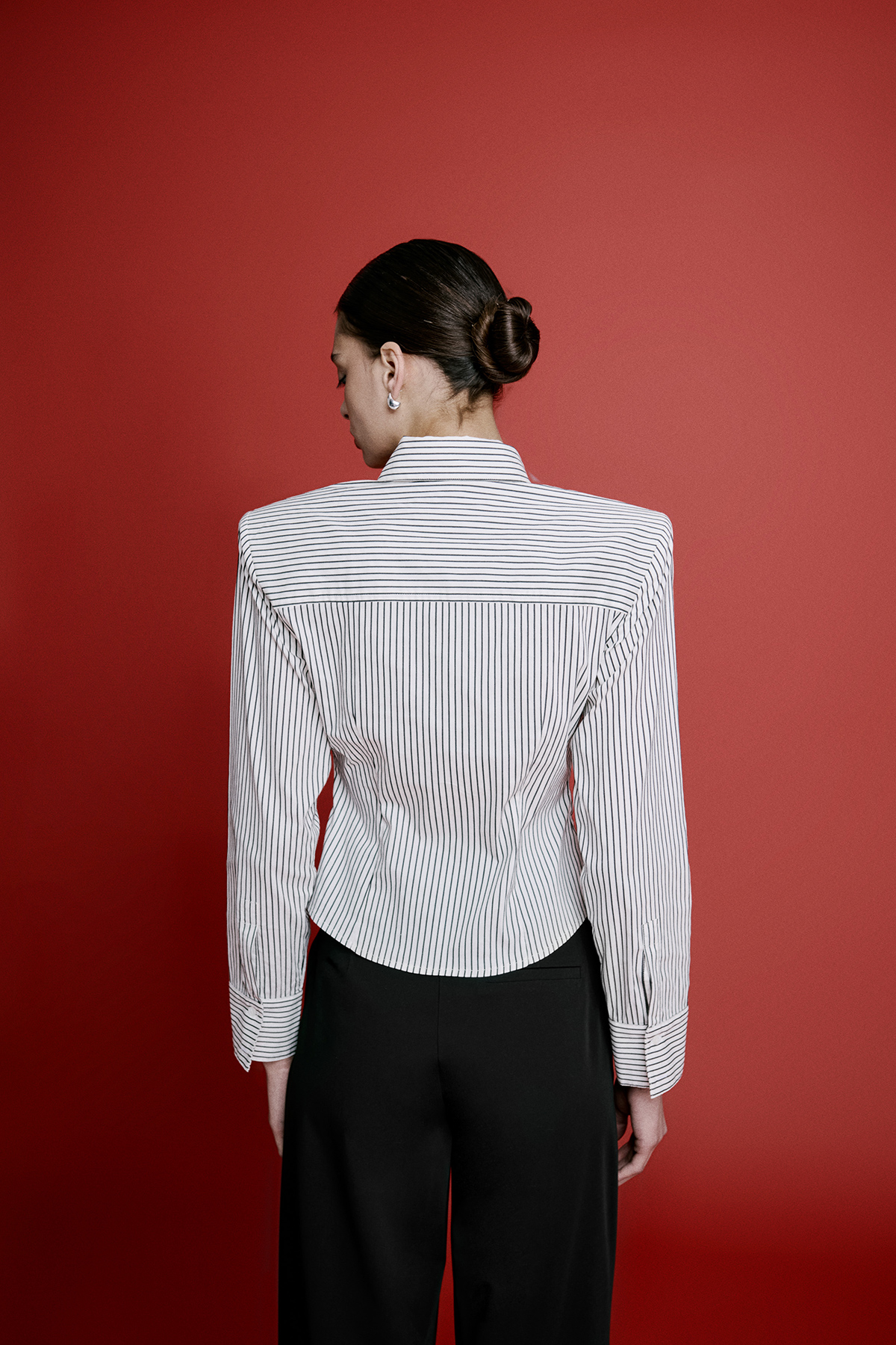 Gizli pat kapamalı, manşeti çift düğmeli, vücuda oturan gömlek.