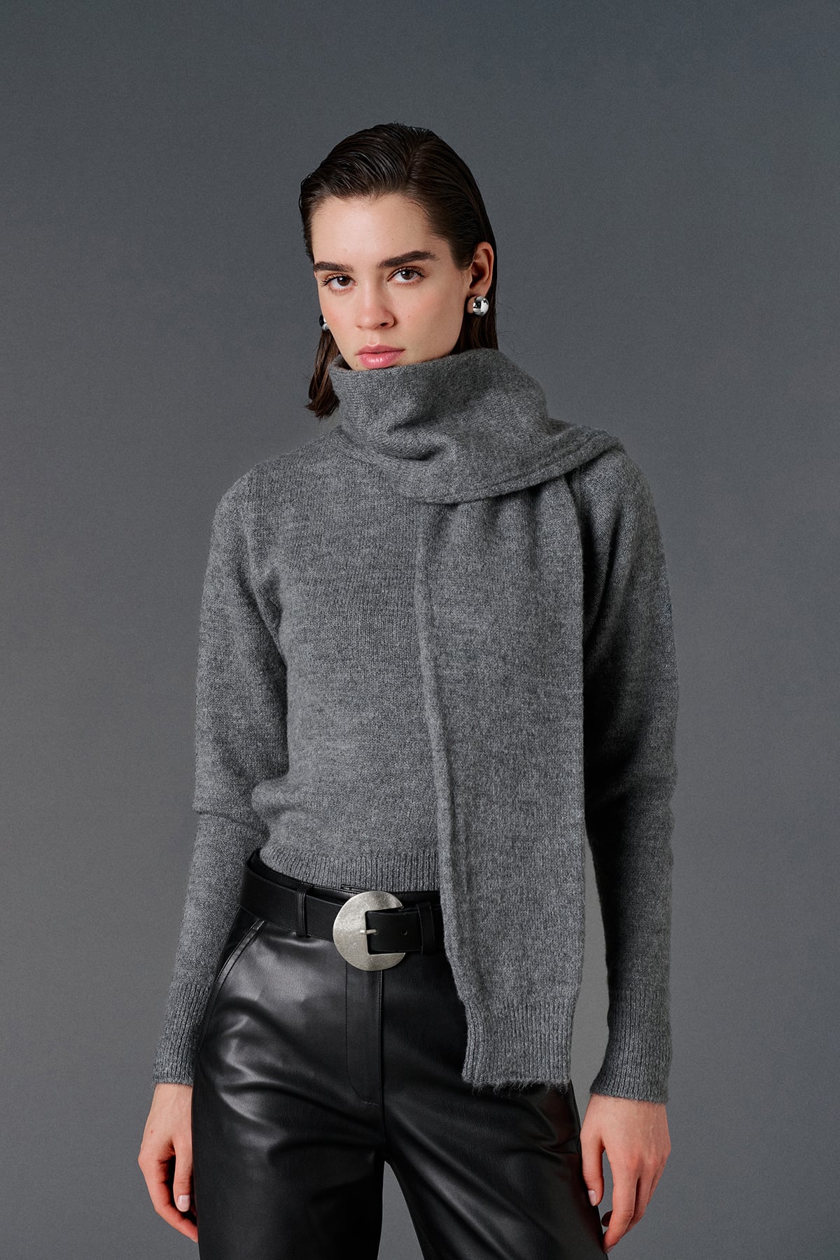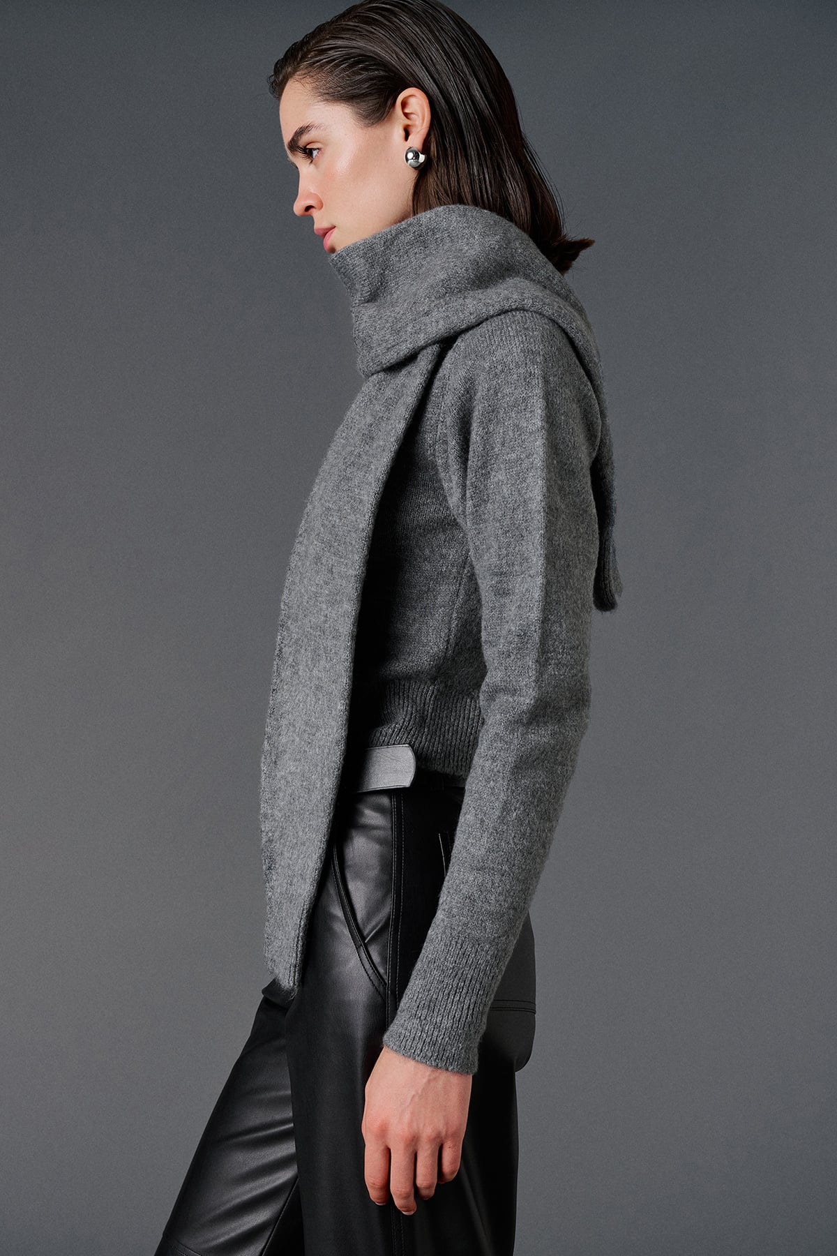 Şal yaka, asimetrik kesim, yandan yırtmaçlı, regular kazak.