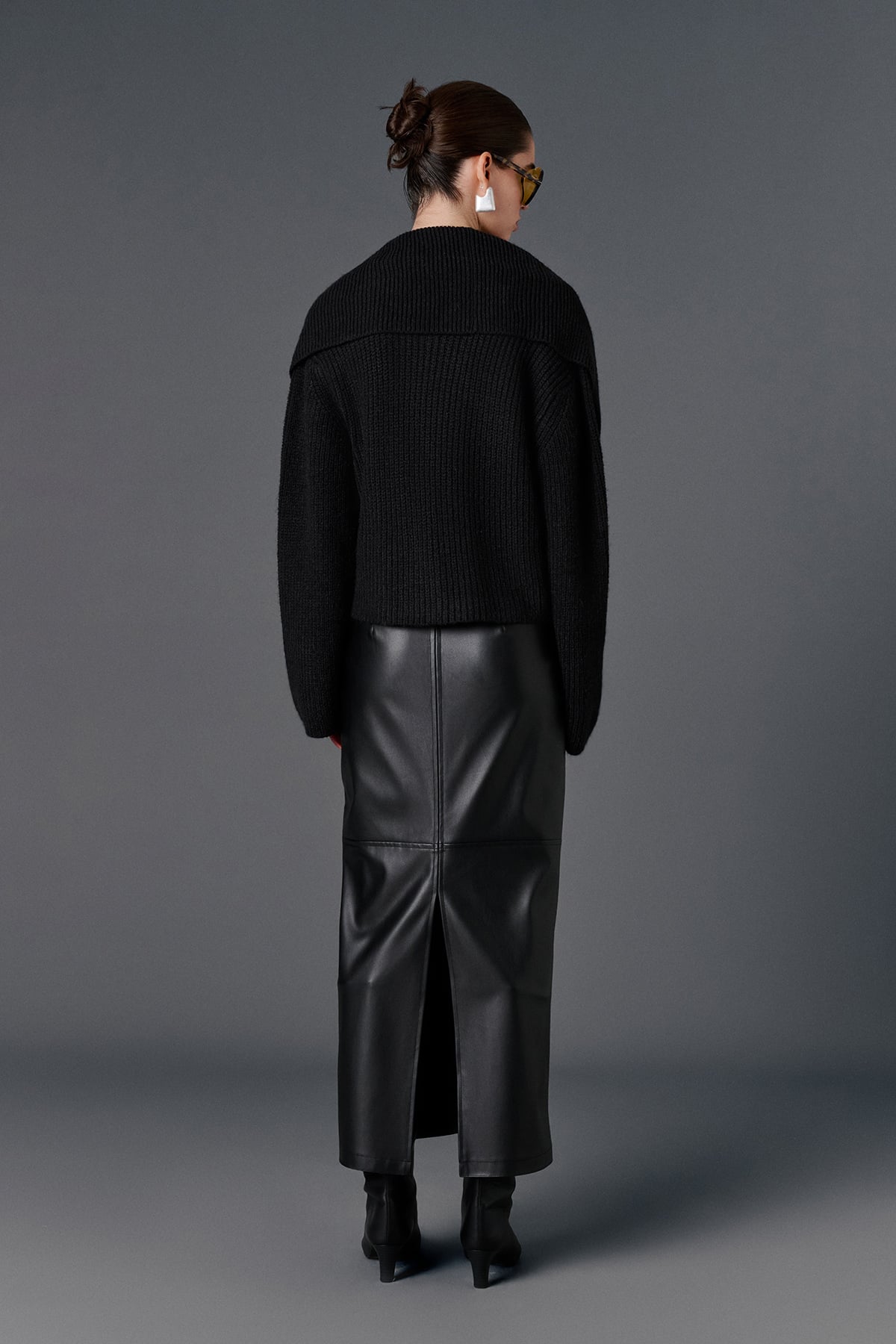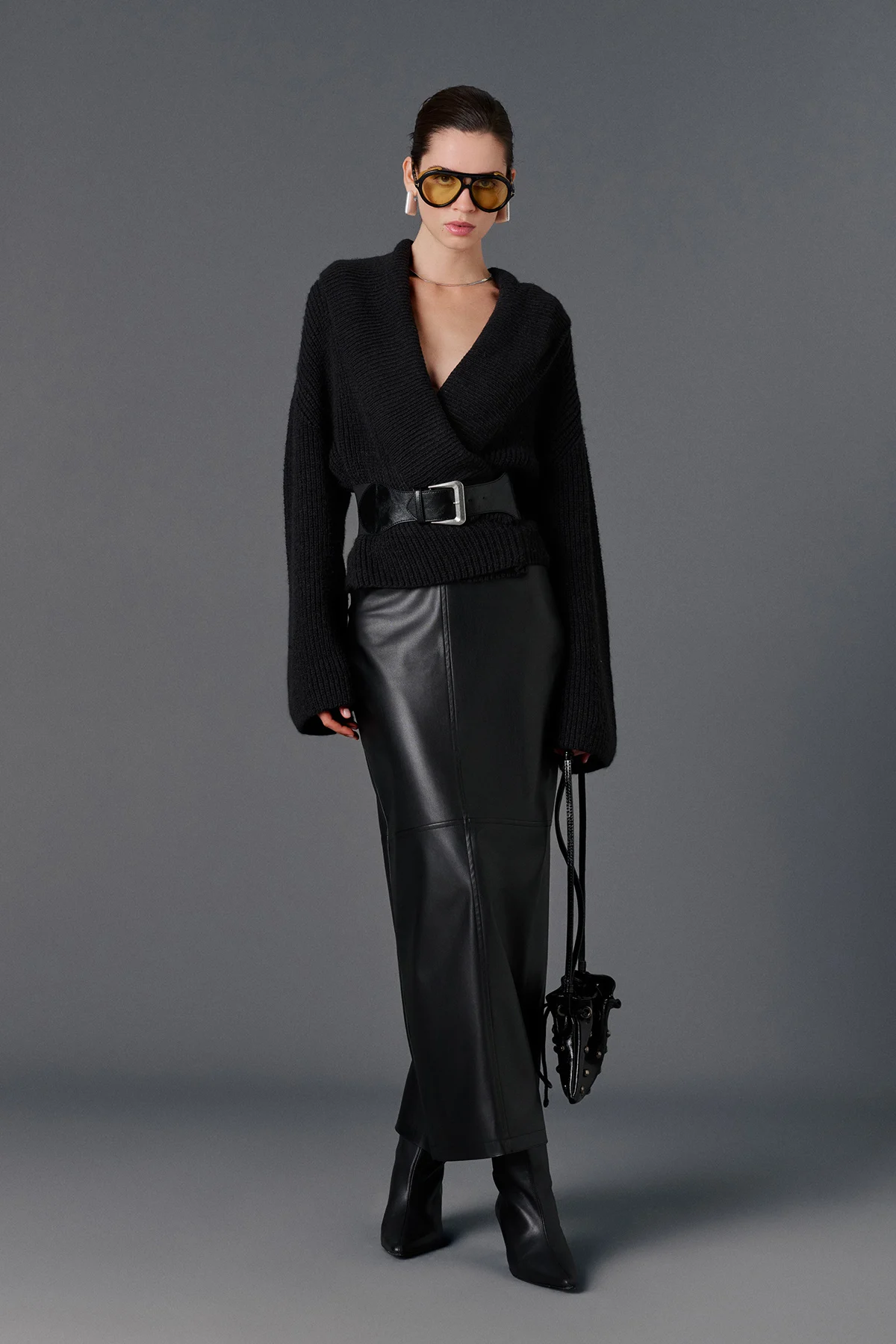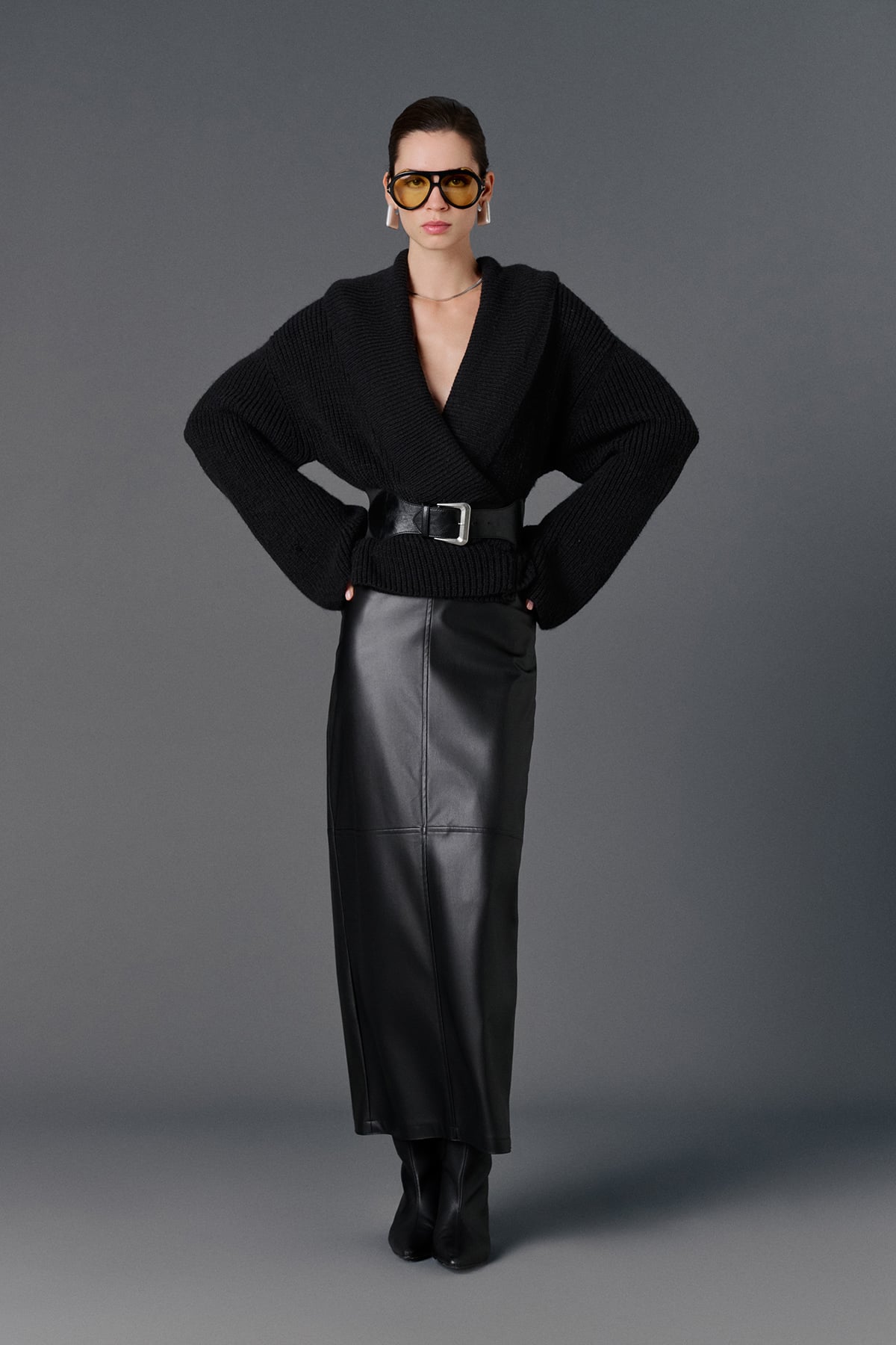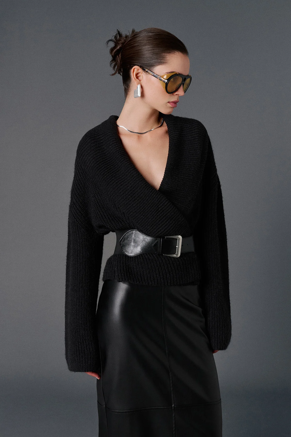 Şal yaka, önü kruvaze, geniş kollu oversize kazak