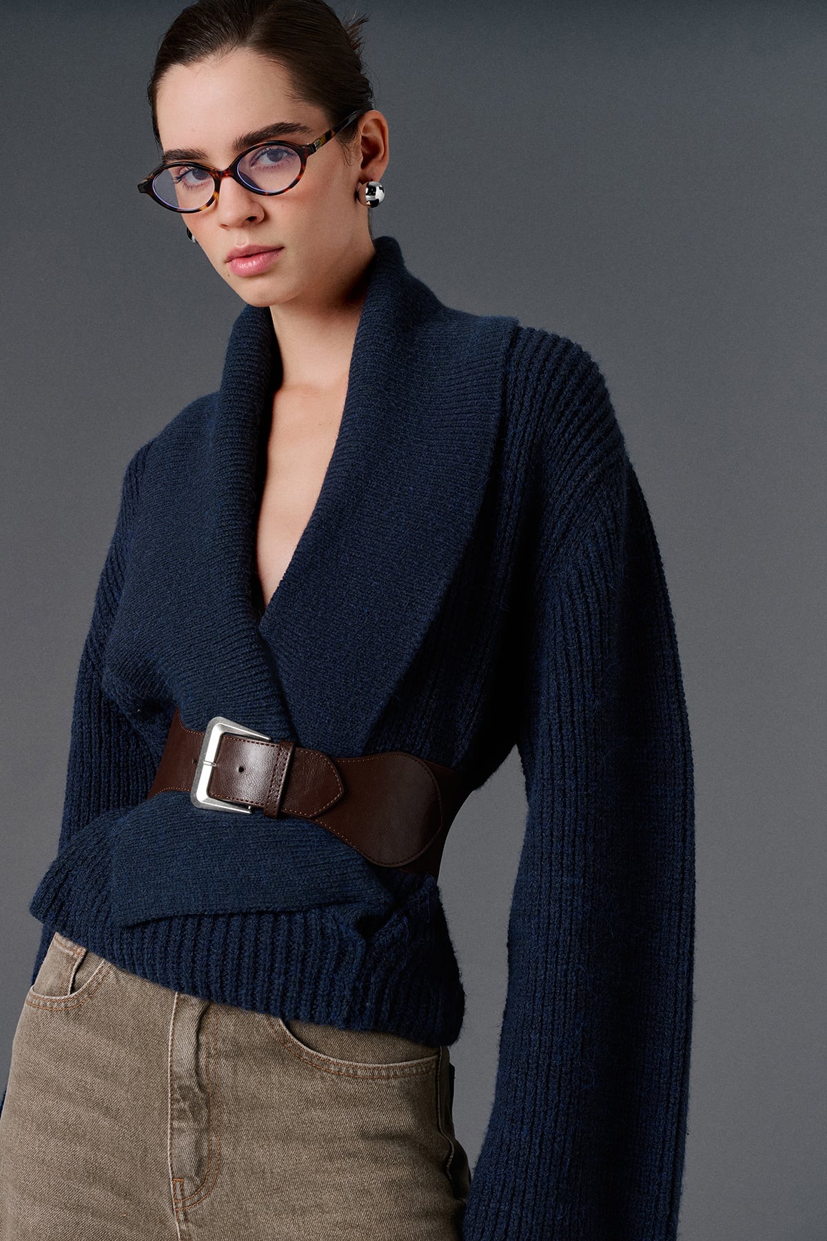 Şal yaka, önü kruvaze, geniş kollu oversize kazak
