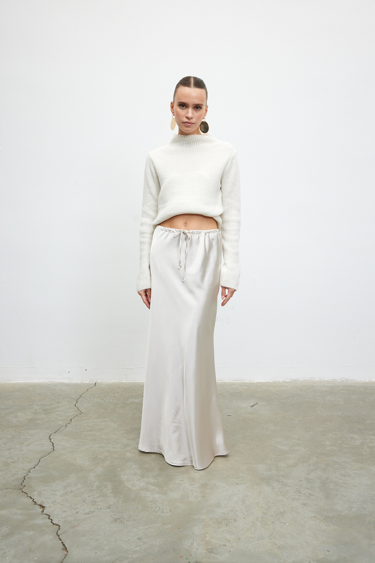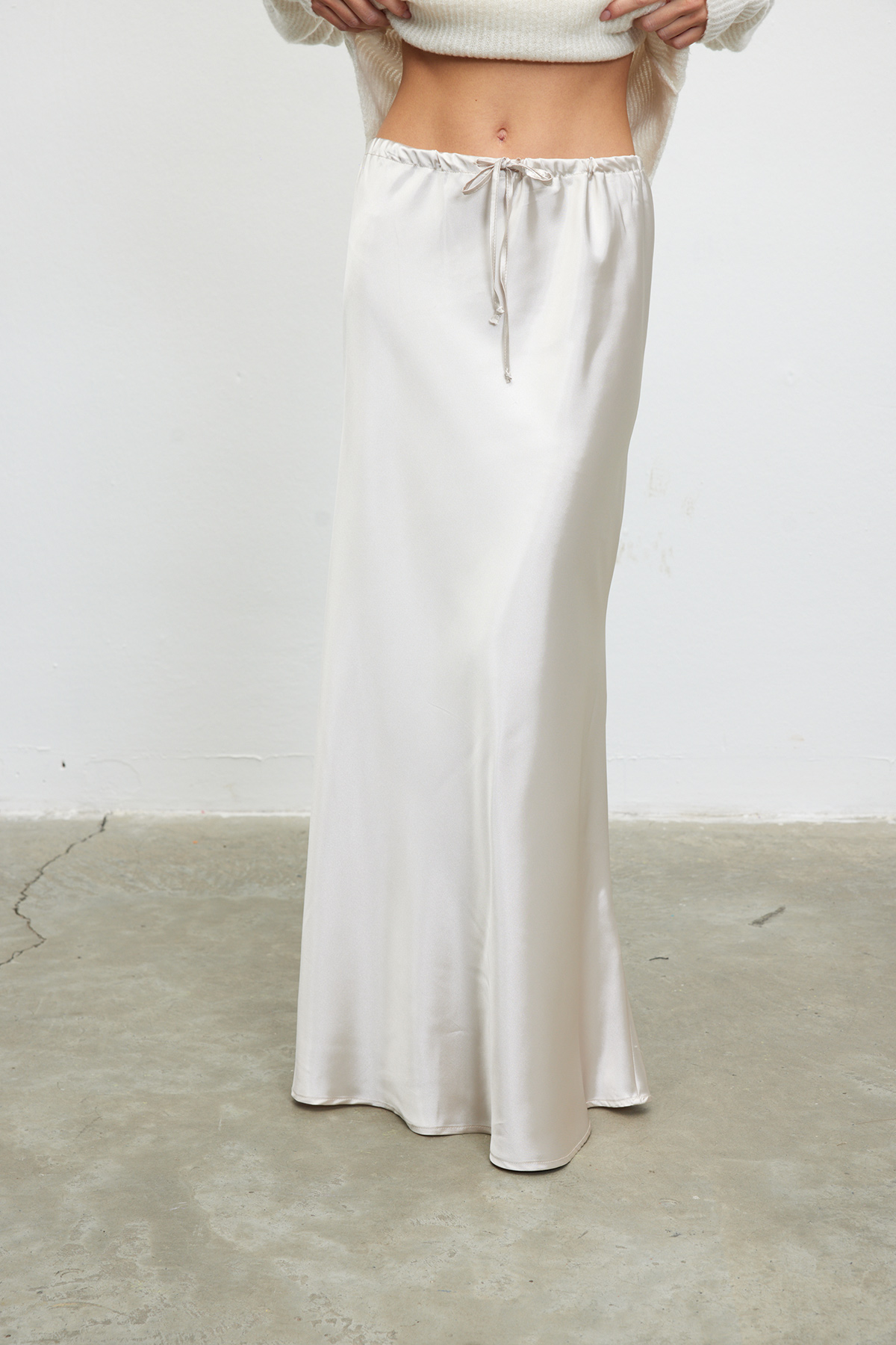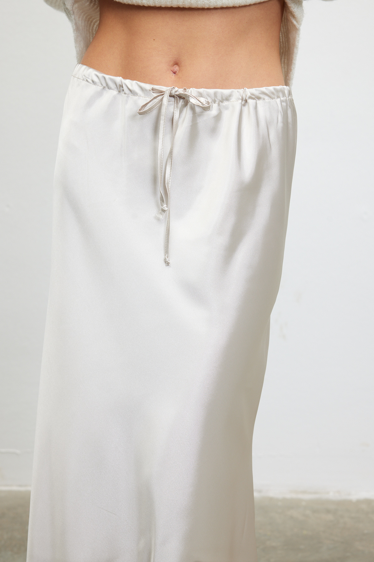 Belden bağlamalı, iç göstermeyen, tam kalıp saten etek
