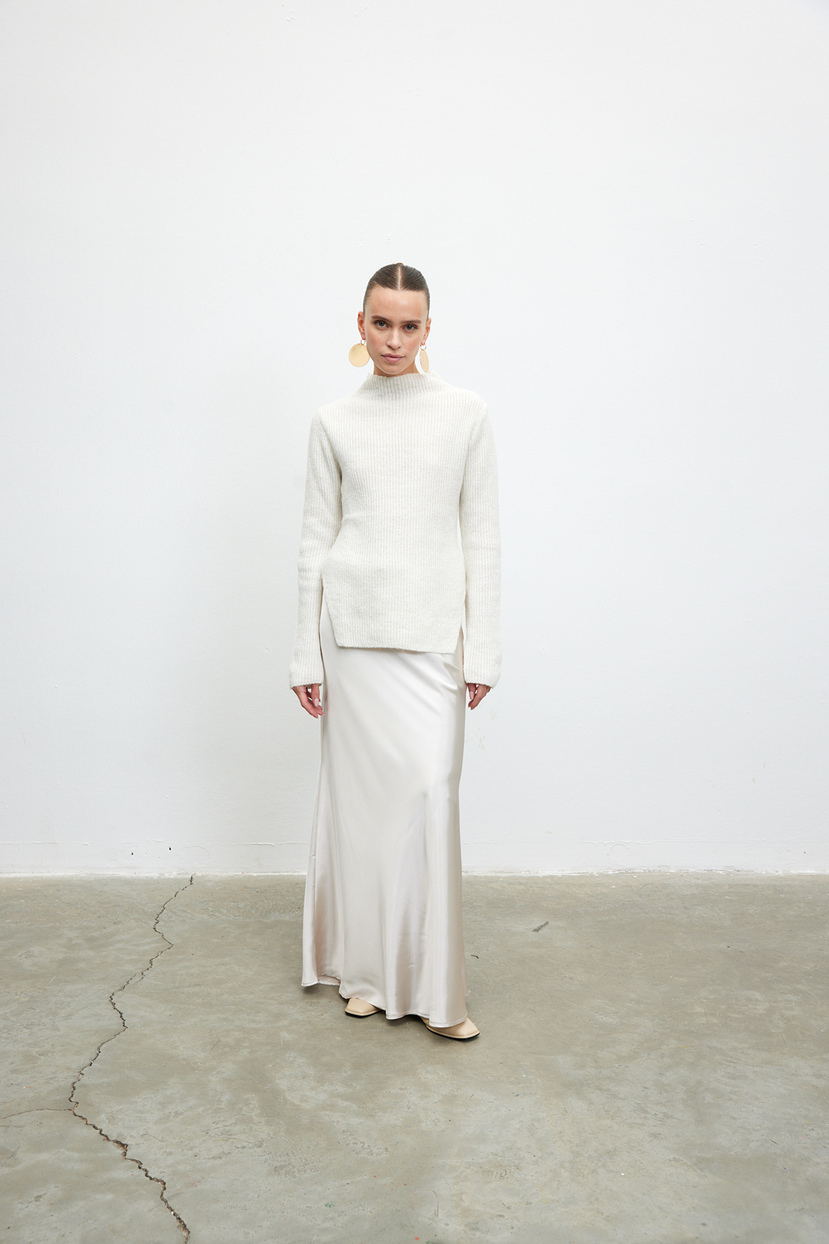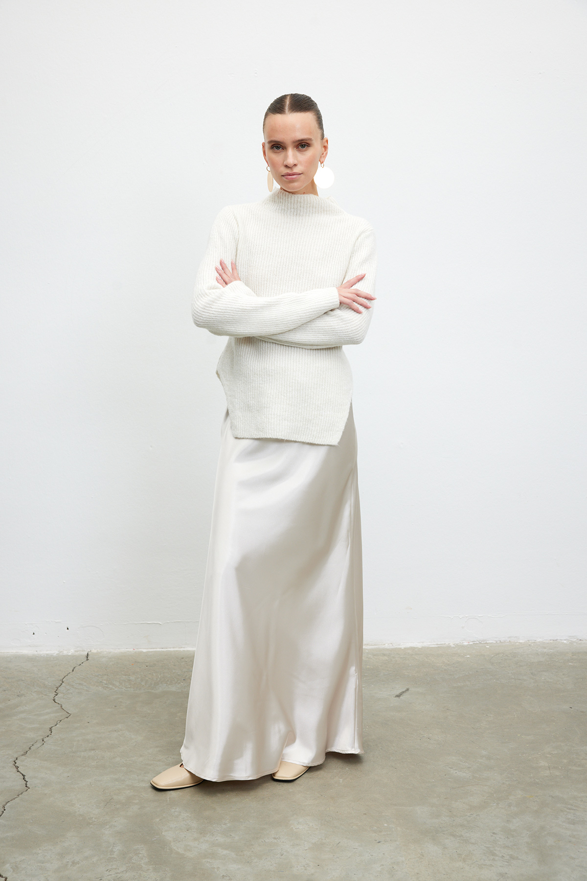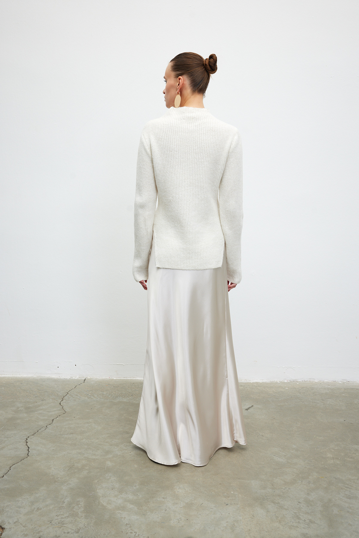 Belden bağlamalı, iç göstermeyen, tam kalıp saten etek