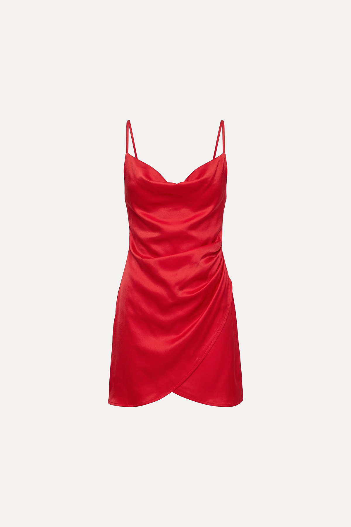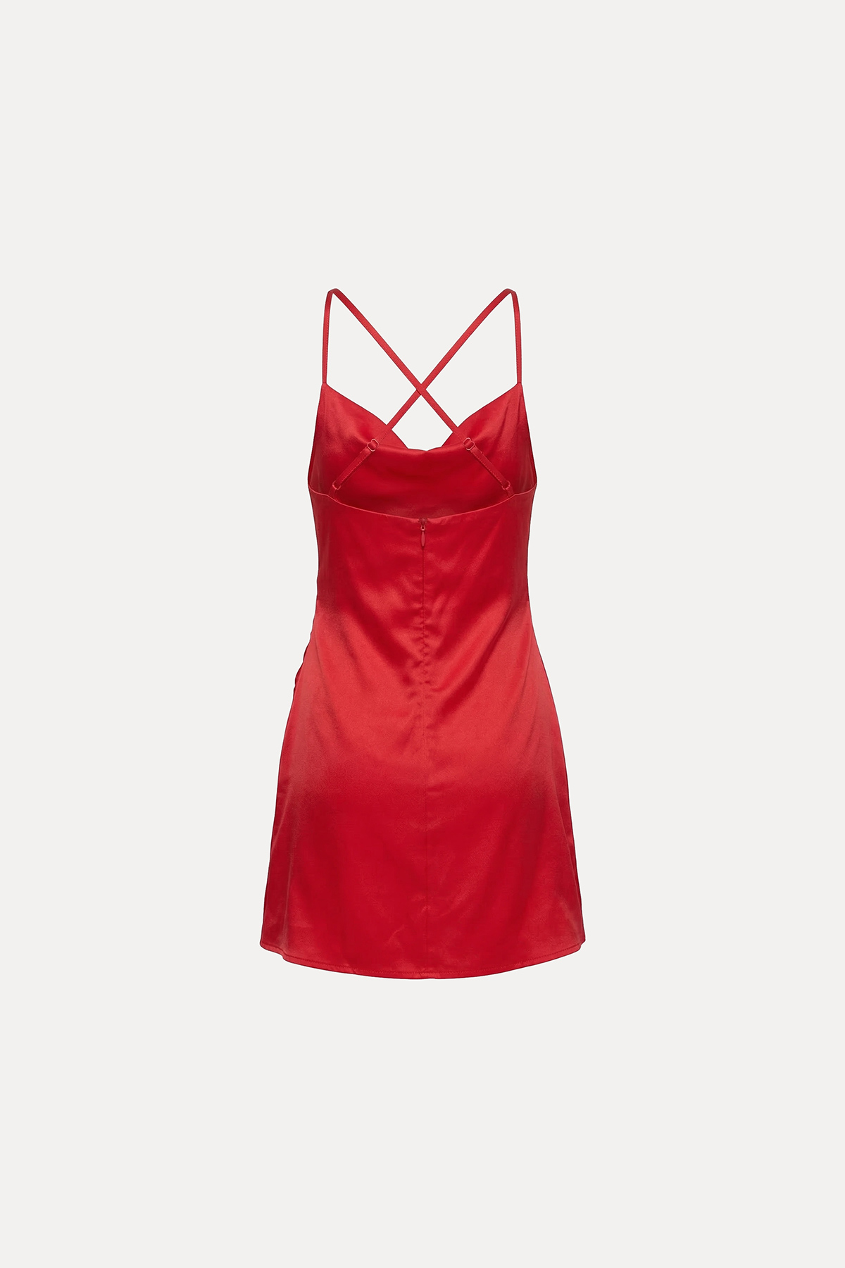Degaje yaka, arkası çapraz gelen ayarlanabilir ince askılı, büzgülü detaylı,saten mini elbise.