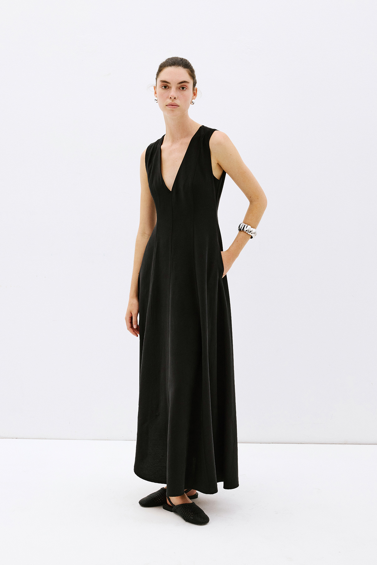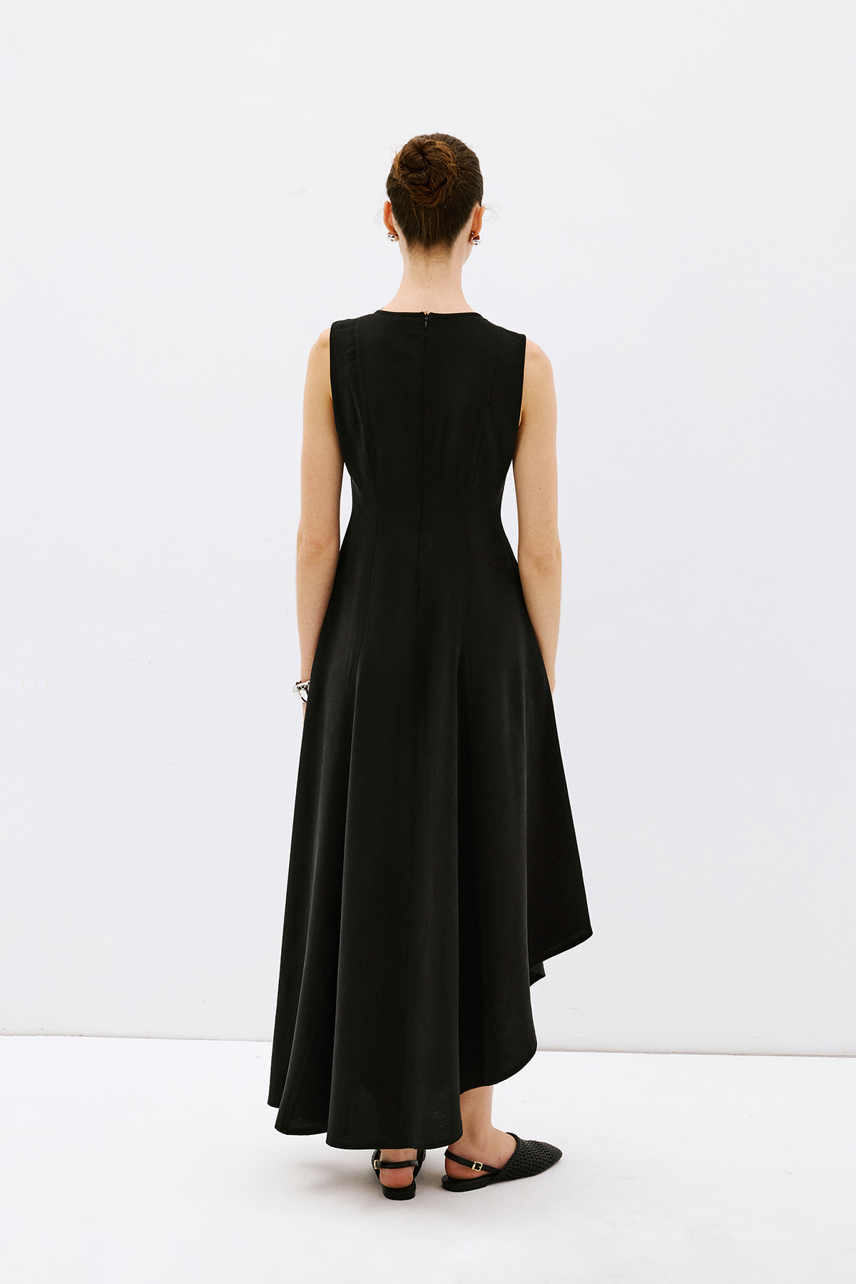 V yaka, asimetrik kesim, çift cepli, arkadan gizli fermuar kapamalı, midi boy elbise.