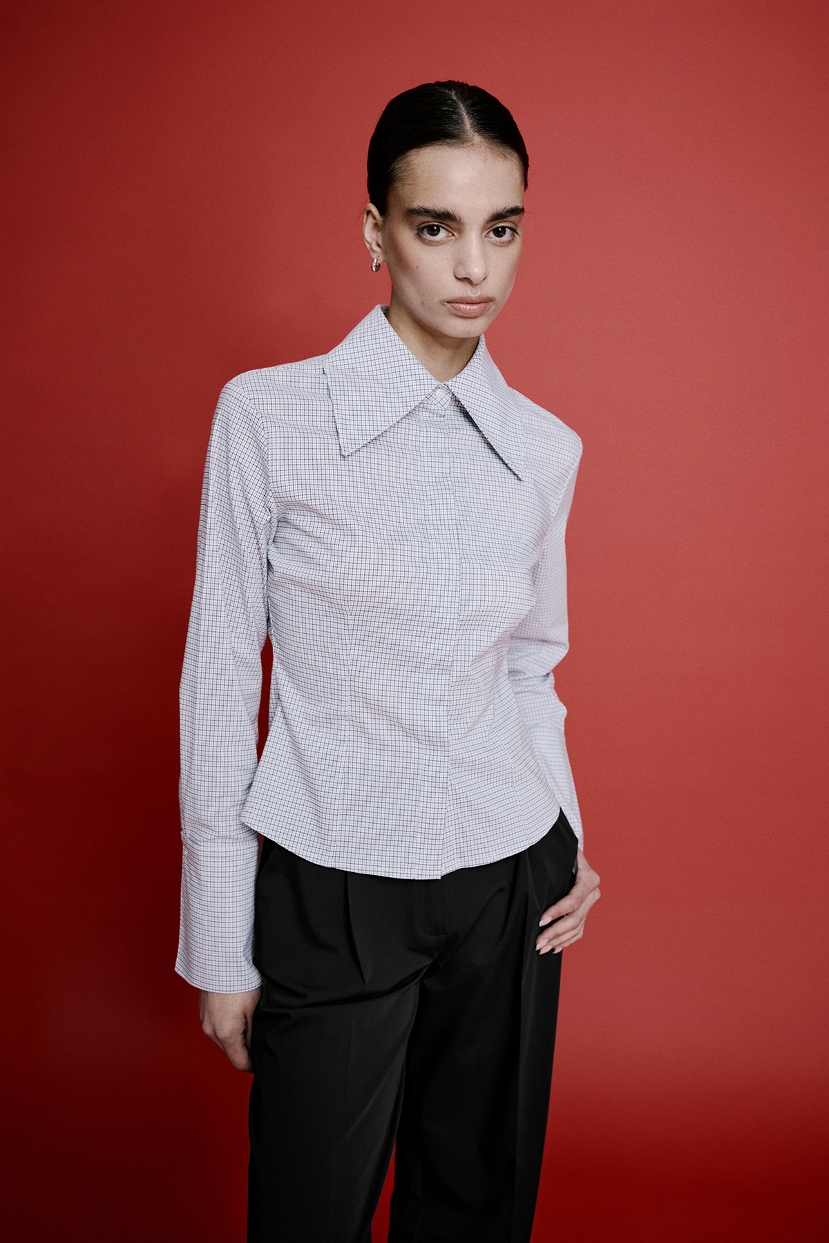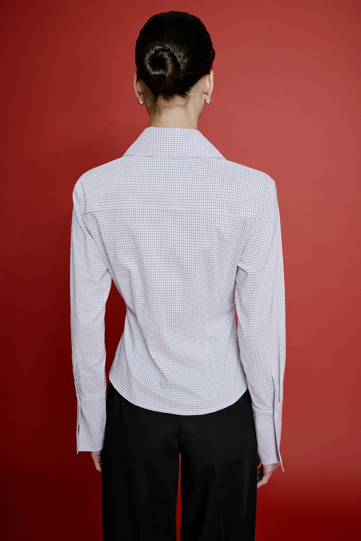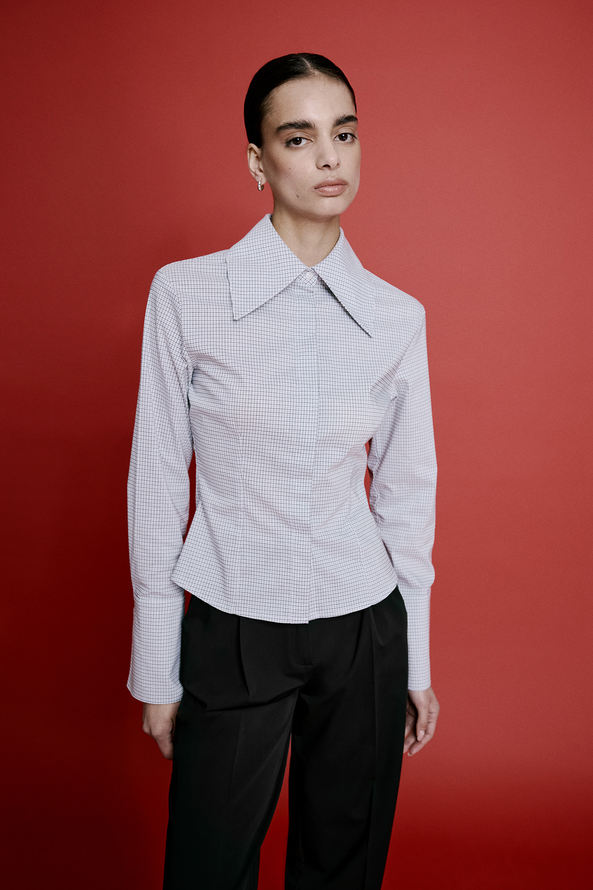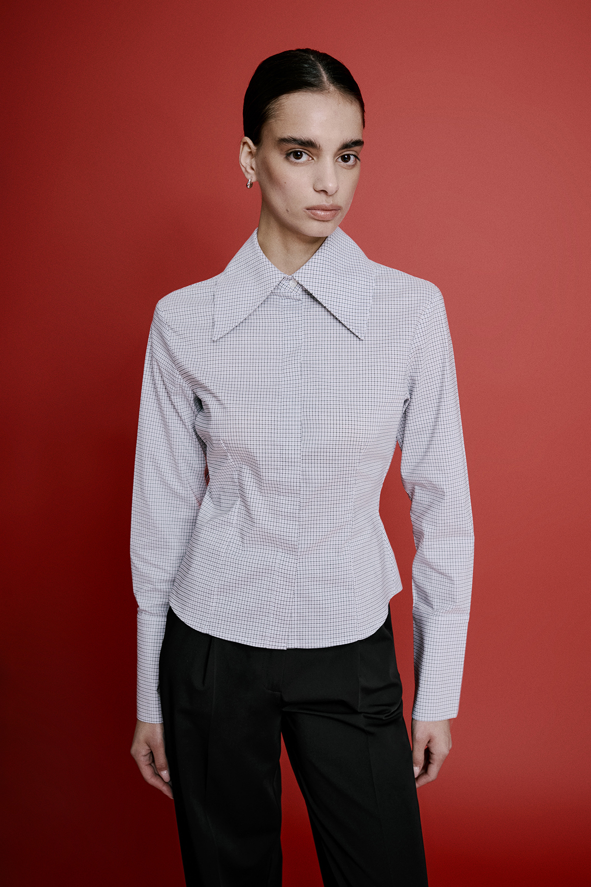 Geniş yakalı, kalın manşet detaylı, gizli pat düğme kapamalı, vücuda oturan gömlek.