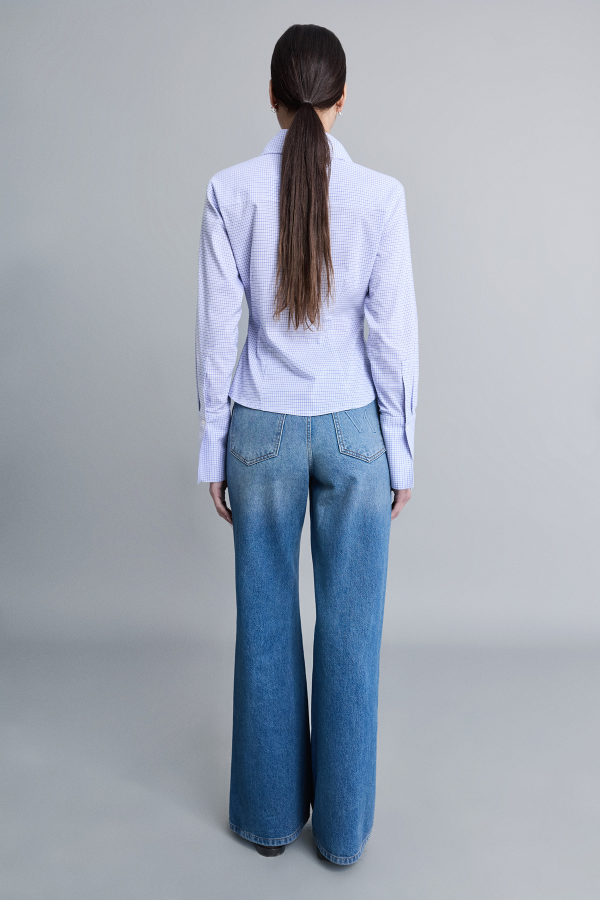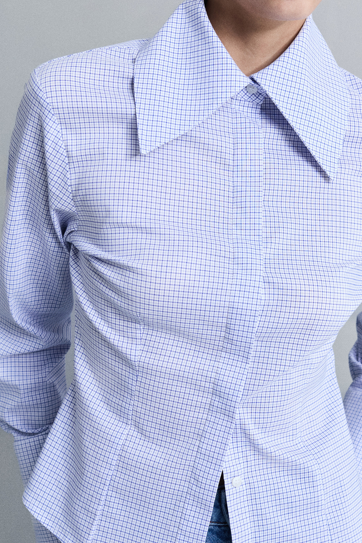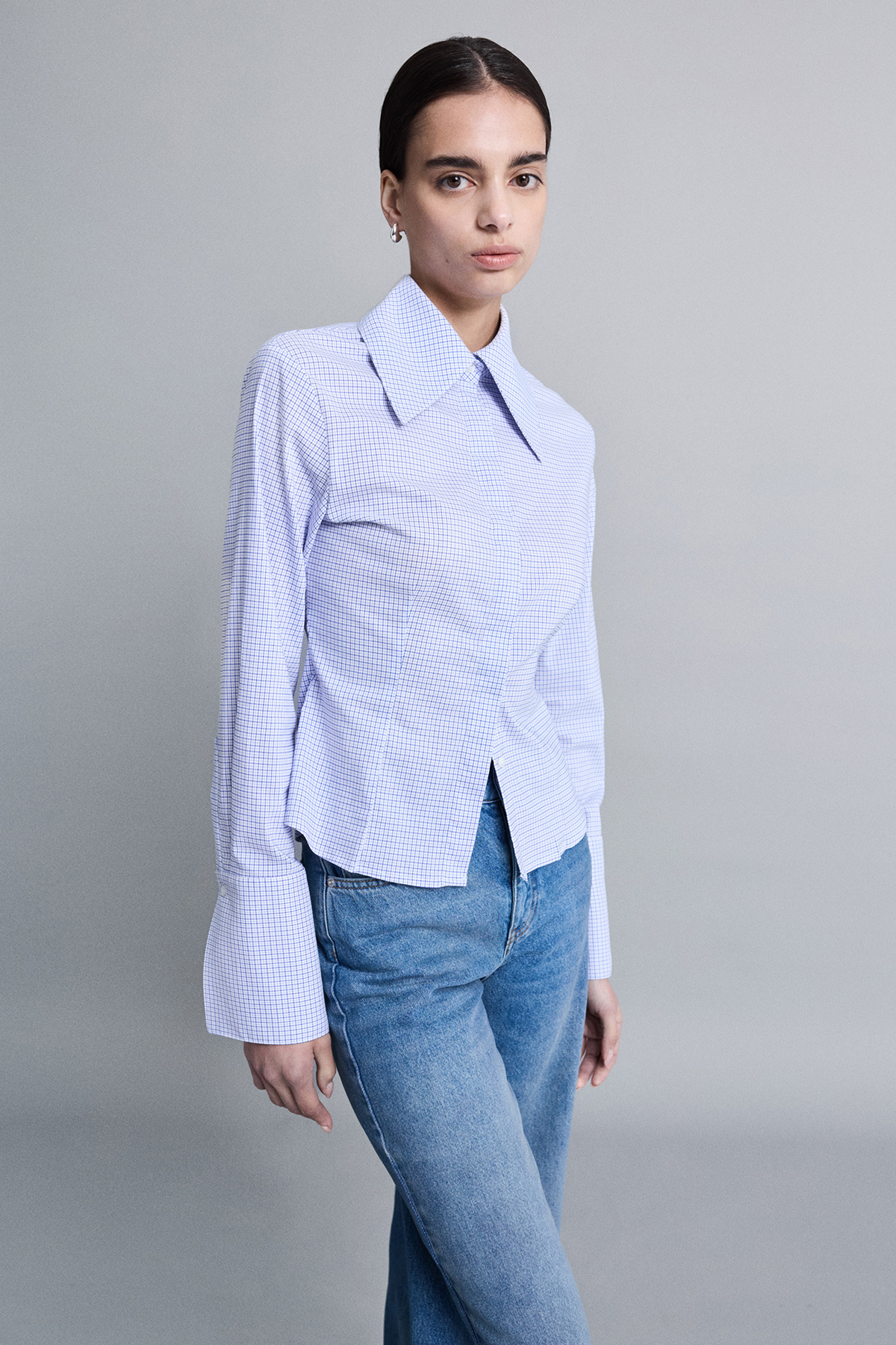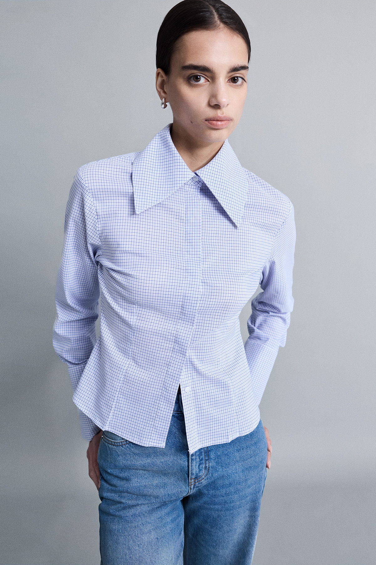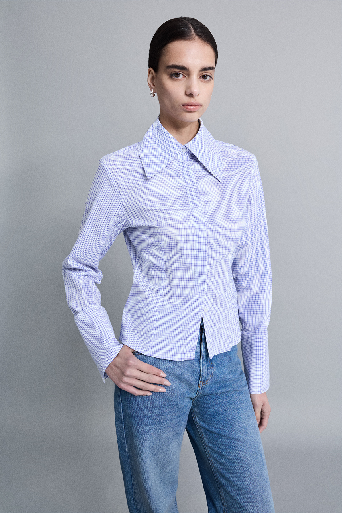 Geniş yakalı, kalın manşet detaylı, gizli pat düğme kapamalı, vücuda oturan gömlek.