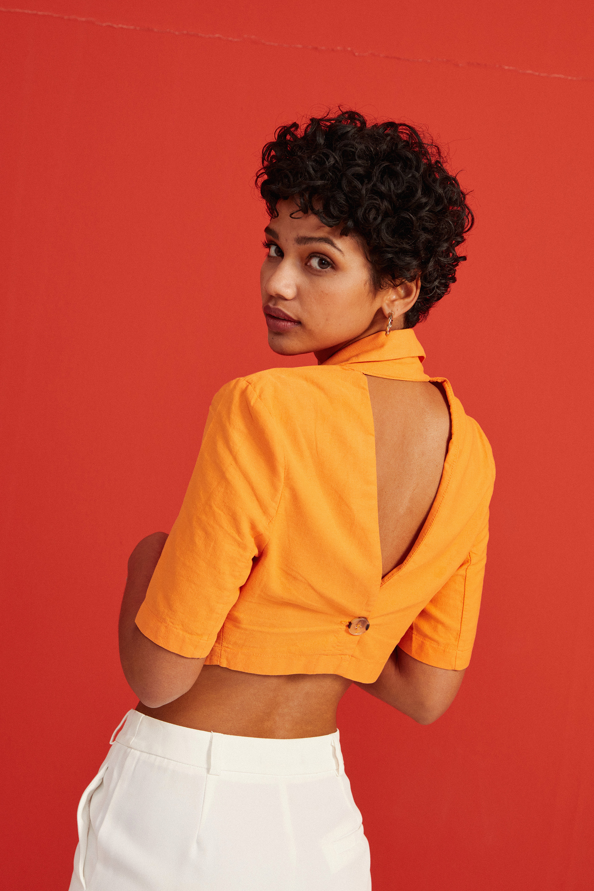 Sırt dekolteli keten crop ceket turuncu