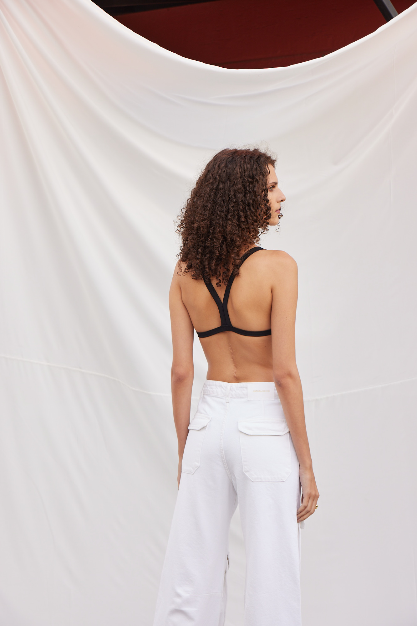 Yuvarlak yaka, askılı, sırt dekolteli kadın bralet.