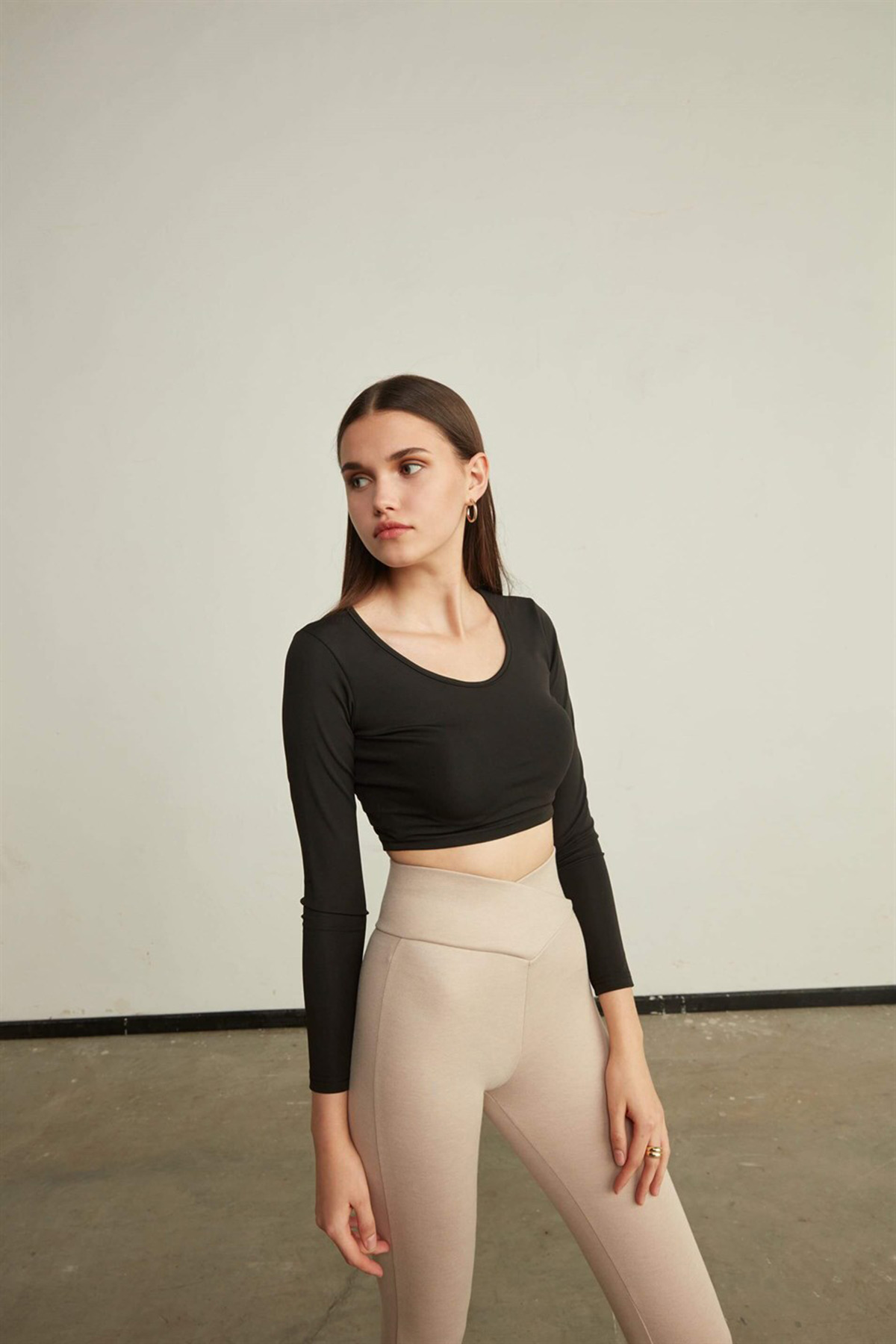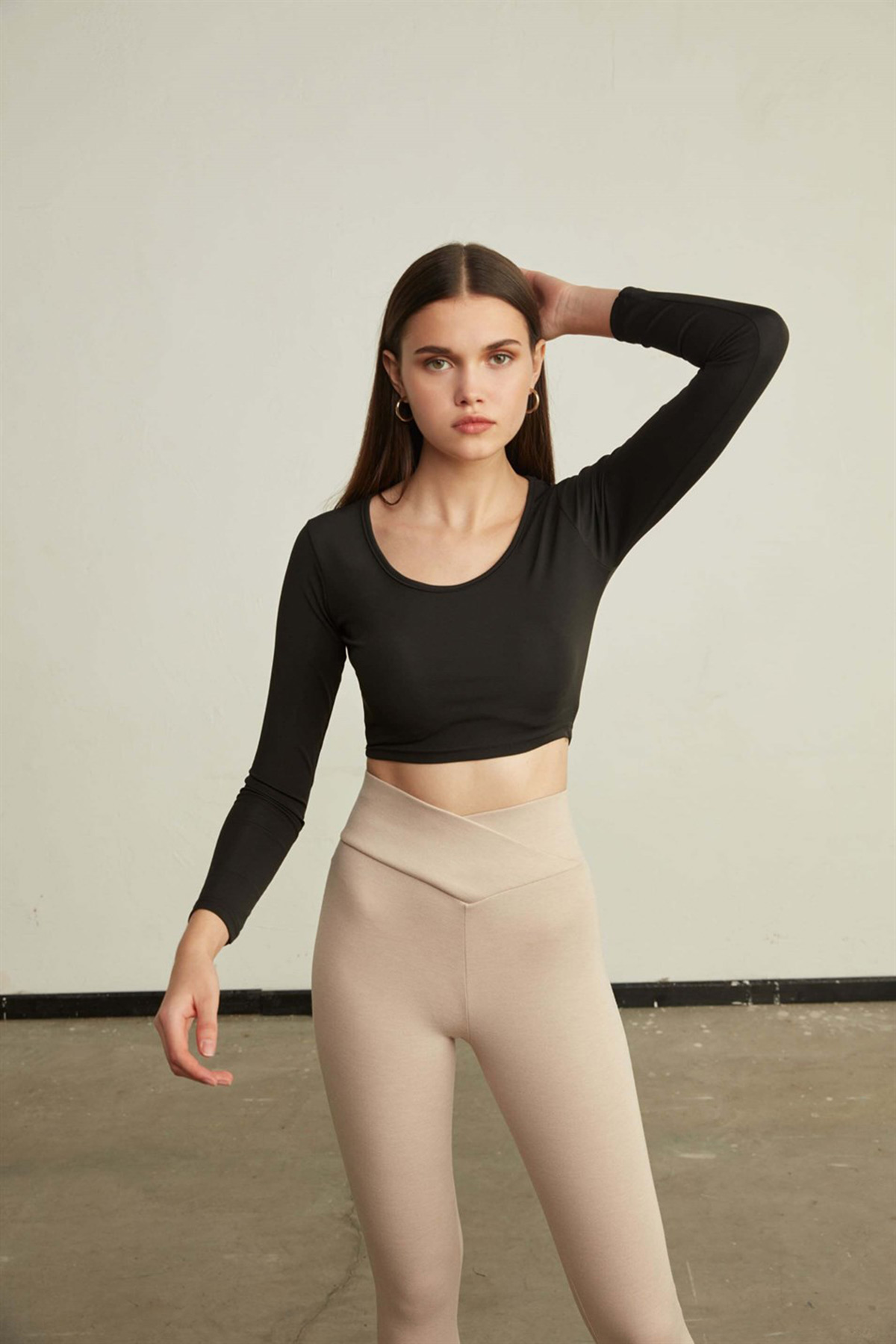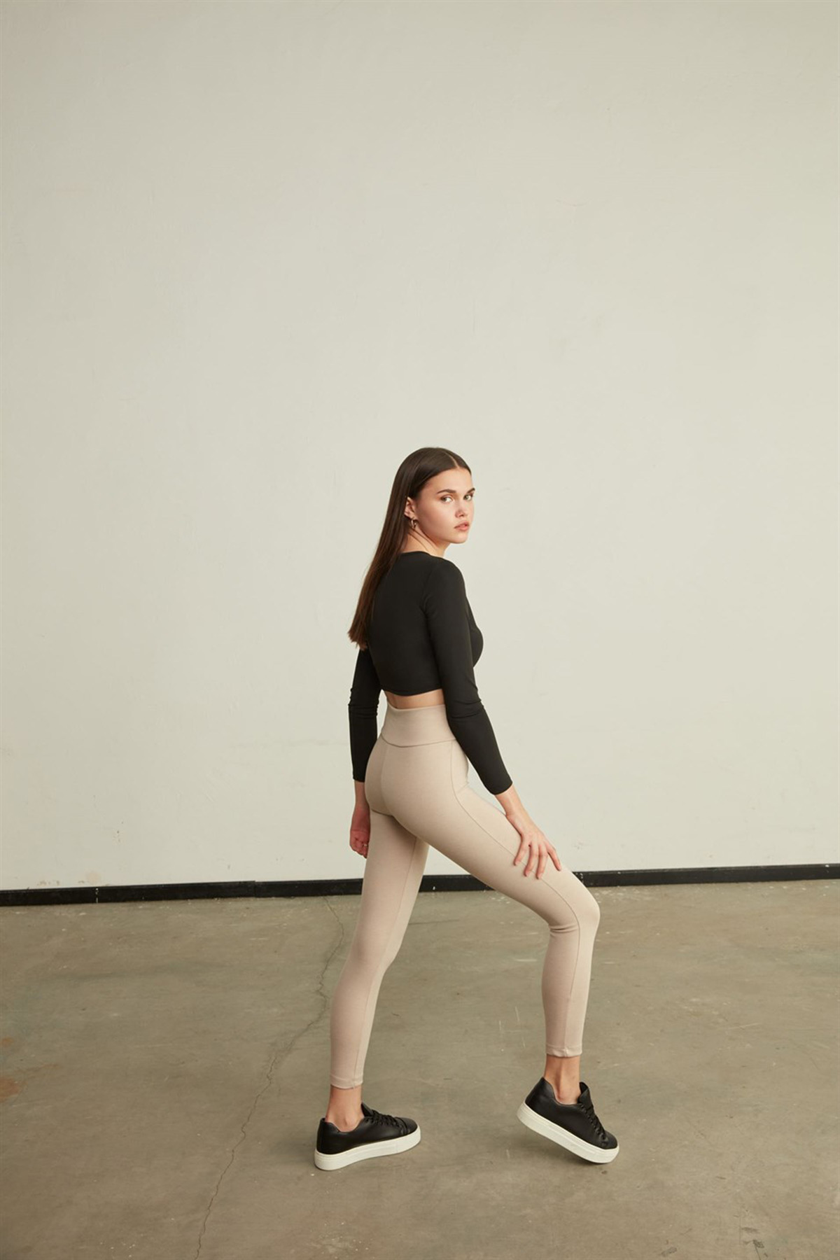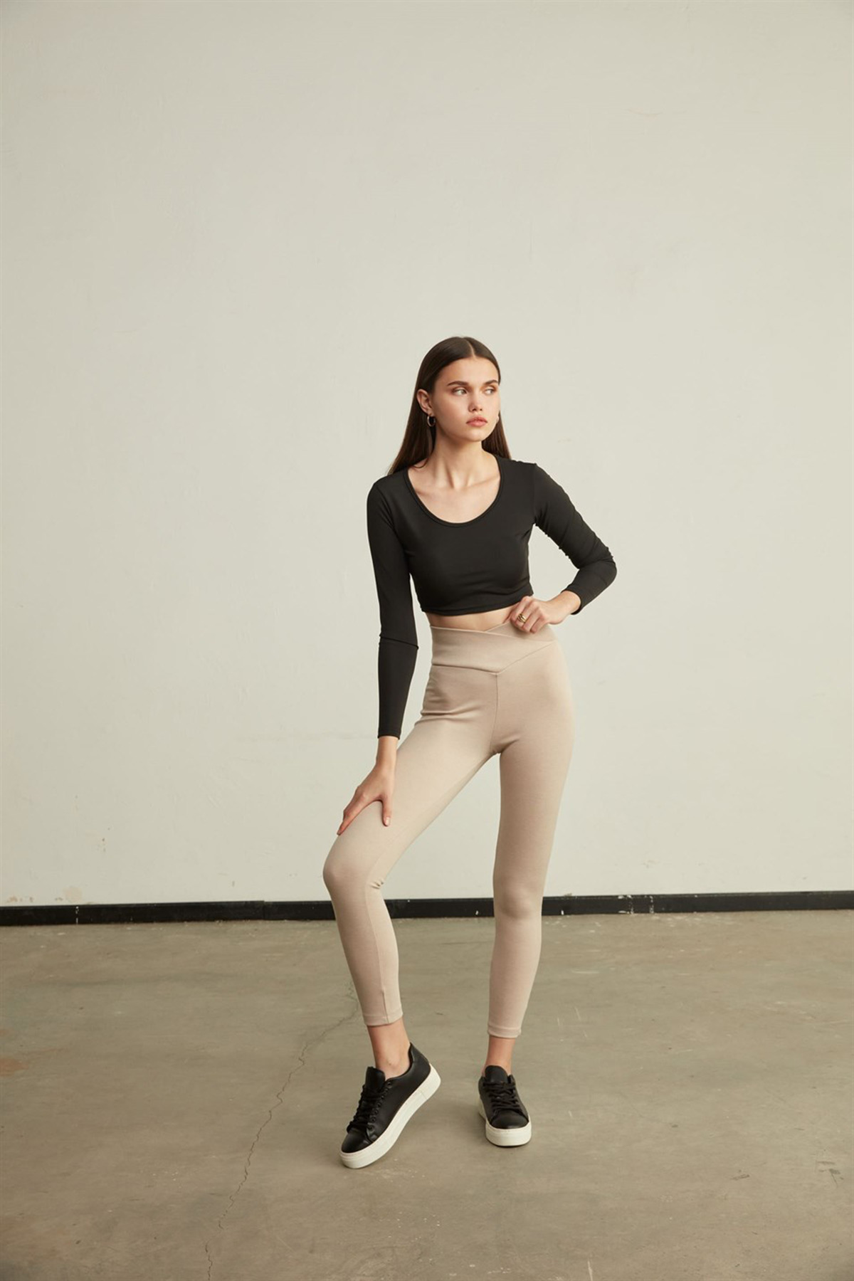 Beli çapraz kemerli, kalın lastikli yüksek bel, toparlayıcı özellikli kadın tayt.