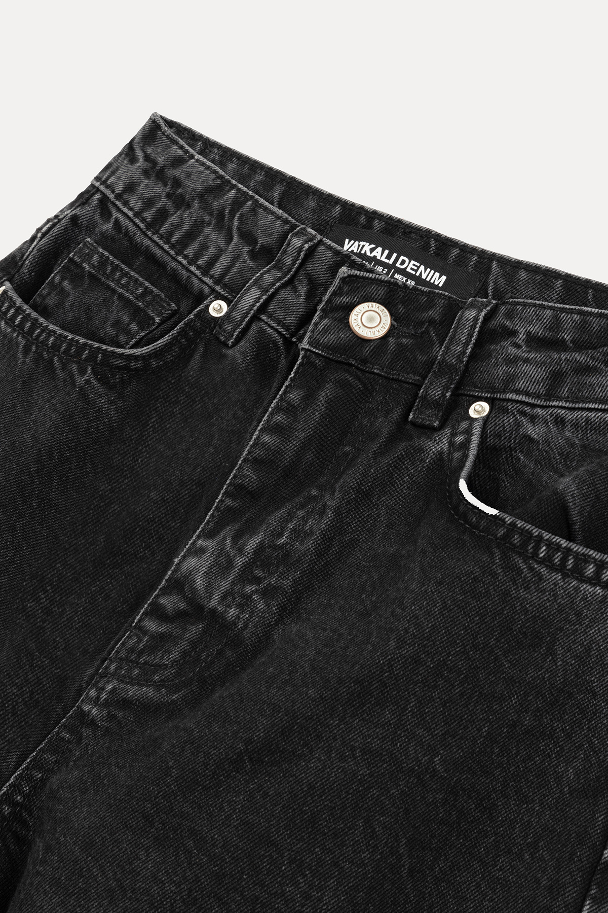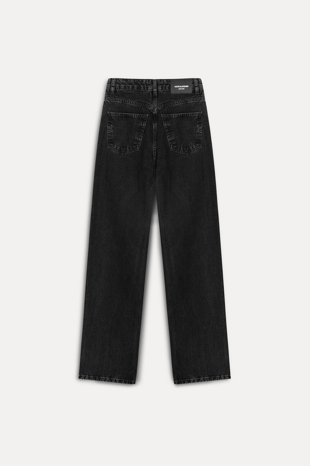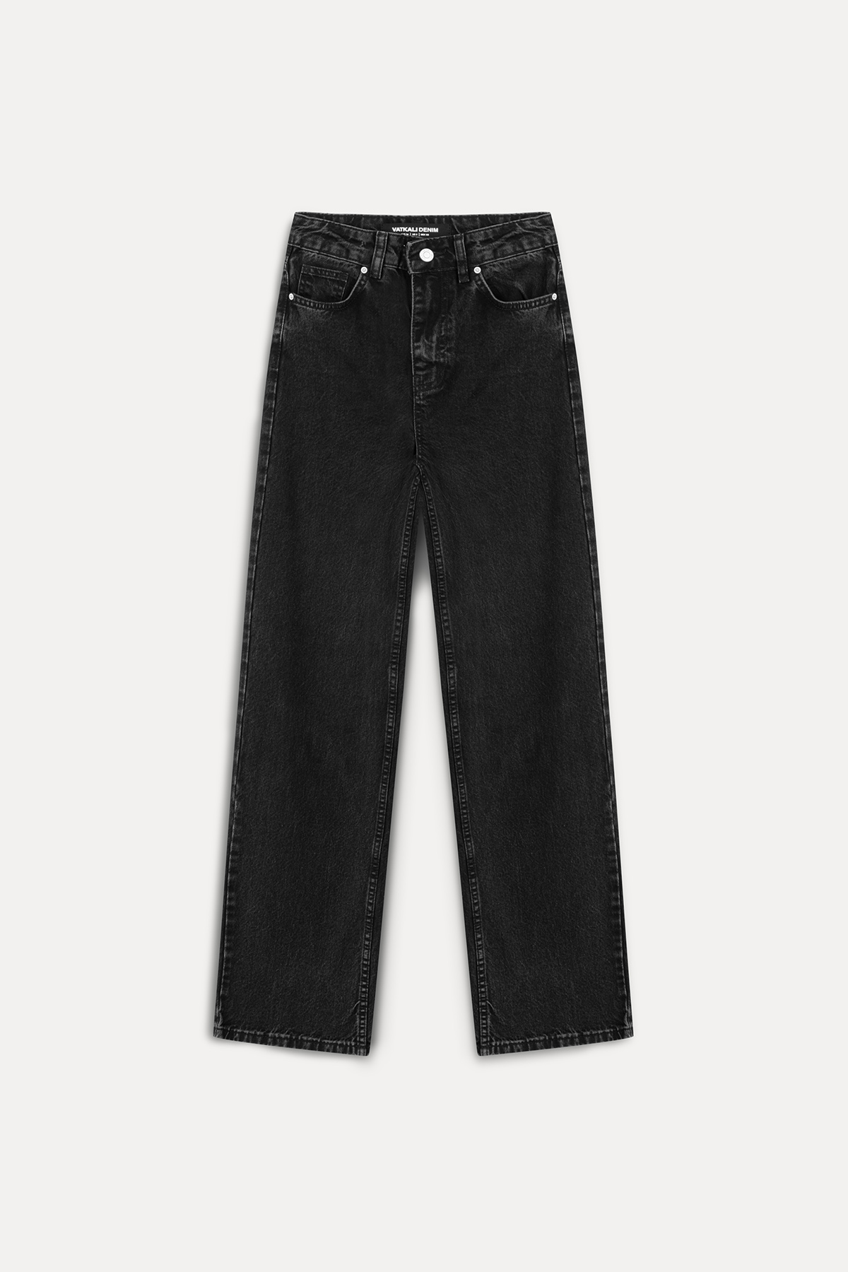 Yüksek bel, düğmeli ve fermuarlı, bol paça, 5 cepli, tam kalıp jean.