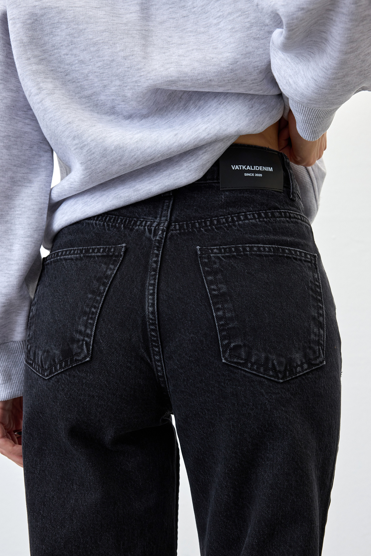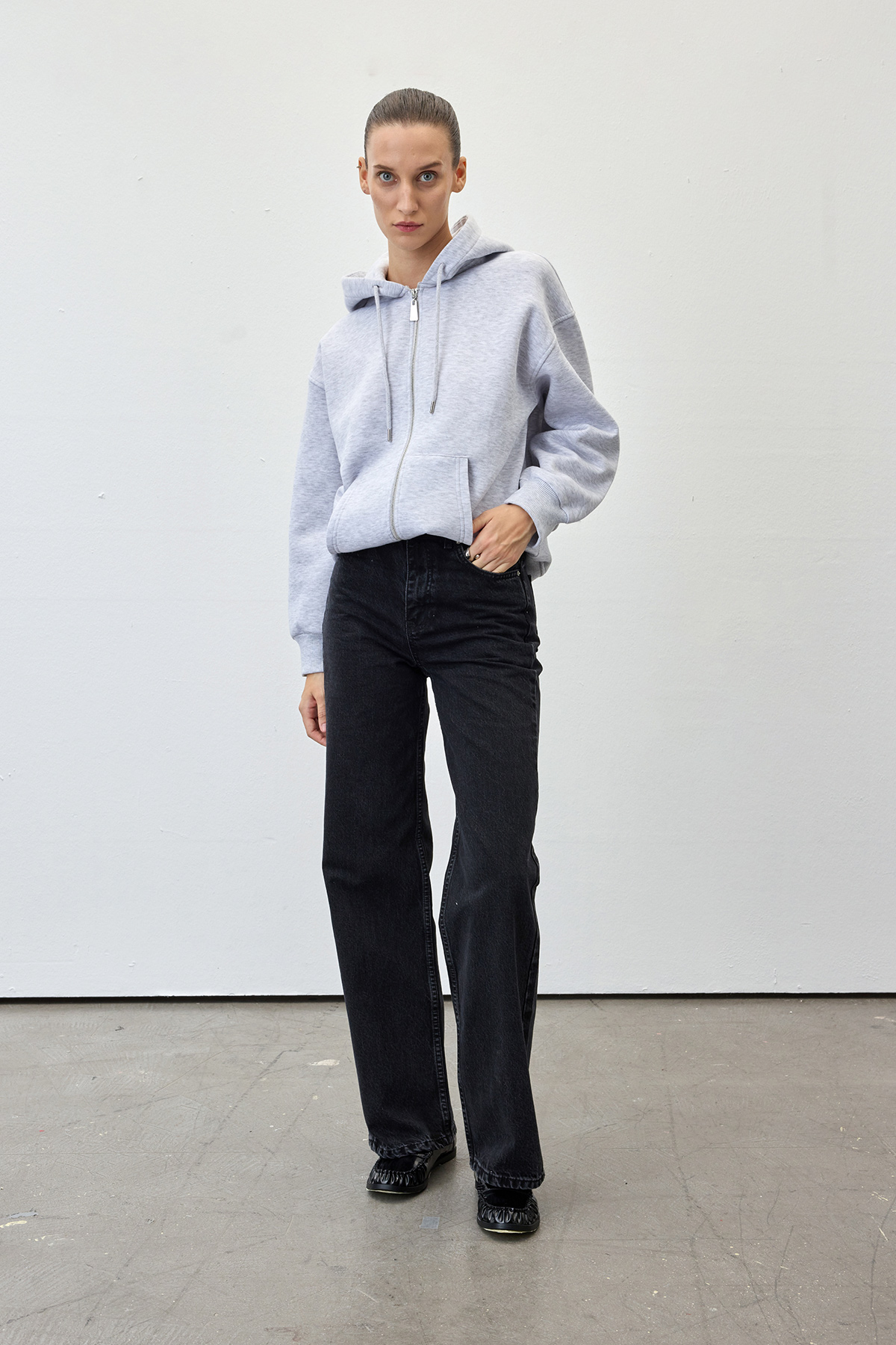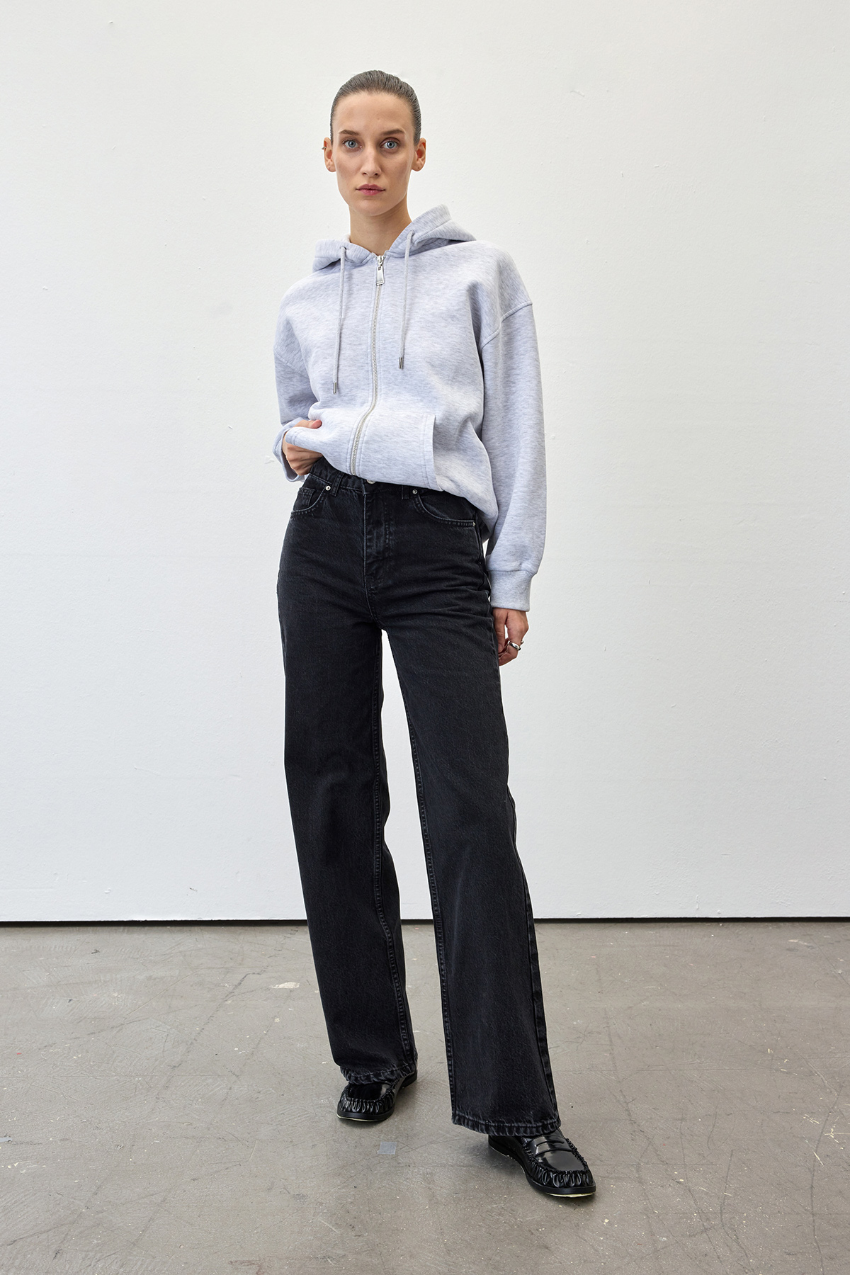 Yüksek bel, düğmeli ve fermuarlı, bol paça, 5 cepli, tam kalıp jean.
