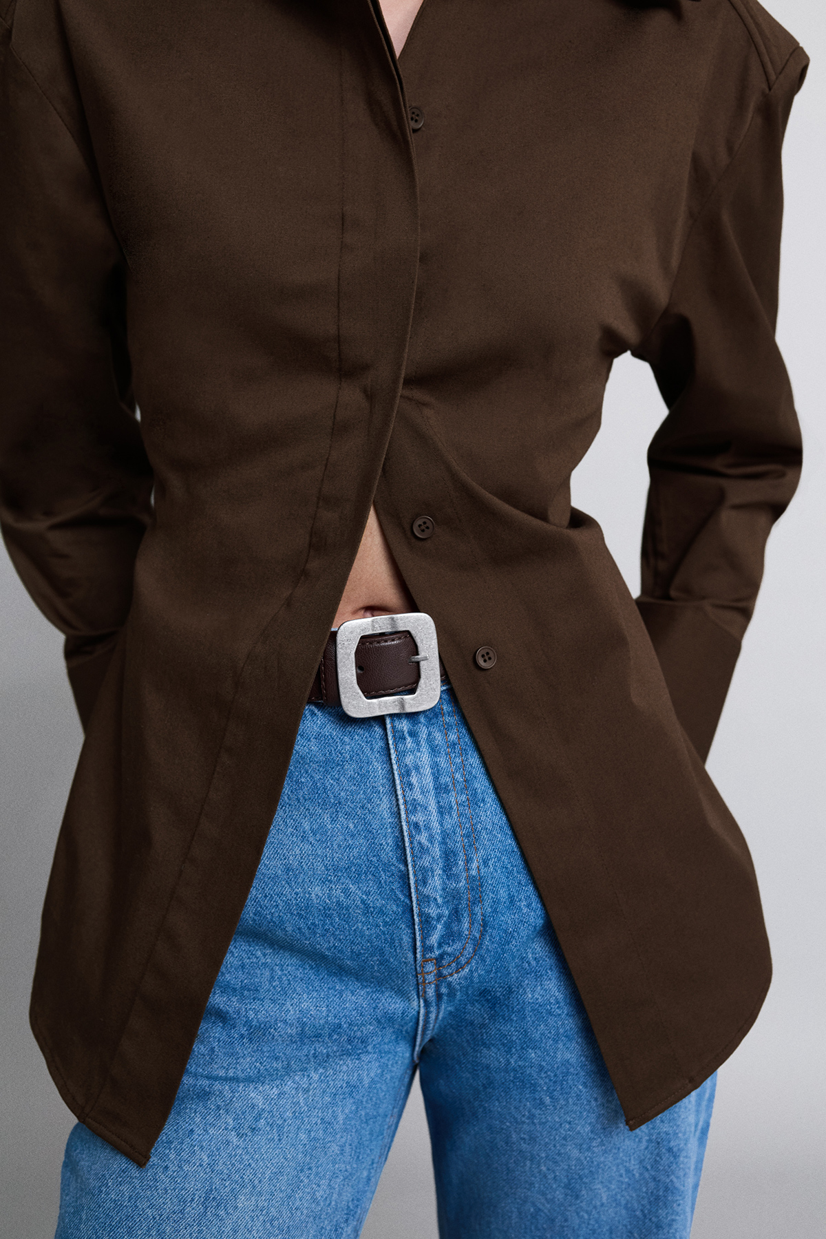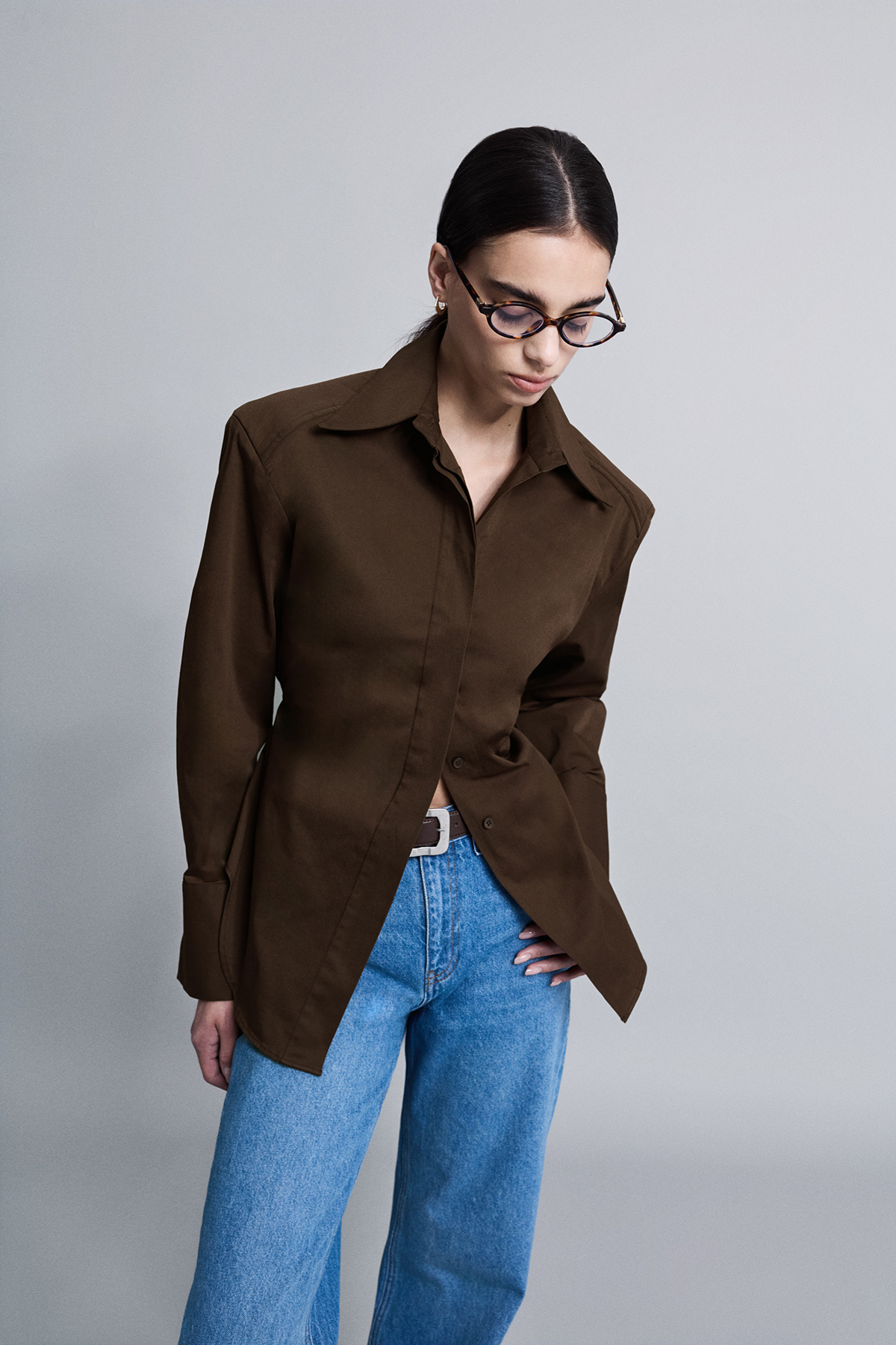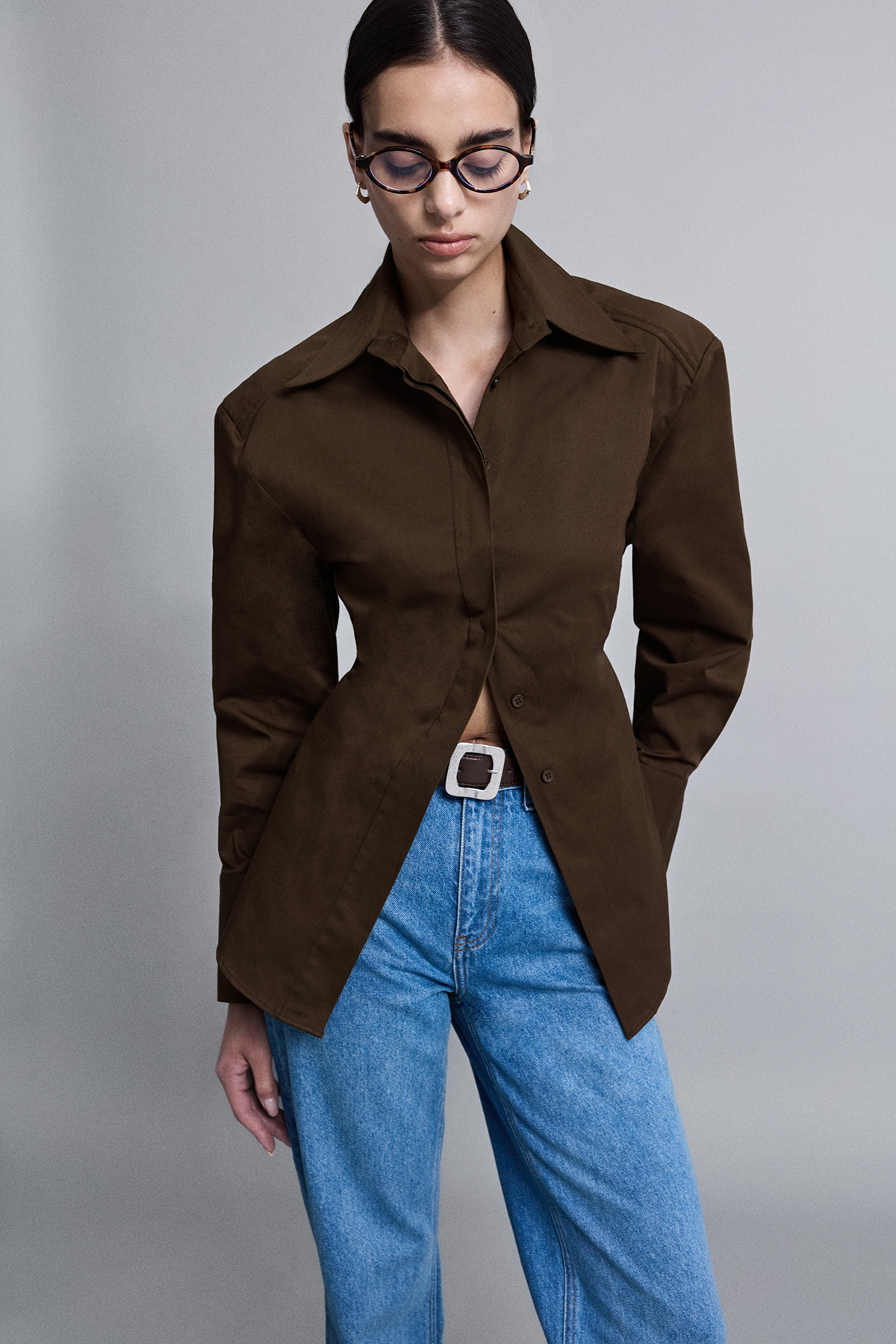 Strong Shoulder Vücuda Oturan Gömlek, belirgin omuz formu ve fitted kesimiyle silueti güçlü ve net gösterir. Omuz hattındaki yapı üst bedene karakter kazandırırken, vücuda oturan kalıbı daha keskin ve iddialı bir görünüm yaratır. Ofis stilinden gece kombinlerine kadar kolayca uyarlanabilen bu strong shoulder gömlek, sade parçalarla bile etkisini hissettiren modern bir gardırop yatırımıdır.