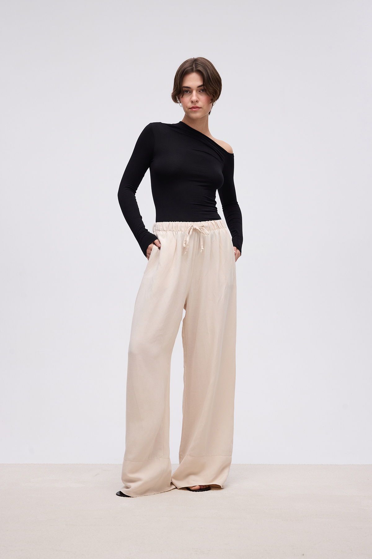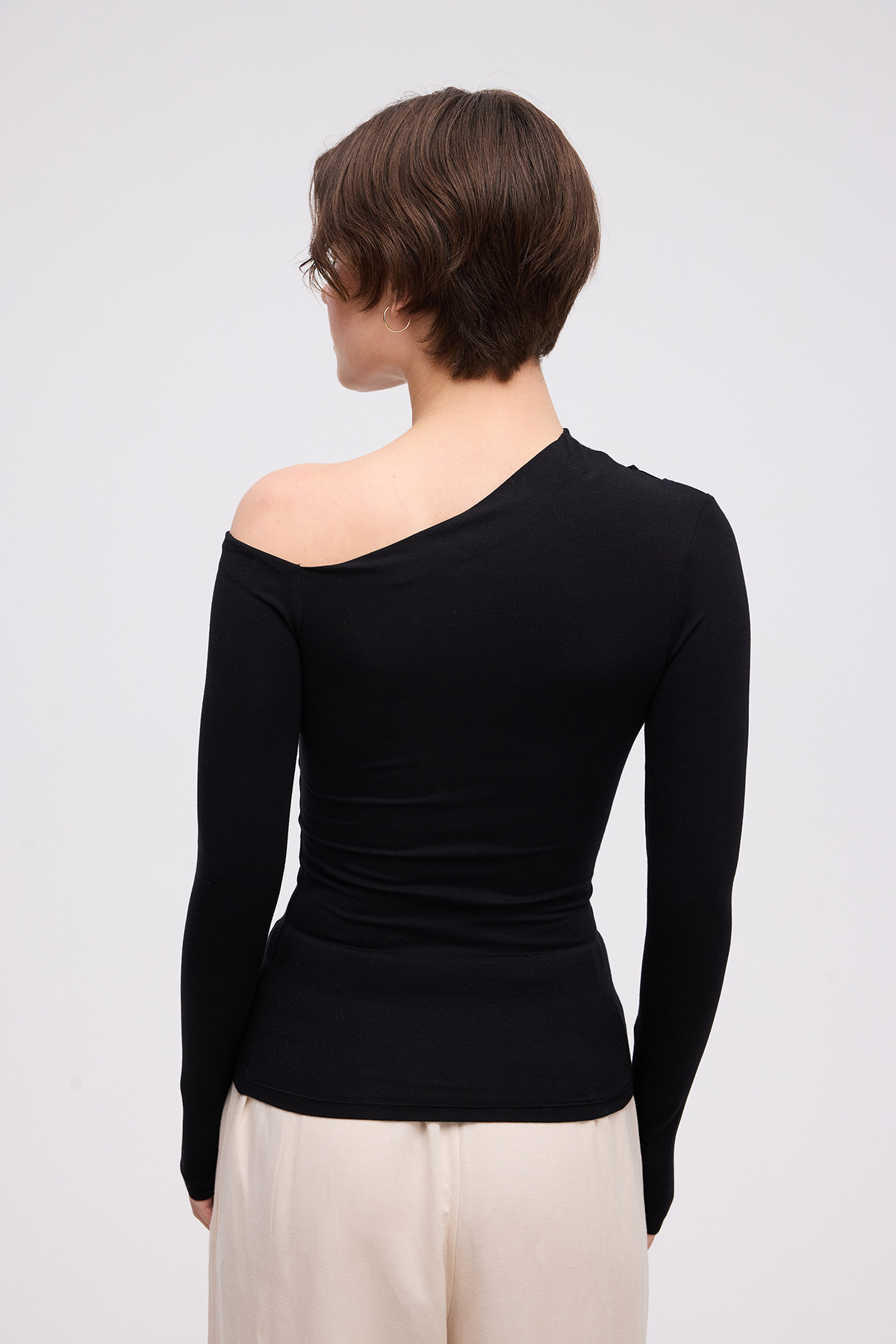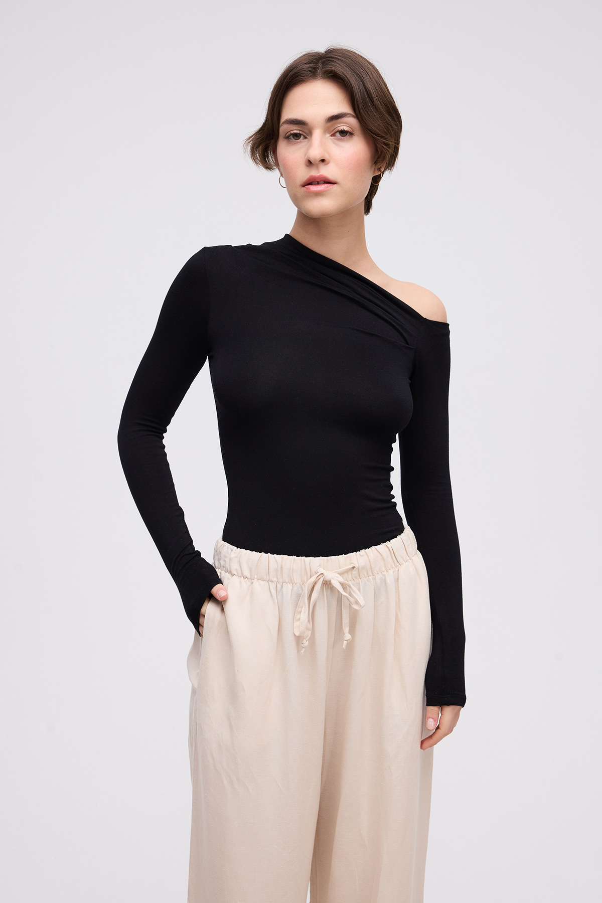 Asimetrik yaka, esnek,tam kalıp, uzun kollu asimetrik top